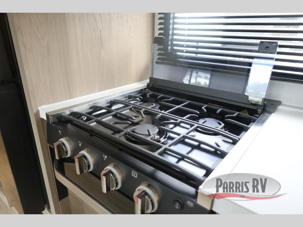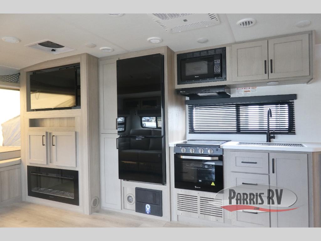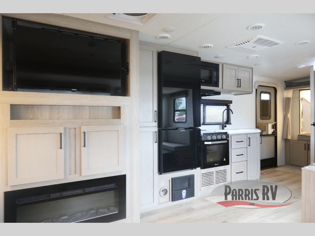 This expandable includes a large slide out that will make you feel right at home, so come take a look! The LED TV and fireplace is right across from the hide-a-bed sofa for easy viewing, and there is a booth dinette to dine together. The chef of the family can cook indoors on the three burner cooktop, or outdoors on the exterior griddle. Tuck your belongings in the overhead shelves, and snacks can go in the pantry. Don't forget about the exterior storage for your larger camp gear!