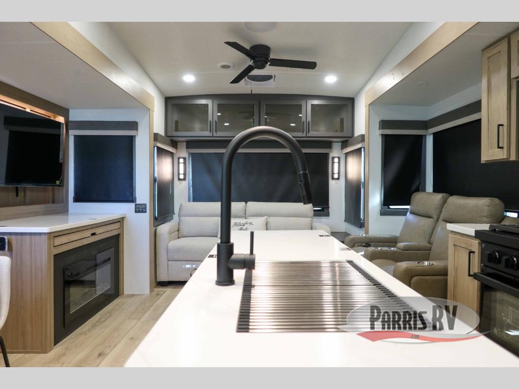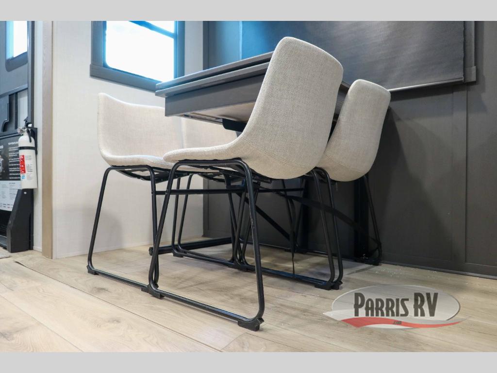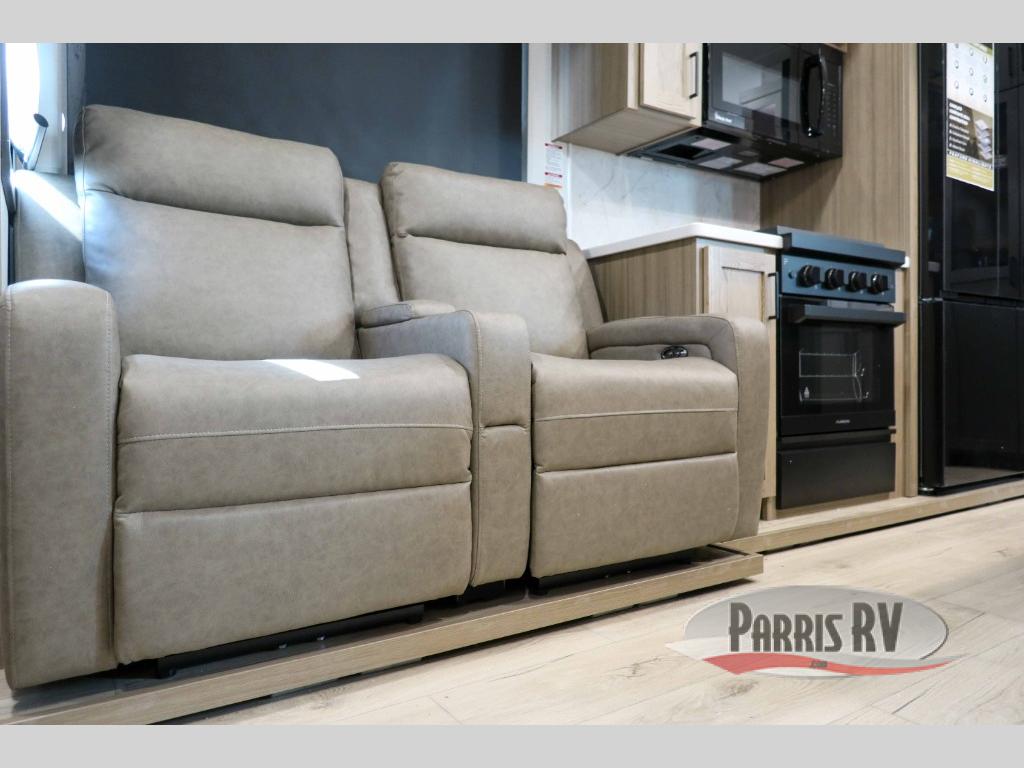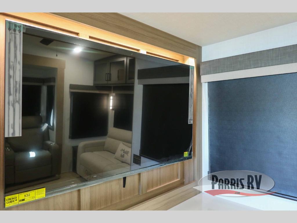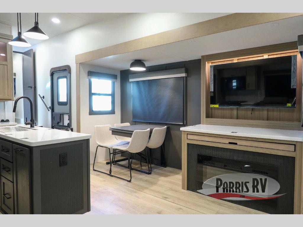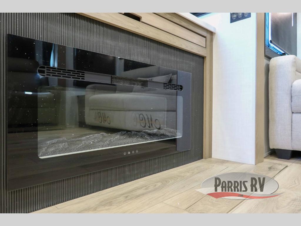 You can enjoy views from inside or outside each day once this RV is set up at the campgrounds! The large windows in the furniture slide and the windows throughout allow you to take in the scenery, and the dual opposing slides give you a spacious main living and kitchen area. You will find lots of seating for guests on the hide-a-bed sofa in the rear, and on the theater seats and table in the slide. The cook will love the 12V refrigerator and large pantry to store food, and everyone can enjoy the Smart TV and fireplace when visiting and relaxing. This unit also includes a pull-out desk which will be perfect if you plan to telecommute. And don't overlook the front private bedroom with its queen bed, wardrobe, and TV option!