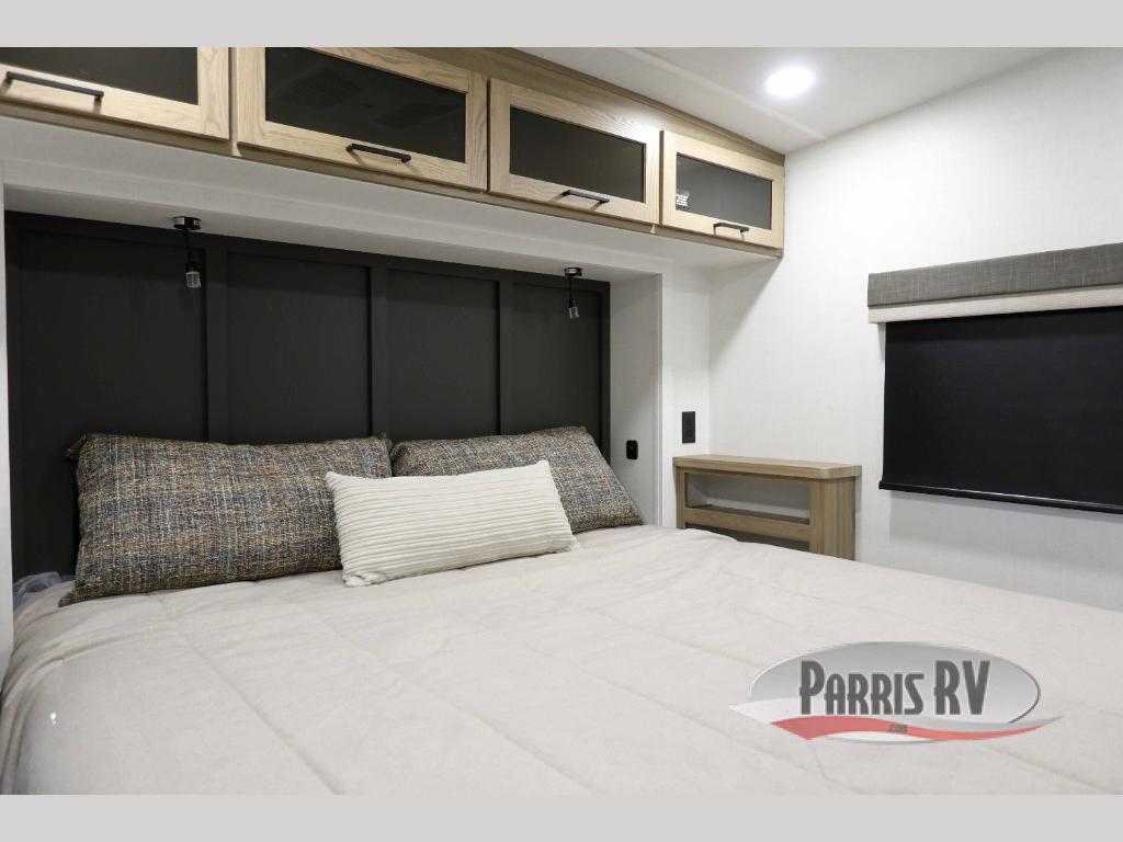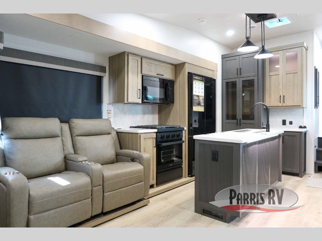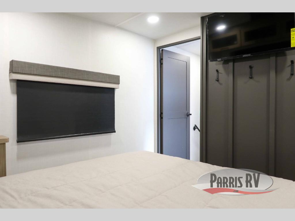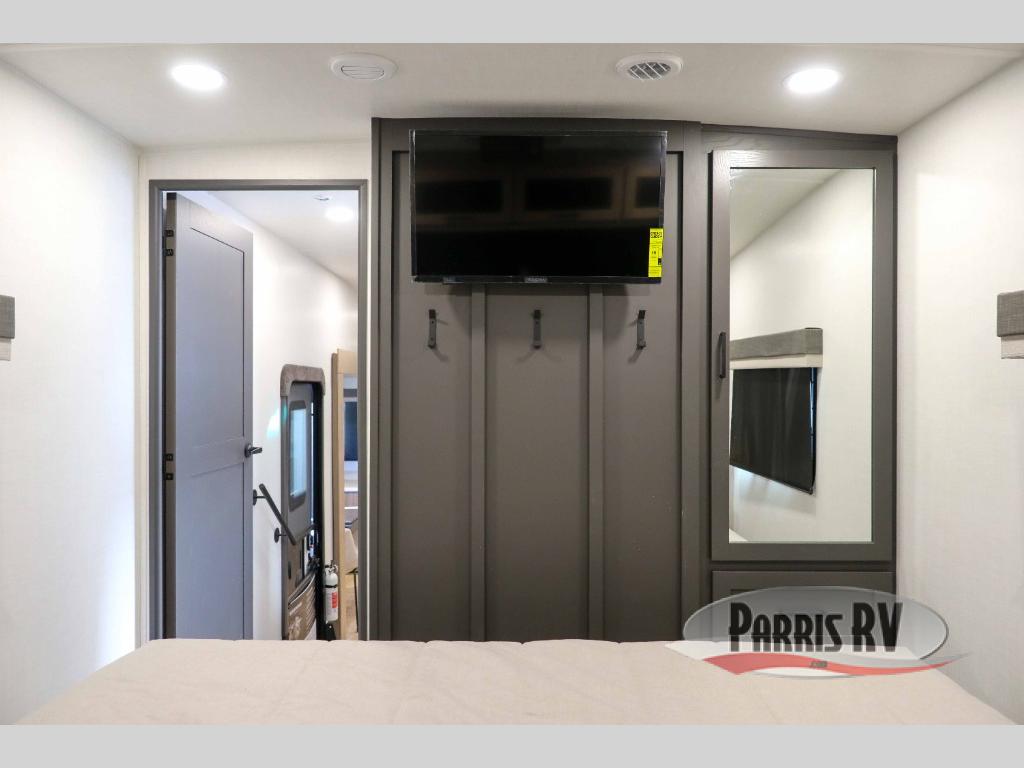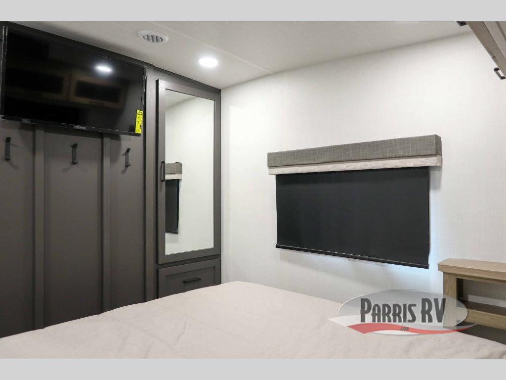 You can enjoy views from inside or outside each day once this RV is set up at the campgrounds! The large windows in the furniture slide and the windows throughout allow you to take in the scenery, and the dual opposing slides give you a spacious main living and kitchen area. You will find lots of seating for guests on the hide-a-bed sofa in the rear, and on the theater seats and table in the slide. The cook will love the 12V refrigerator and large pantry to store food, and everyone can enjoy the Smart TV and fireplace when visiting and relaxing. This unit also includes a pull-out desk which will be perfect if you plan to telecommute. And don't overlook the front private bedroom with its queen bed, wardrobe, and TV option!