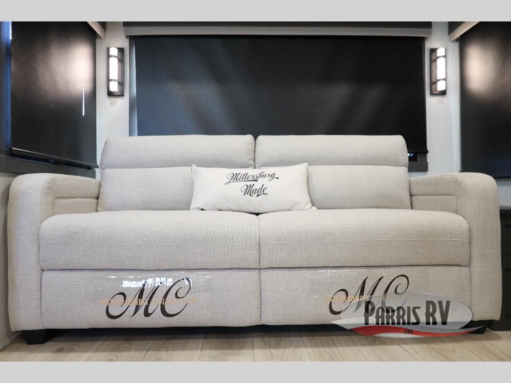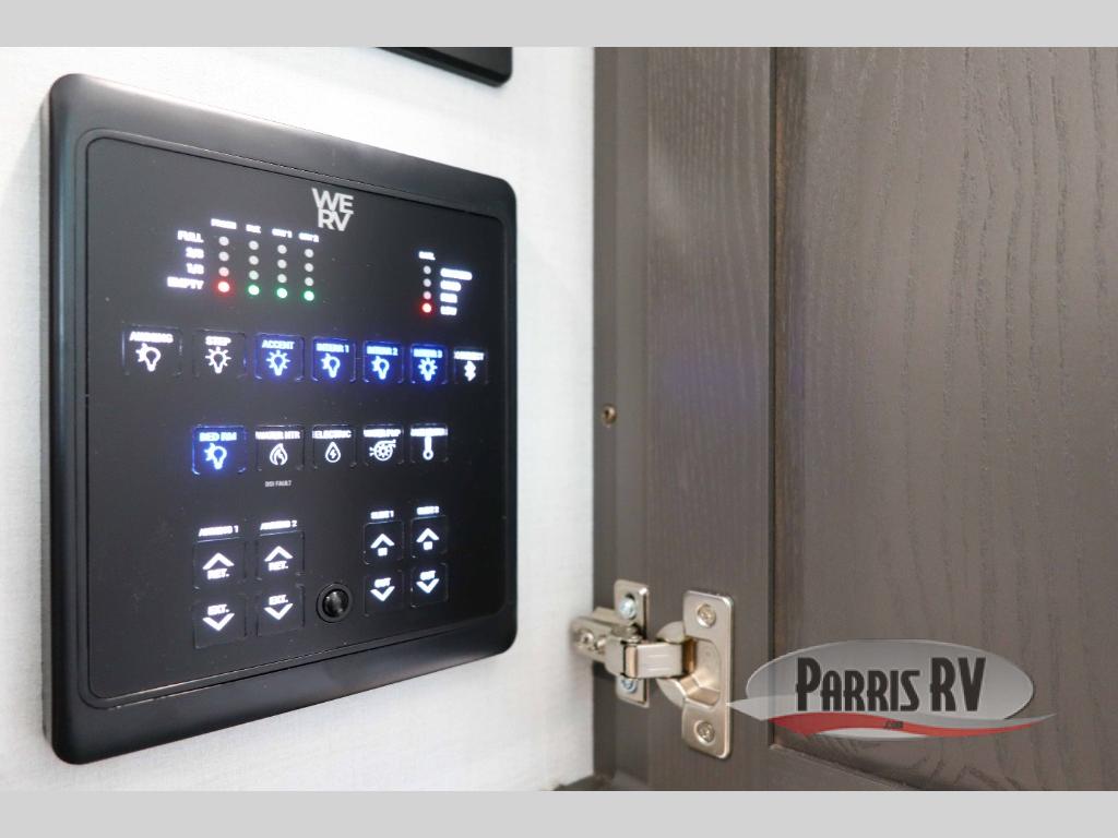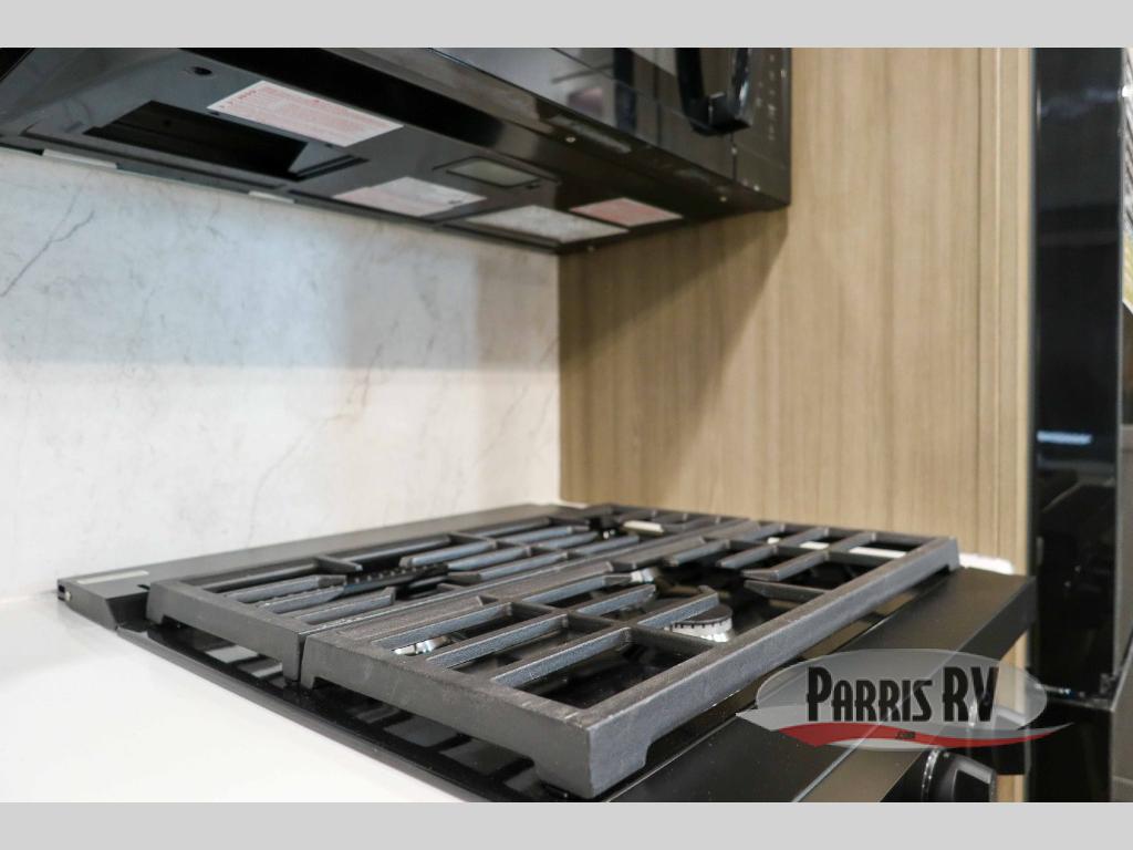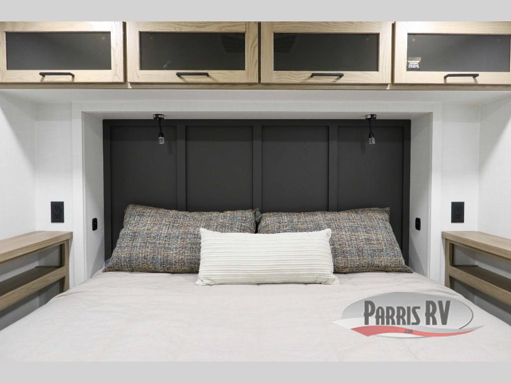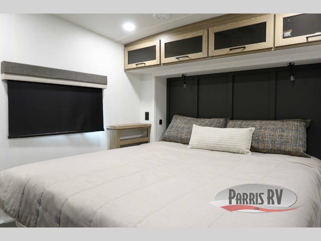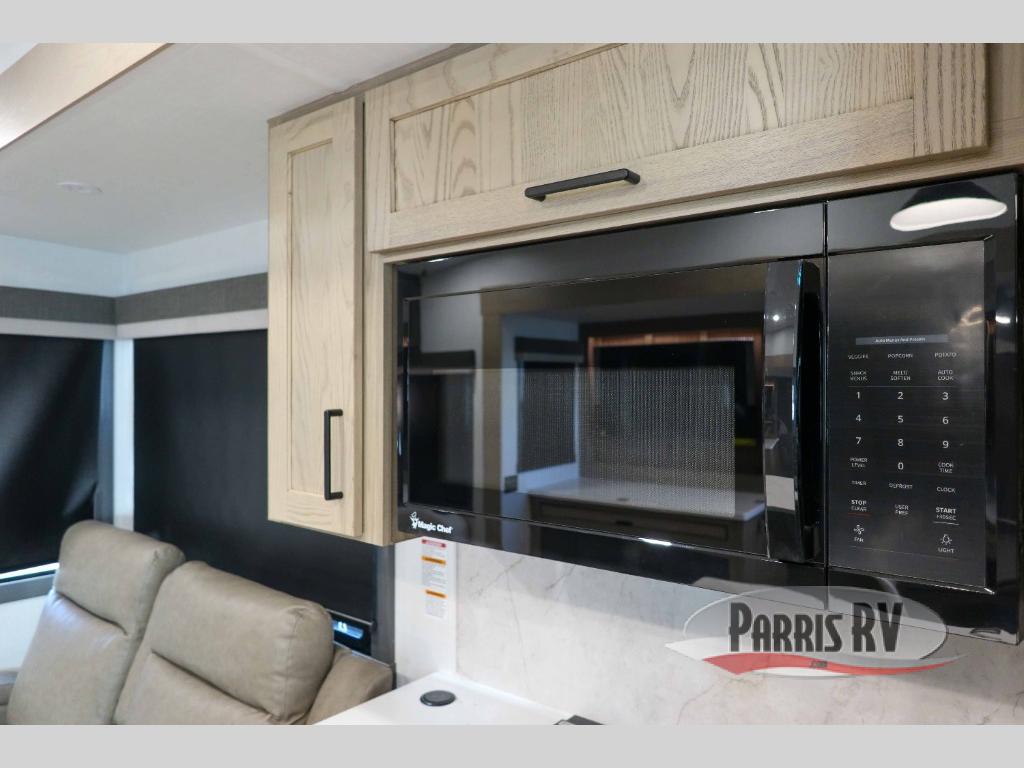 You can enjoy views from inside or outside each day once this RV is set up at the campgrounds! The large windows in the furniture slide and the windows throughout allow you to take in the scenery, and the dual opposing slides give you a spacious main living and kitchen area. You will find lots of seating for guests on the hide-a-bed sofa in the rear, and on the theater seats and table in the slide. The cook will love the 12V refrigerator and large pantry to store food, and everyone can enjoy the Smart TV and fireplace when visiting and relaxing. This unit also includes a pull-out desk which will be perfect if you plan to telecommute. And don't overlook the front private bedroom with its queen bed, wardrobe, and TV option!