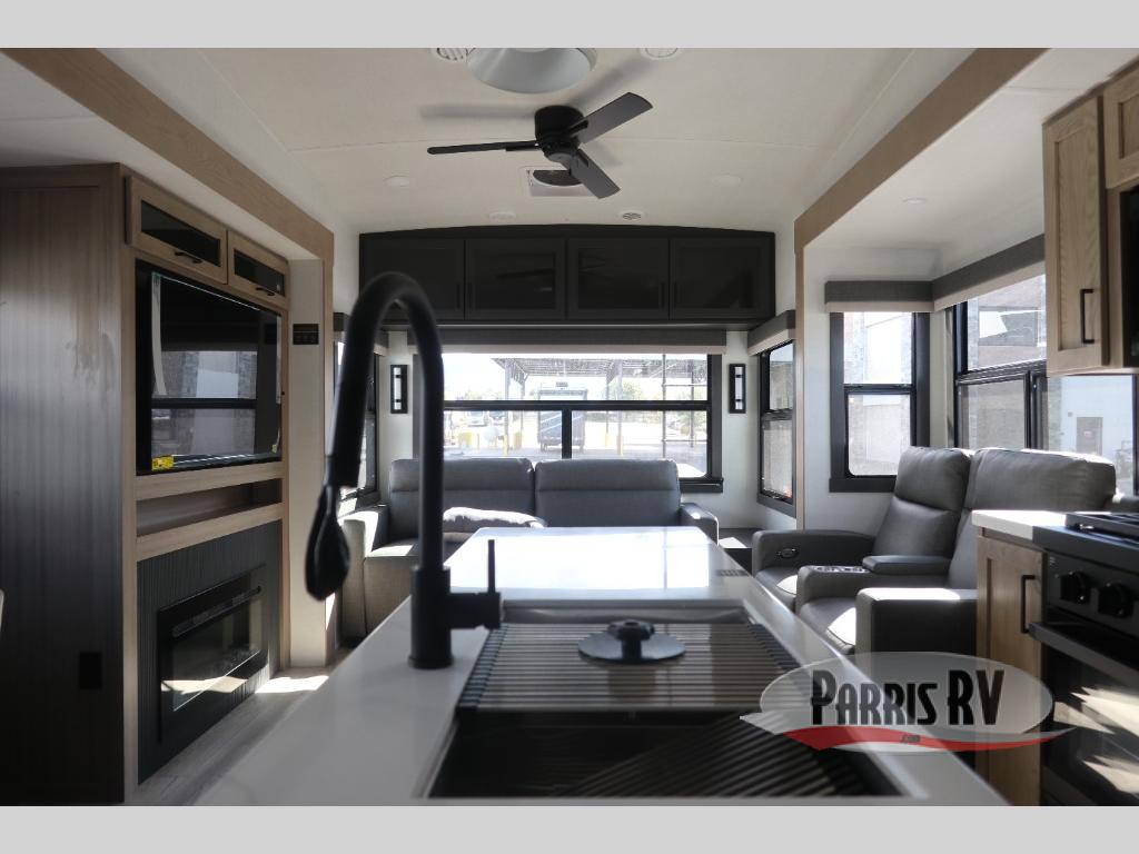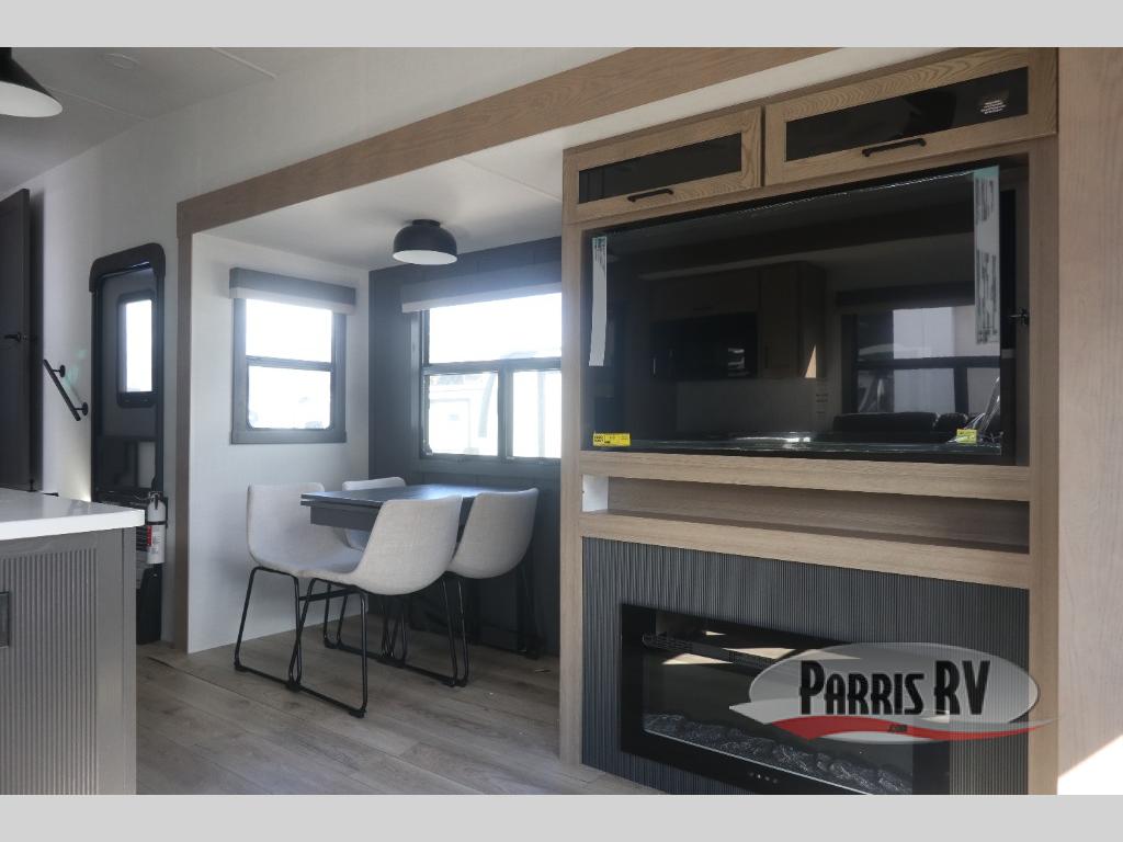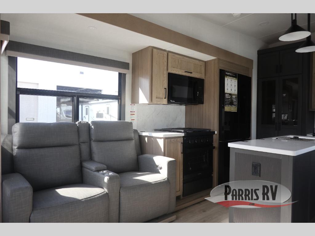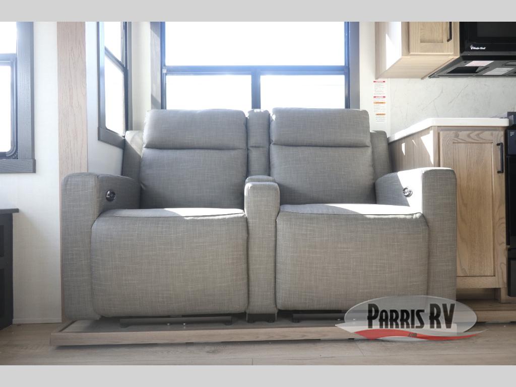 You'll be camping in style each time you take this fifth wheel out to the campground! The dual opposing slides in the main living area create an open floorplan, and the kitchen island here will provide more counter space to prep meals. You will love the theater seat directly across from the entertainment center and fireplace, and additional seating can be found on the hide-a-bed sofa or the dinette with table and chairs. The full bath includes a shower with a seat, plus a Maxxair ventilation fan to keep everything fresh. The front private bedroom may feel more like a resort with its king bed slide out, large wardrobe, plus a dresser to keep your clothes tidy. And did we mention this fifth wheel has two power awnings for maximum protection against the elements, and tons of exterior storage for all your gear!?
