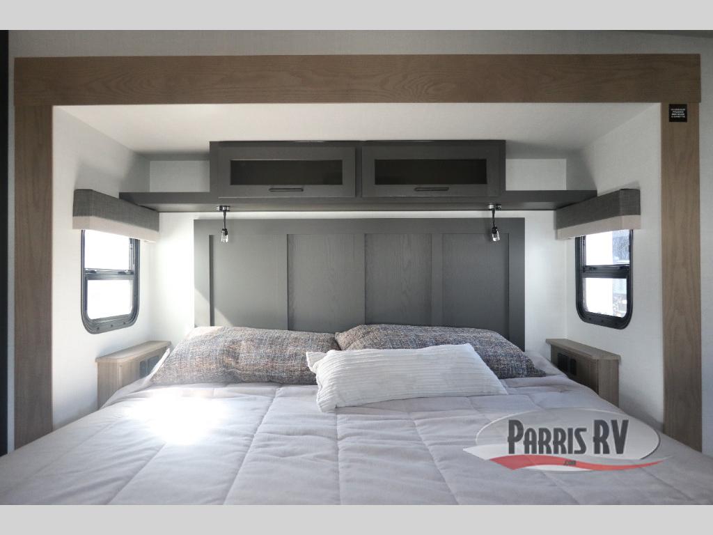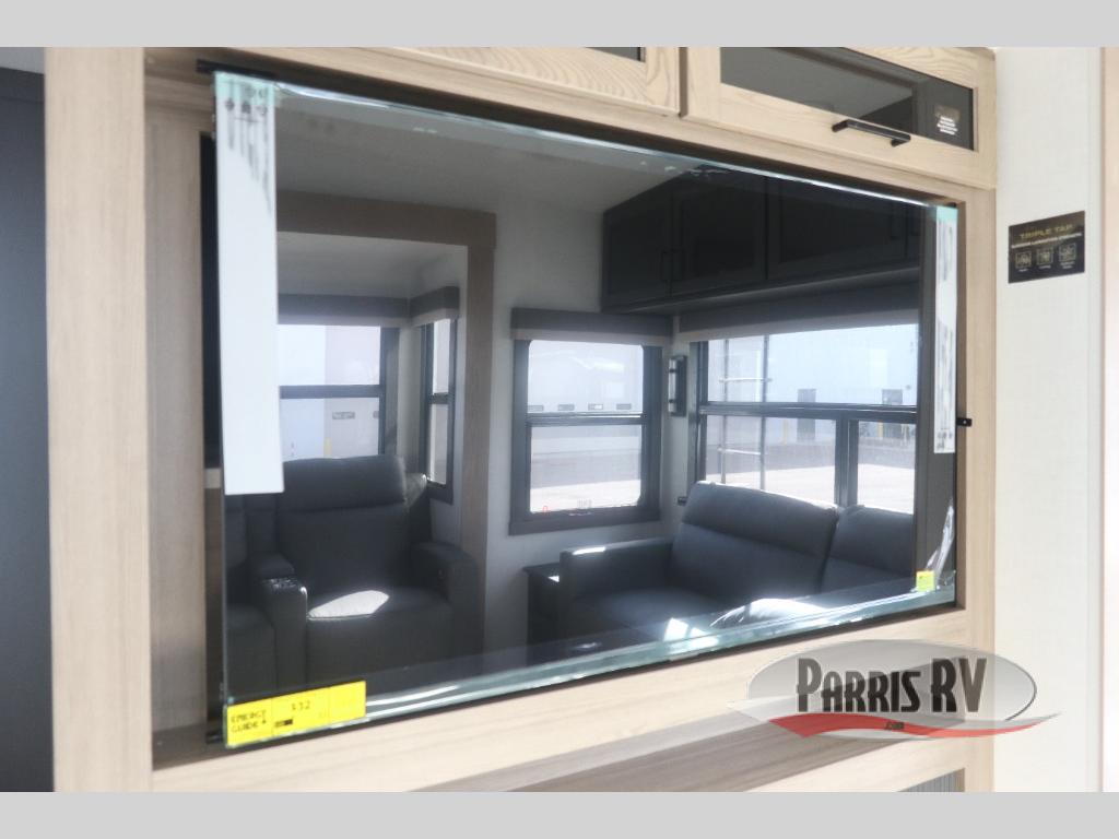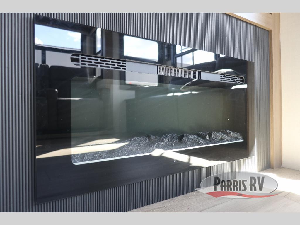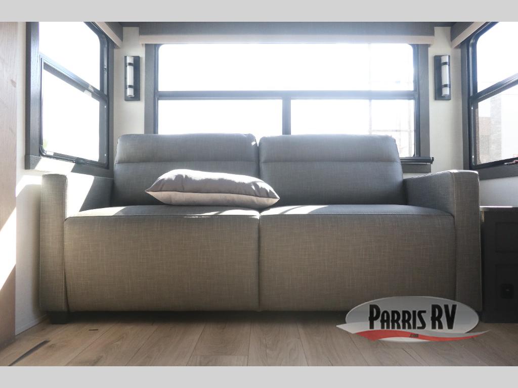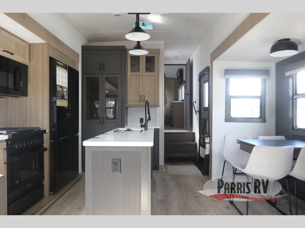 You'll be camping in style each time you take this fifth wheel out to the campground! The dual opposing slides in the main living area create an open floorplan, and the kitchen island here will provide more counter space to prep meals. You will love the theater seat directly across from the entertainment center and fireplace, and additional seating can be found on the hide-a-bed sofa or the dinette with table and chairs. The full bath includes a shower with a seat, plus a Maxxair ventilation fan to keep everything fresh. The front private bedroom may feel more like a resort with its king bed slide out, large wardrobe, plus a dresser to keep your clothes tidy. And did we mention this fifth wheel has two power awnings for maximum protection against the elements, and tons of exterior storage for all your gear!?