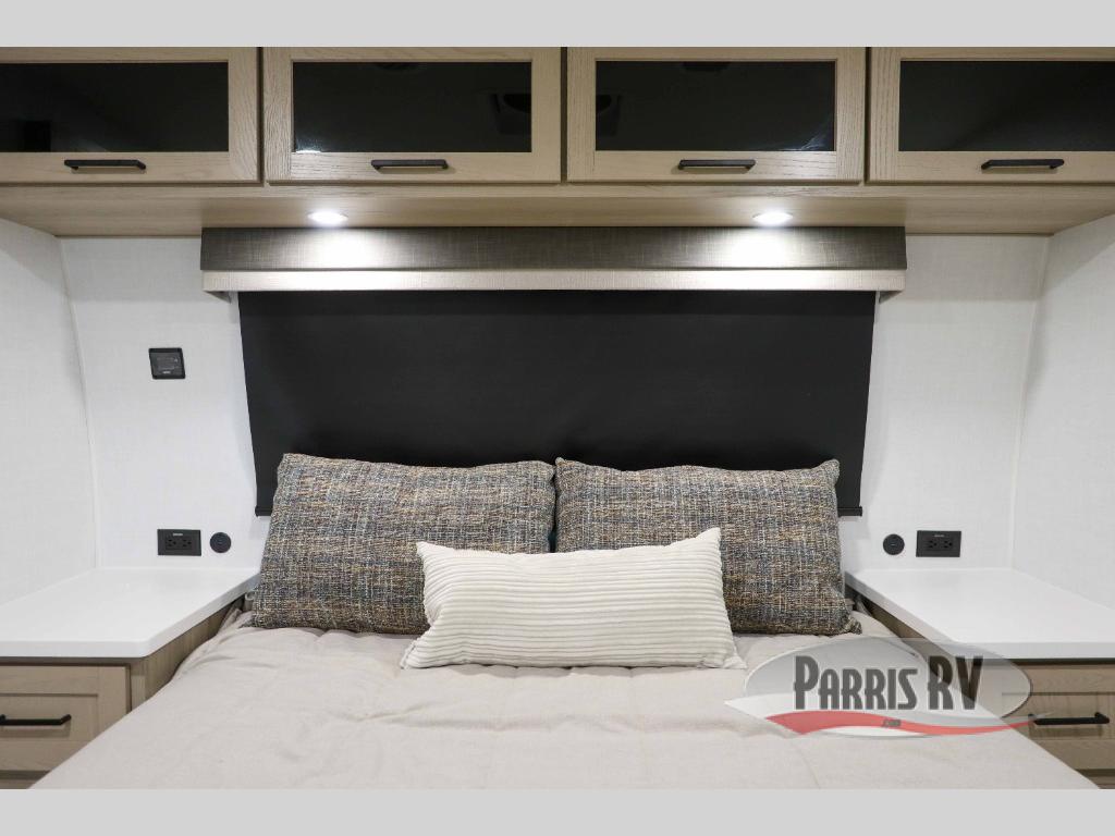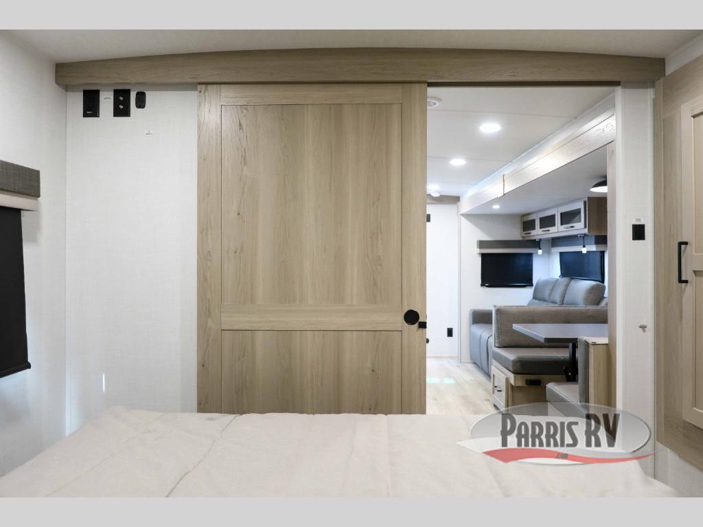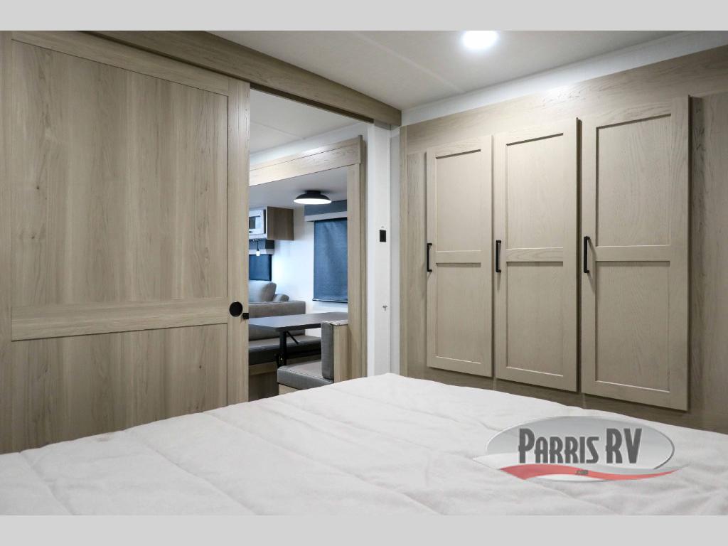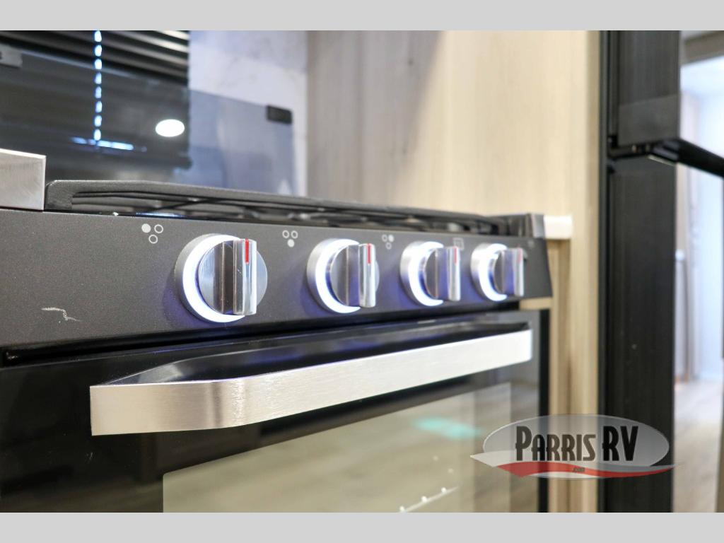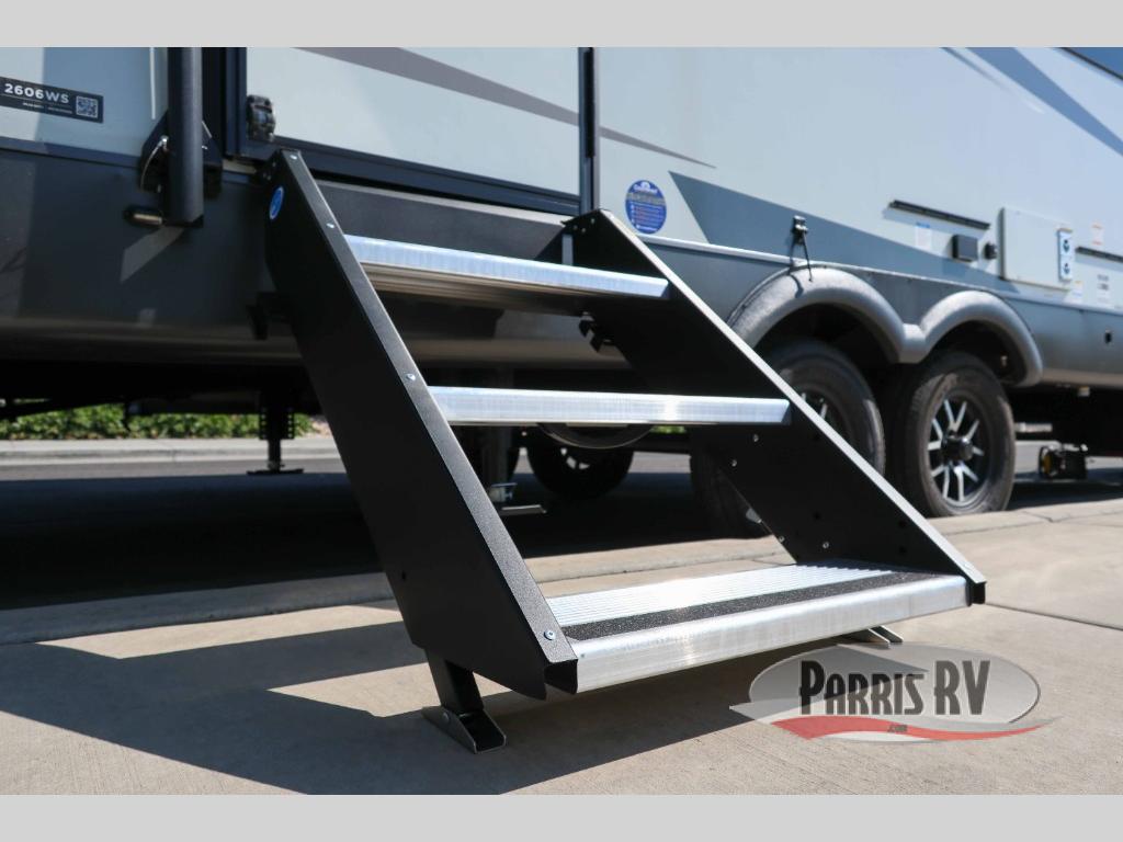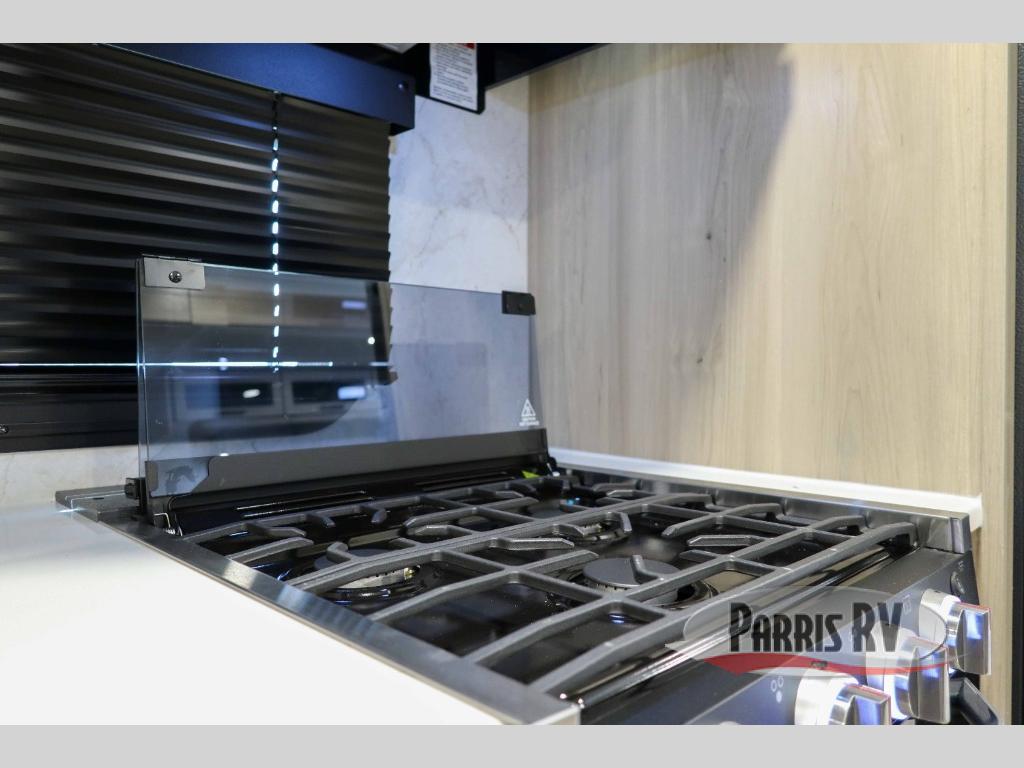 This trailer is the perfect couple's retreat with its private bedroom up front which includes a queen bed, a slide out wardrobe, and a TV option. The spacious rear full bathroom provides a shower and linen storage, and a space savings sliding door. The cook will have full amenities with ample counter space, a walk-in pantry for food storage, and a three burner range to cook meals on. If the weather is nice outside, you can make dinner on the exterior griddle, and there is a 21' awning to relax under. Or you can stay inside to enjoy the fireplace and Smart TV! You will also appreciate the pass thru storage with an optional steel sliding tray to easily access gear!