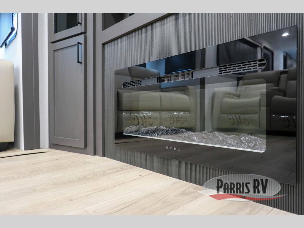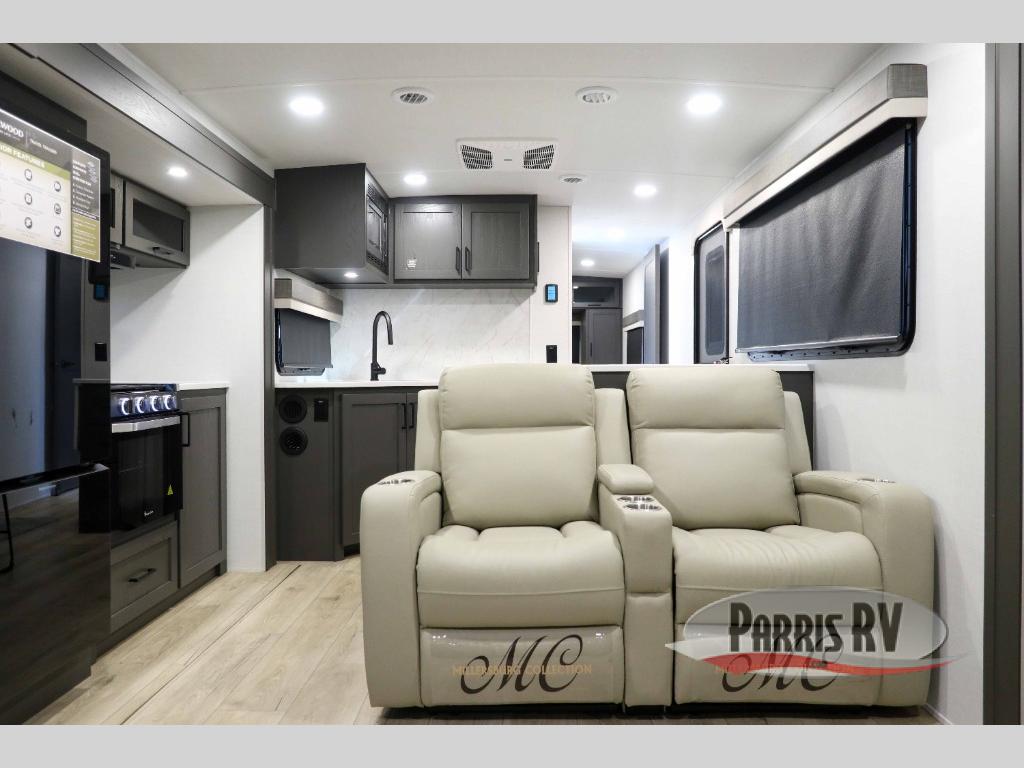 With dual slides at the rear, this Rockwood Ultra Lite travel trailer offers a spacious living area for entertaining or relaxing. Gather the whole gang for movie night with three cozy seating options facing the TV and fireplace, including two 60" hide-a-bed sofas and a 60" theater seat. A table with bar stools adds more seating and doubles as a dining spot, overlooking the TV. Overhead storage throughout the living area and kitchen provides plenty of room to stow away groceries, dishes, books, and board games, keeping everything organized. Let´s not forget the full bathroom with a large shower offers a comfortable place to refresh, while the front bedroom features a queen bed and two wardrobes for storing all your essentials.