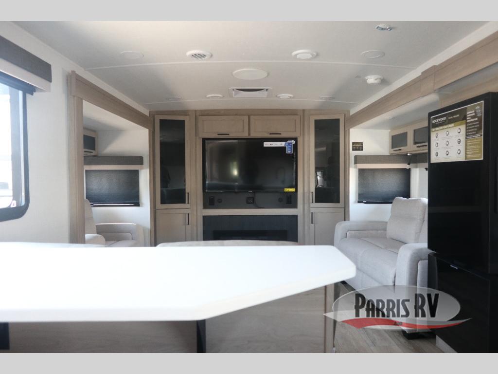 With dual slides at the rear, this Rockwood Ultra Lite travel trailer offers a spacious living area for entertaining or relaxing. Gather the whole gang for movie night with three cozy seating options facing the TV and fireplace, including two 60" hide-a-bed sofas and a 60" theater seat. A table with bar stools adds more seating and doubles as a dining spot, overlooking the TV. Overhead storage throughout the living area and kitchen provides plenty of room to stow away groceries, dishes, books, and board games, keeping everything organized. Let´s not forget the full bathroom with a large shower offers a comfortable place to refresh, while the front bedroom features a queen bed and two wardrobes for storing all your essentials.
