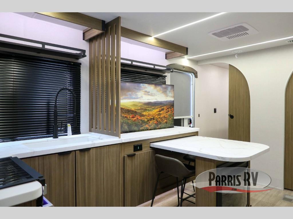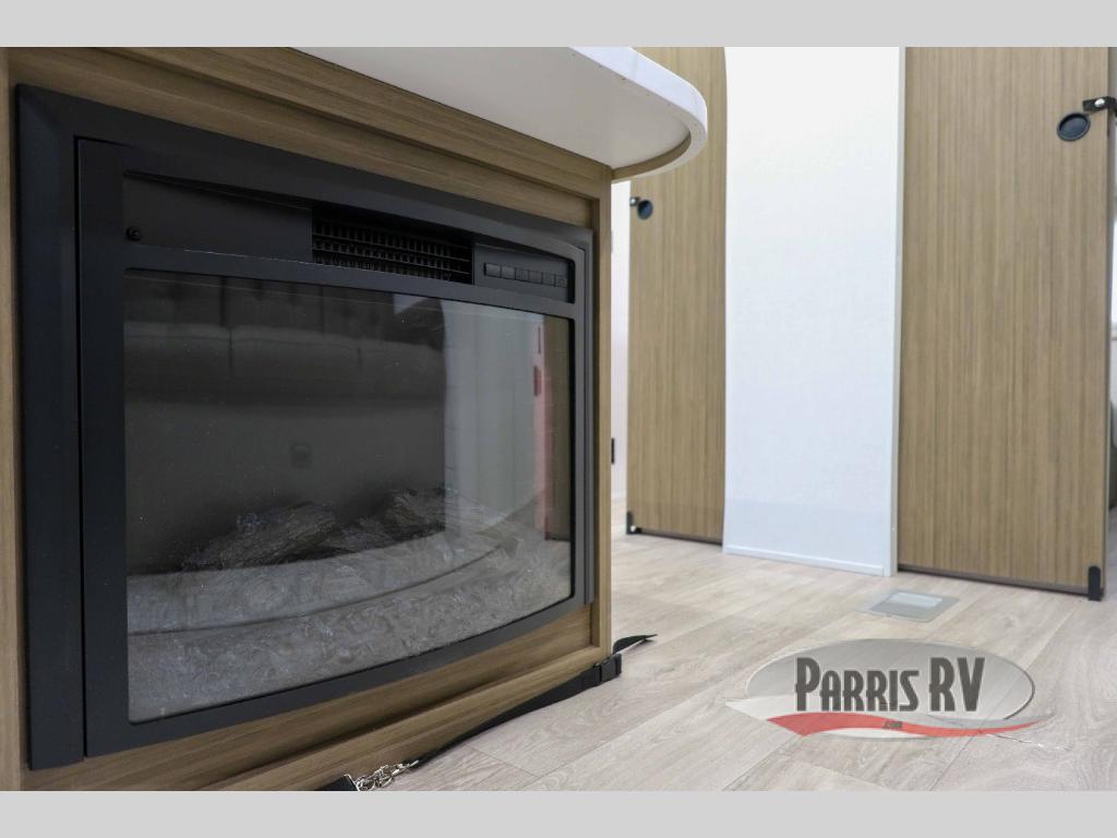 Everyone will enjoy having their own space in this travel trailer thanks to the front master bedroom and the rear bunkhouse. The bunkhouse includes a wall to separate the Versa bunk and fold-down desk on one side and a Versa sofa on the other, perfect for older kids or guests. You'll have the custom king bed with Versa Tilt all to yourselves, and the walk-thru bath will be easily accessible for everyone. In the combined kitchen and living room, a jackknife sofa slide sits across from the fireplace/entertainment center, and there is a pull-out table here so you can dine together.
