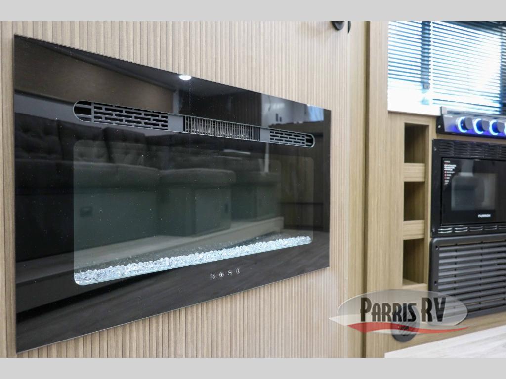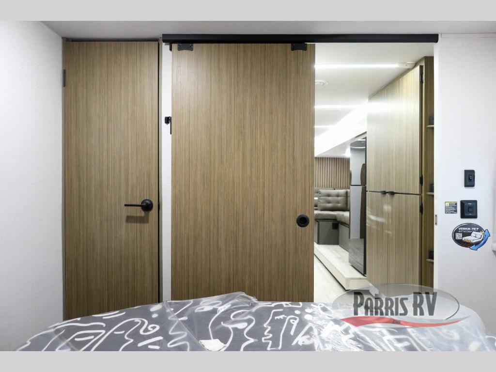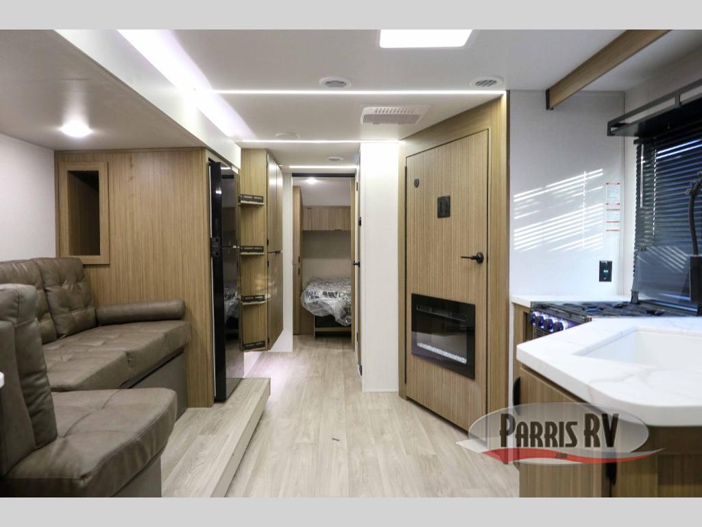 Your guests or older kids will love camping in this spacious travel trailer thanks to the rear bunk beds, each with their own private door! The front bedroom includes a Versa-Tilt custom king bed, a closet and overhead shelf for storage, and any other guests can sleep on the booth dinette and Versa-Lounge within the large slide out. The combined kitchen and living area also includes all the appliances to make meals each day, a booth dinette, and an entertainment center with a fireplace and hidden pantry. And don't overlook the full bath with a walk-in shower to easily clean up each day!