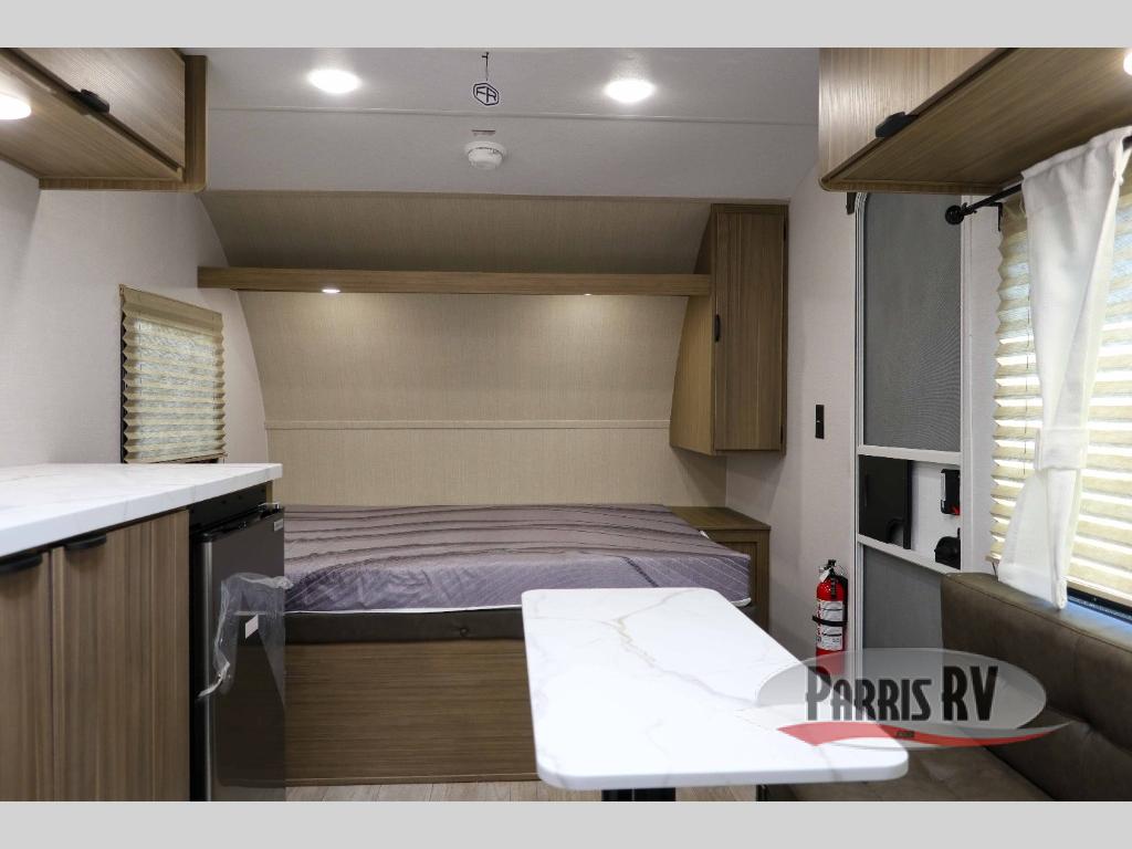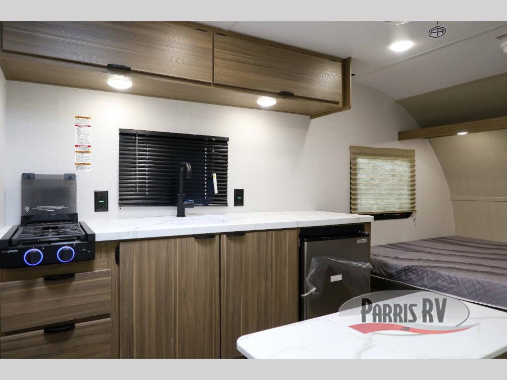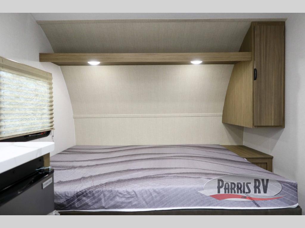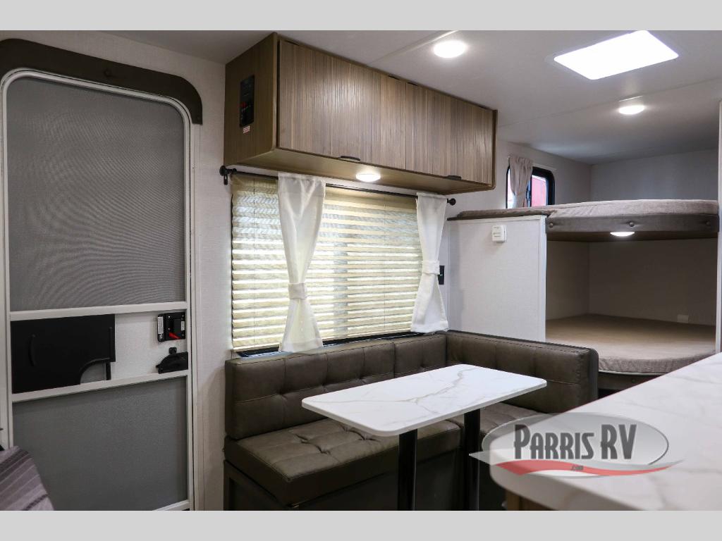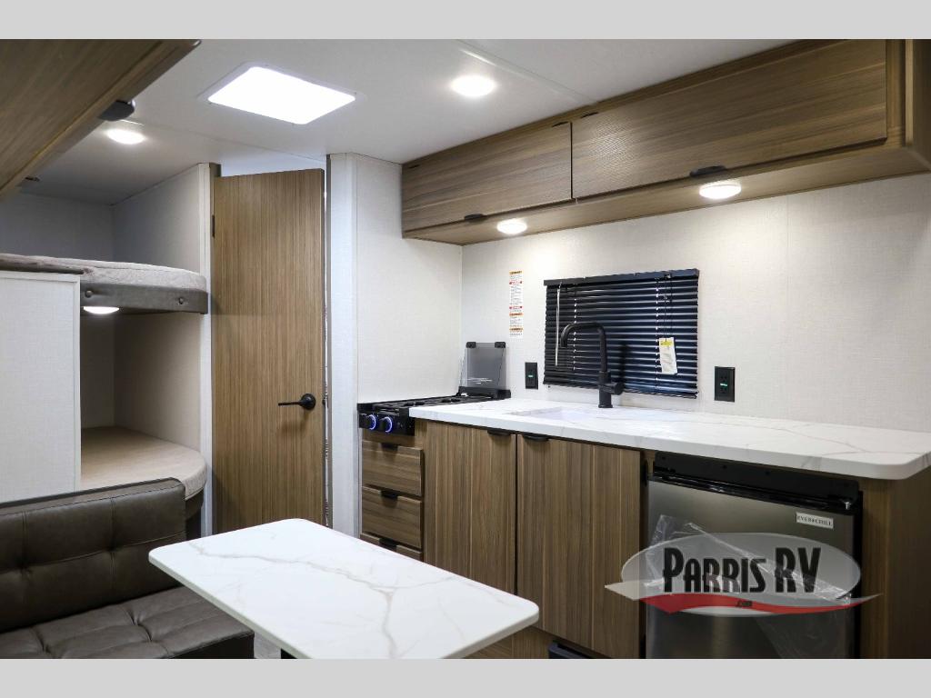 The double-size bunks with storage will be a big selling point in this travel trailer! While your guests take the bunks, you can have the front queen bed all to yourselves, and there is a wardrobe to keep your things organized. A two burner cooktop and microwave will let you make meals each day, and you can dine at the open lounge with a table.