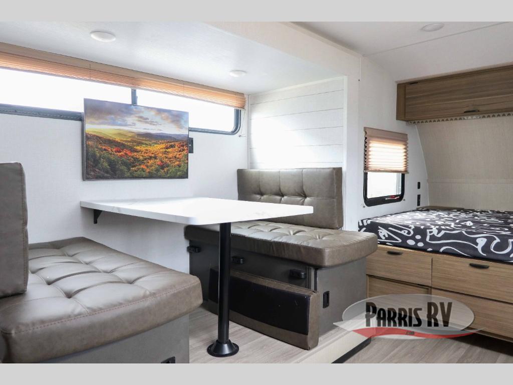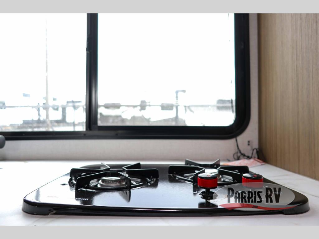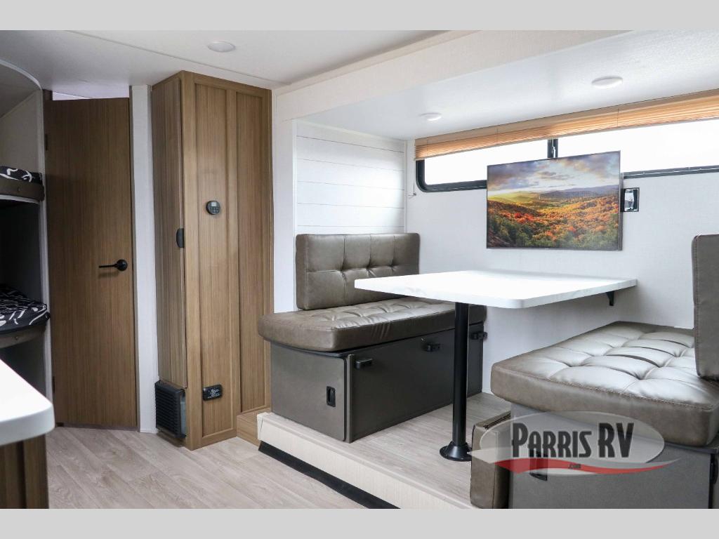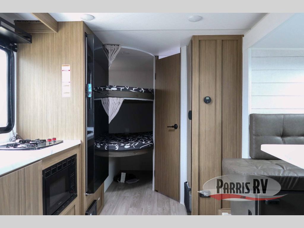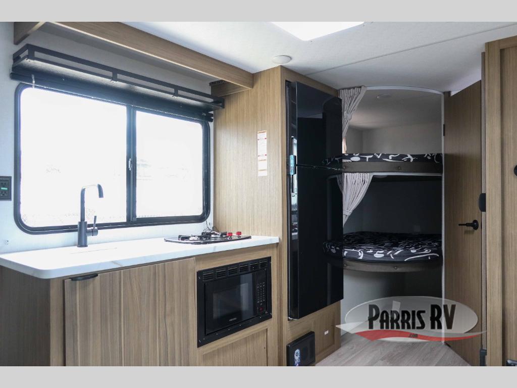 It will be so easy to enjoy time spent in this travel trailer for seven. The front queen bed provides a great night's rest, and there is an overhead cabinet to keep your things organized. Your guests or little ones can claim the double-size bunks for themselves, and there is a full bath adjacent to the bunks for easy nighttime use. A two-burner cooktop in the kitchen will let you make meals for your crew, and a refrigerator keeps leftovers fresh. You can dine at the booth dinette within the slide out or take your plate outdoors to sit under the 12' power awning.