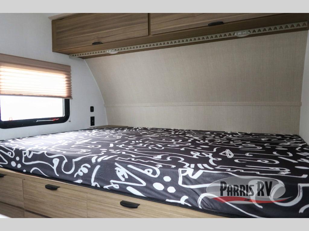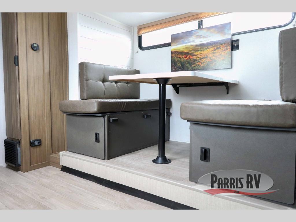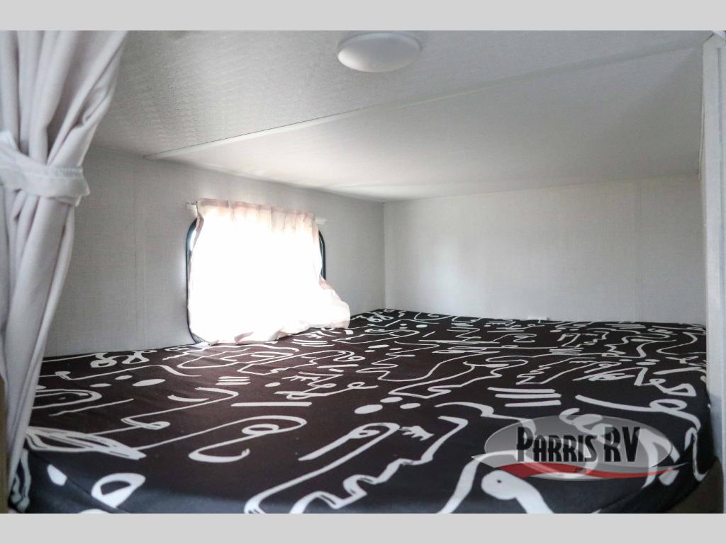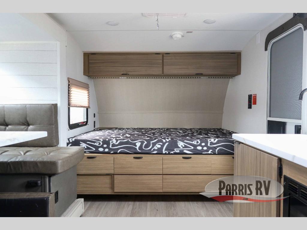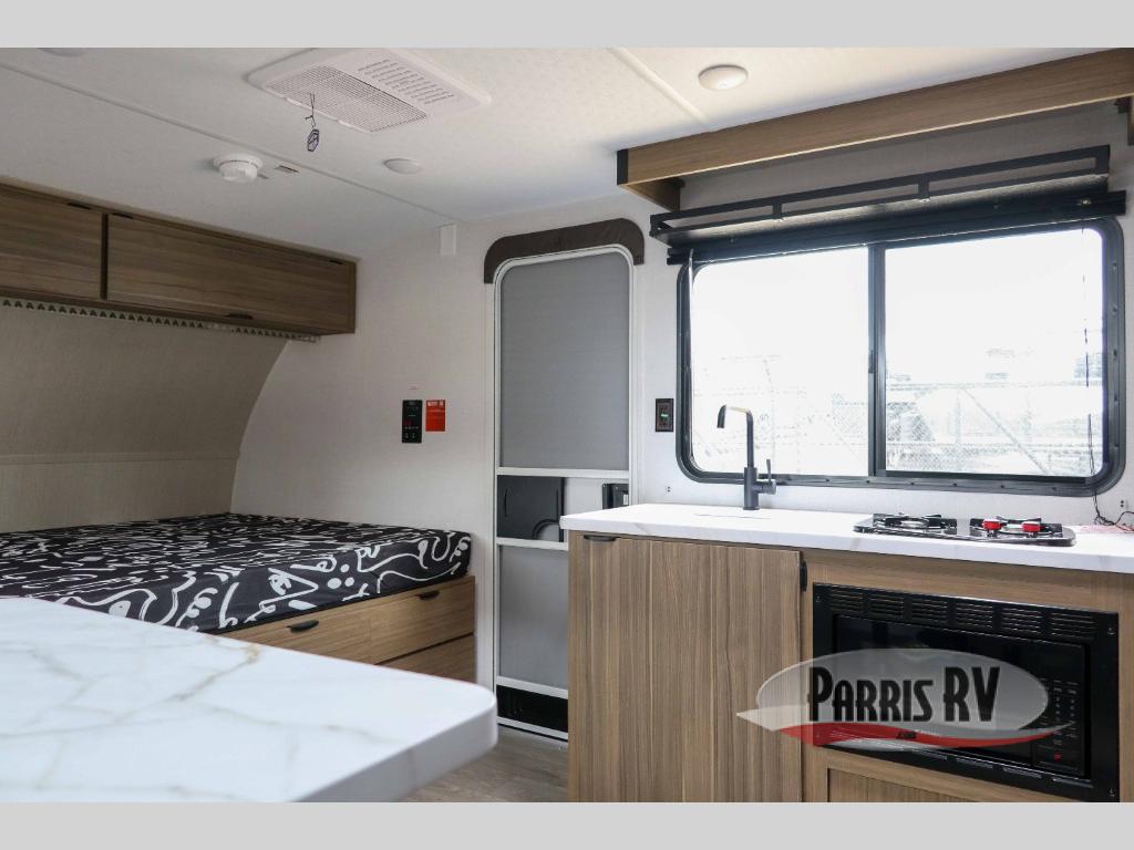 It will be so easy to enjoy time spent in this travel trailer for seven. The front queen bed provides a great night's rest, and there is an overhead cabinet to keep your things organized. Your guests or little ones can claim the double-size bunks for themselves, and there is a full bath adjacent to the bunks for easy nighttime use. A two-burner cooktop in the kitchen will let you make meals for your crew, and a refrigerator keeps leftovers fresh. You can dine at the booth dinette within the slide out or take your plate outdoors to sit under the 12' power awning.