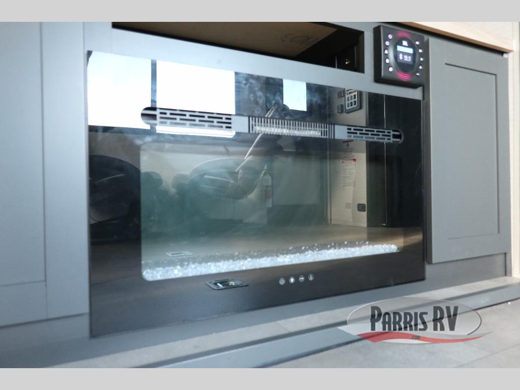 Are you looking for a travel trailer that can haul your favorite riding toys and still provide at-home comforts? This toy hauler is the one with 15' 1" total garage space, a front master bedroom with a king bed and dresser slide out, and a walk-through bath! The main living area also includes many comforts, like the dual lounge chairs, entertainment center slide out with a fireplace, and full kitchen. Your guests will find their beds on the electric pass-thru dinette or the drop-down electric bed!