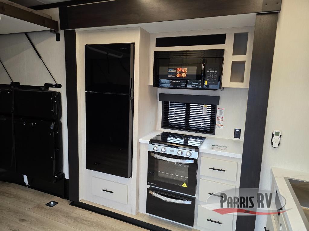 This double slide out toy hauler is ready for adventure when you are! Once your toys are unloaded using the ramp door, you can set up the flip-up sofas or set up the drop-down queen bed for guests to sleep on. You'll enjoy the front private bedroom all to yourselves that includes a king bed slide and a large dresser to keep your things organized. A three-burner range and 30" microwave will let you make meals each day, and the 10.7 cu. ft. 12V refrigerator will keep your food stored away.