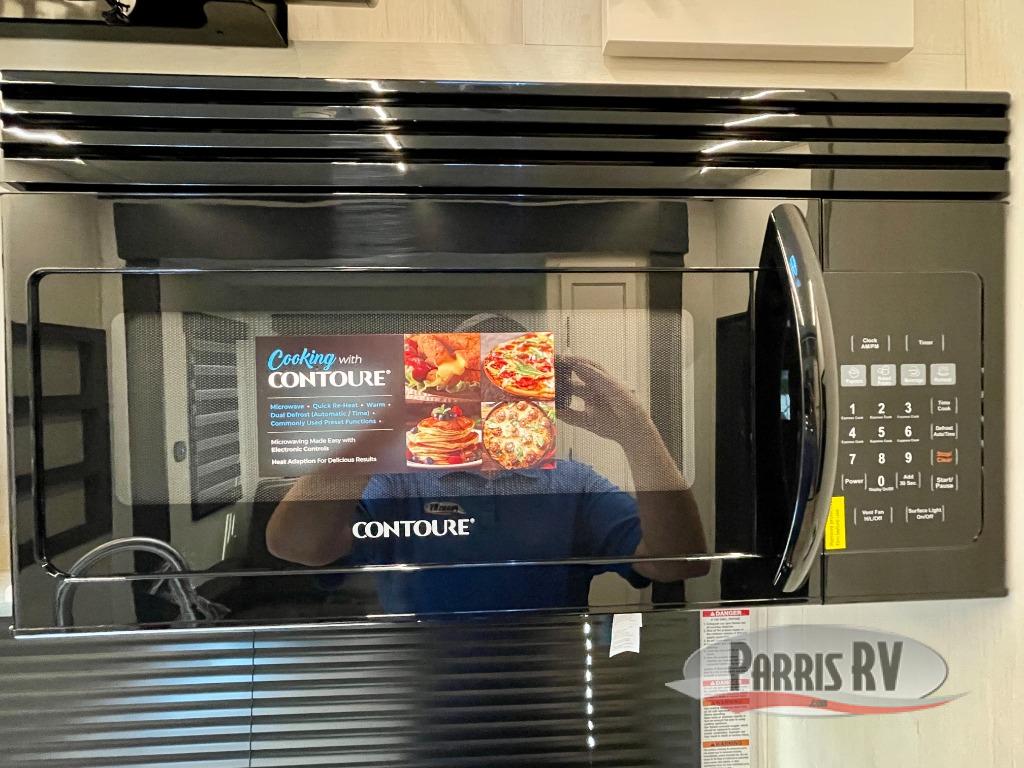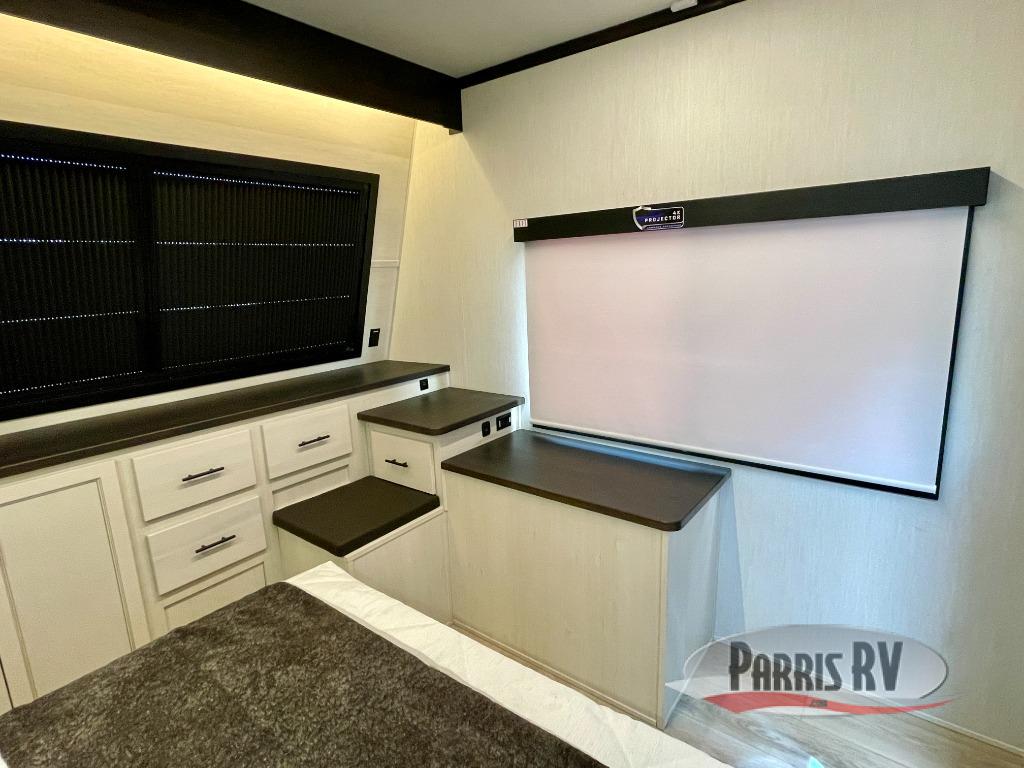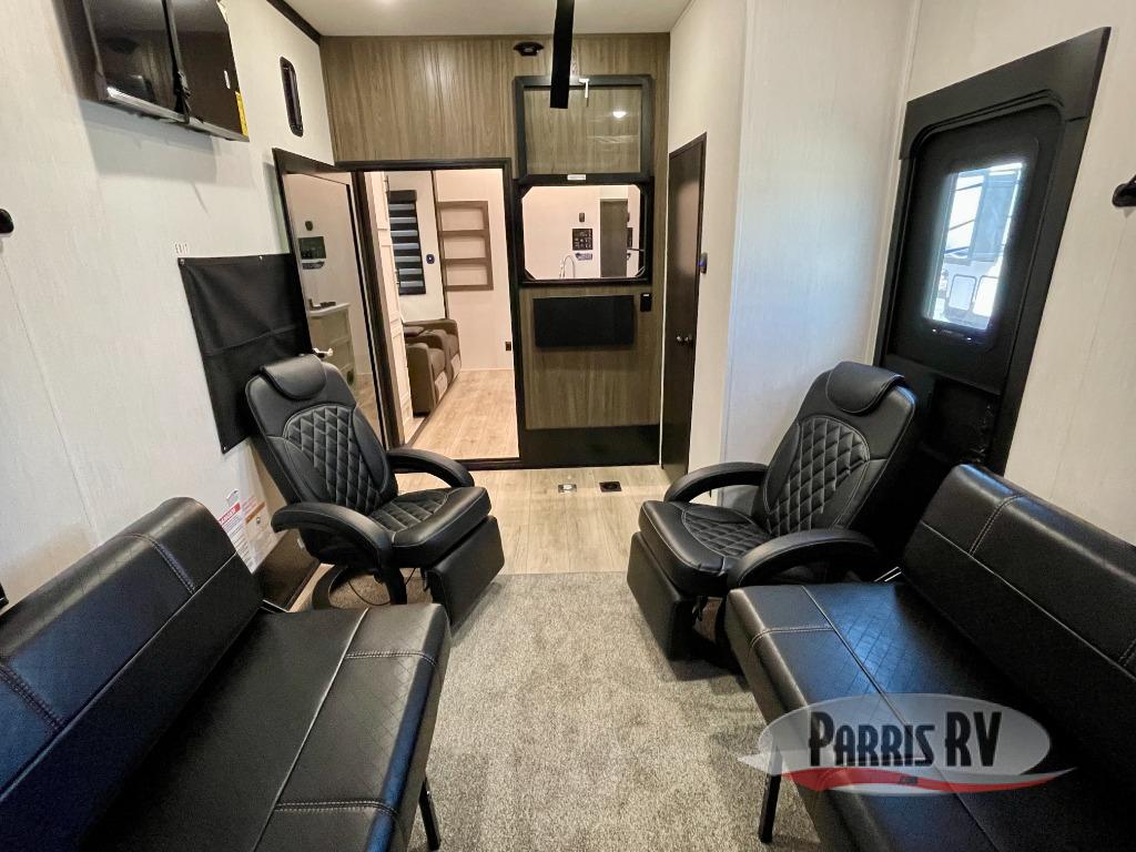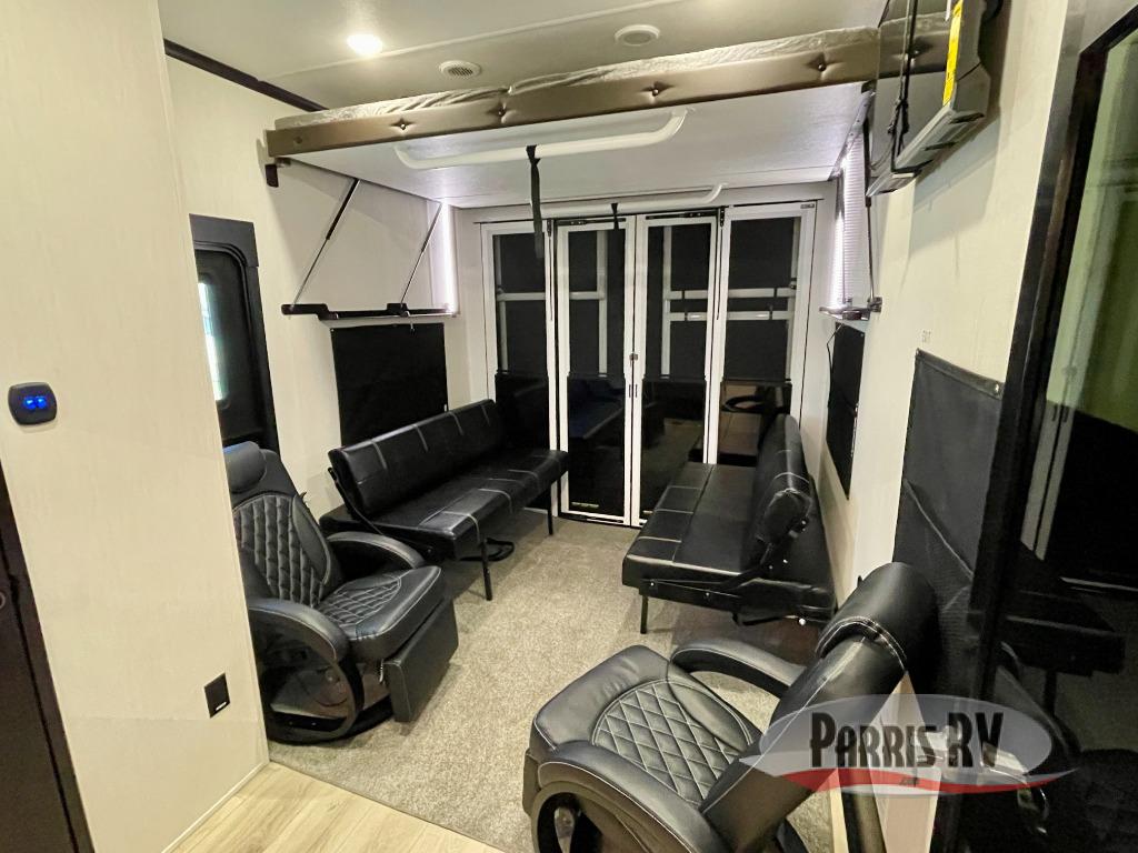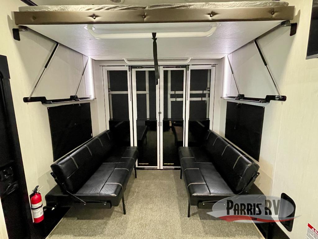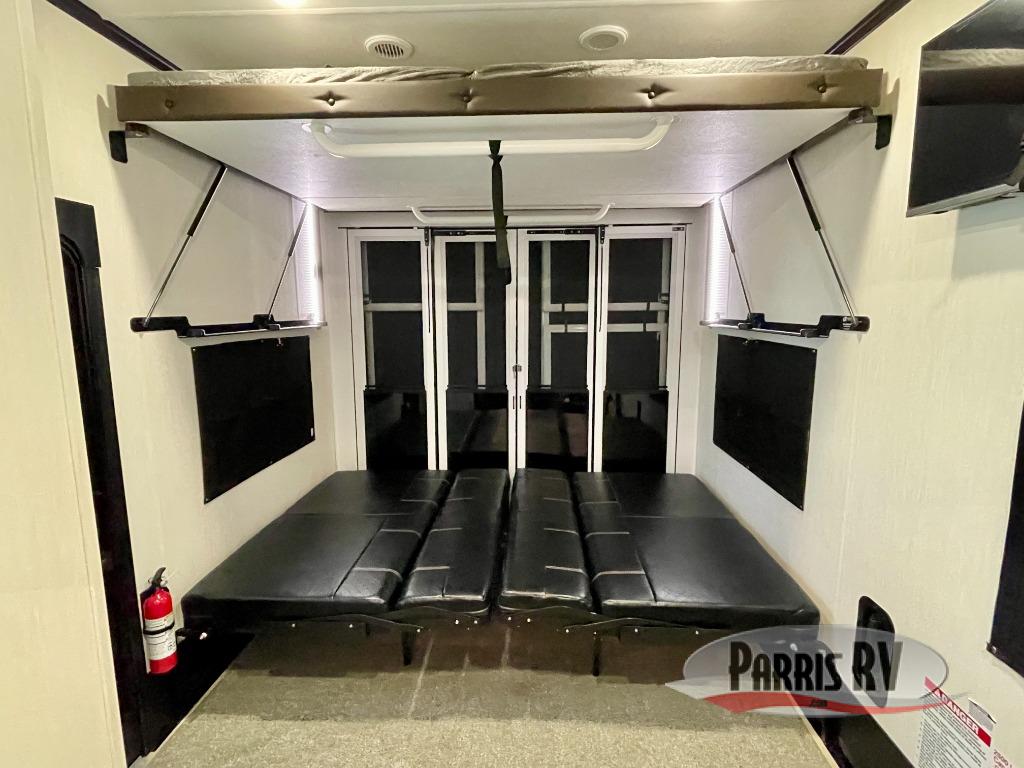 This double slide out toy hauler is ready for adventure when you are! Once your toys are unloaded from the separate garage, you can set up the flip-up sofas or set up the drop-down queen bed for guests to sleep on, and there is even a half bath here for added convenience. You'll enjoy the front private bedroom all to yourselves that includes a king bed slide and a large dresser to keep your things organized. The combined kitchen and living area includes a three burner range and 30" microwave to make meals, a sofa with recliners to relax on, plus a 12V refrigerator and pantry for food storage.