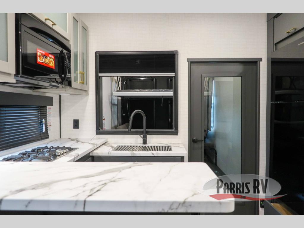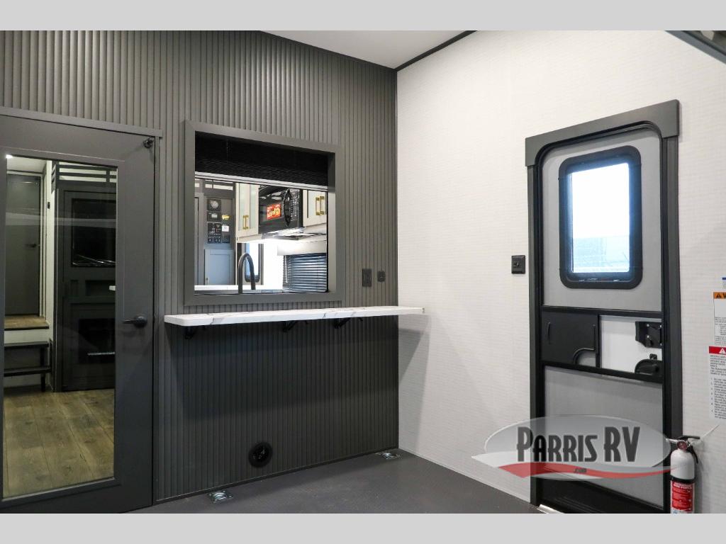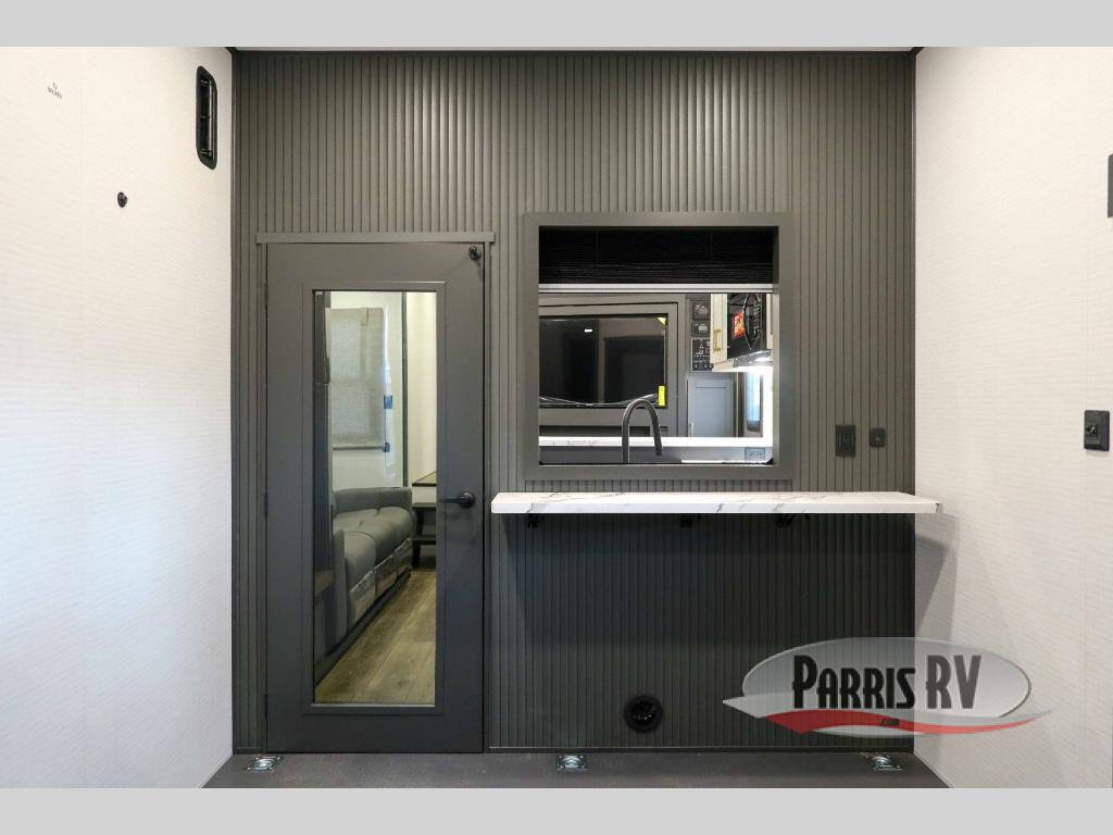 You'll love every minute spent in this double slide out, double entry fifth wheel! Your guests will have the 13' 6" separate garage all to themselves once the toys are unloaded, and here you'll find dual sofa sleepers with a Euro queen bed above. There is also a removable dinette table where you can enjoy a cold drink at when you have the 1,500 lb. capacity patio deck set up! Head to the combined kitchen and living area to relax on the sofa slide out while the cook prepares dinner. There is also a hidden pantry here you are sure to appreciate! The dual entry bath will create a front master bedroom, complete with a queen bed, dual nightstands and wardrobes, plus a wardrobe slide out for added storage and space!