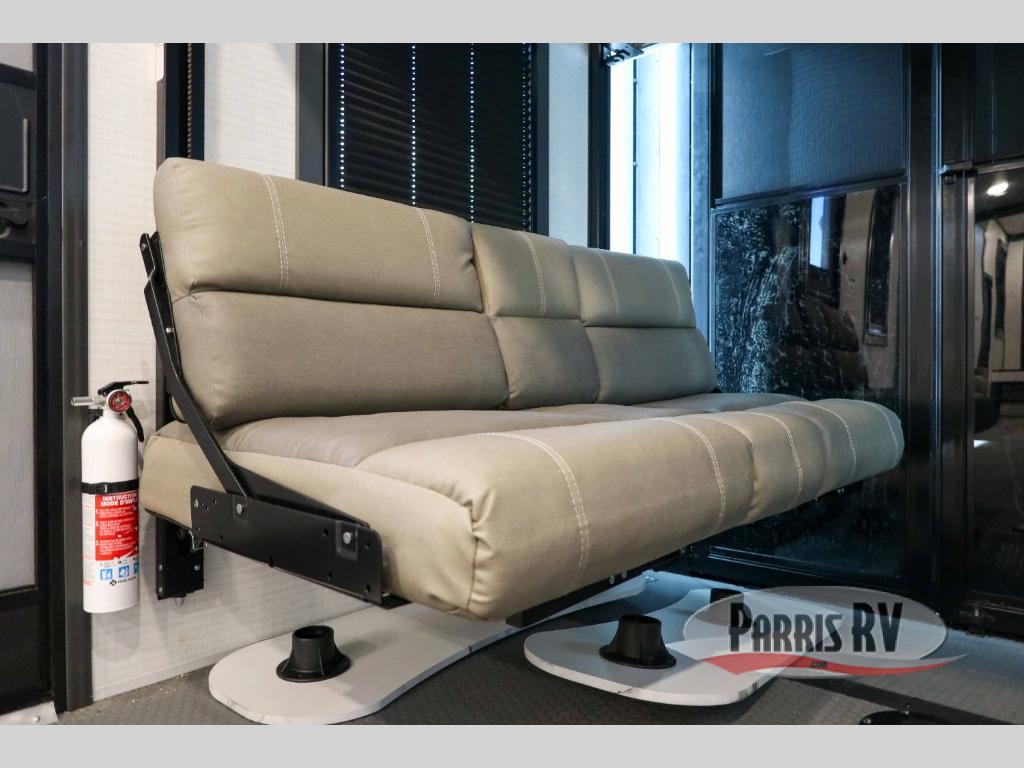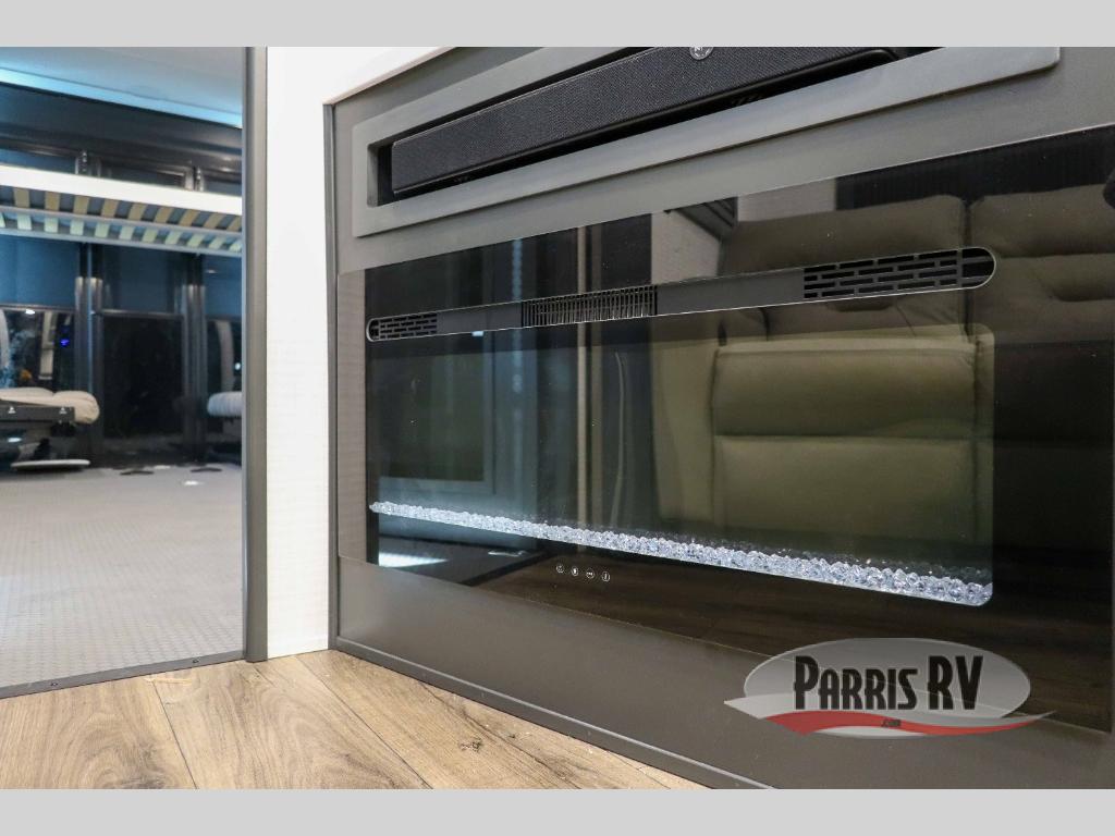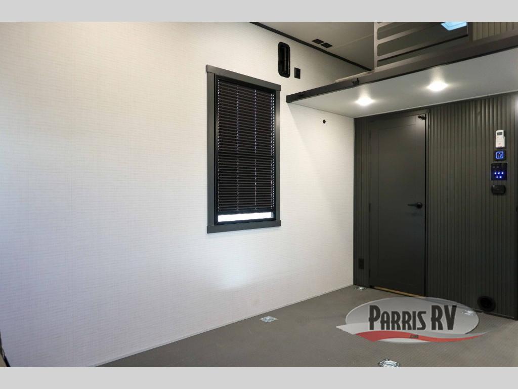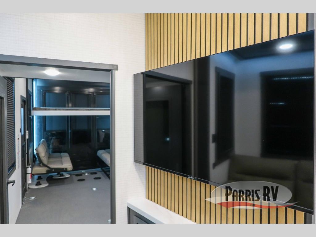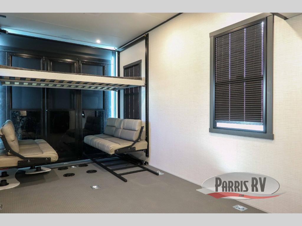 This 40G17 model is built for both adventure and comfort, starting with an expansive 17-foot garage that provides ample space for all your toys. Inside the garage, you’ll find a versatile Happi-Jack dinette with a removable table, perfect for meals or hanging out, and a Happi-Jack queen bed system that offers additional sleeping space when needed. One of the unit's two entry doors is also conveniently located here along with a half bath. In the middle living area, one of the three slide-outs houses the large sofa, centered across a cozy fireplace and a 55-inch TV ideal for relaxing after a long day. The kitchen is designed for functionality, featuring an island with a double sink, a 16 cu.ft. refrigerator, microwave, and a large 20-cu.ft. pantry to keep all your snacks and essentials organized. Toward the front, you’ll find the full bathroom and a private bedroom that includes a king bed, spacious wardrobe and dresser, offering plenty of storage for clothes and personal items, making this toy hauler the perfect home on the road.