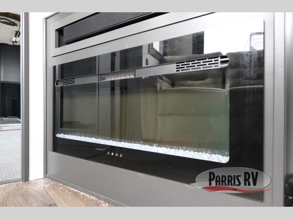 This 40G17 model is built for both adventure and comfort, starting with an expansive 17-foot garage that provides ample space for all your toys. Inside the garage, you’ll find a versatile Happi-Jack dinette with a removable table, perfect for meals or hanging out, and a Happi-Jack queen bed system that offers additional sleeping space when needed. One of the unit's two entry doors is also conveniently located here along with a half bath. In the middle living area, one of the three slide-outs houses the large sofa, centered across a cozy fireplace and a 55-inch TV ideal for relaxing after a long day. The kitchen is designed for functionality, featuring an island with a double sink, a 16 cu.ft. refrigerator, microwave, and a large 20-cu.ft. pantry to keep all your snacks and essentials organized. Toward the front, you’ll find the full bathroom and a private bedroom that includes a king bed, spacious wardrobe and dresser, offering plenty of storage for clothes and personal items, making this toy hauler the perfect home on the road.