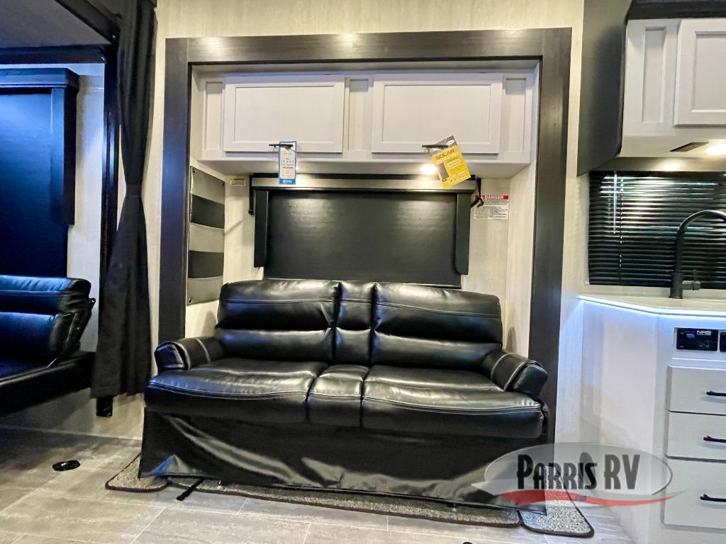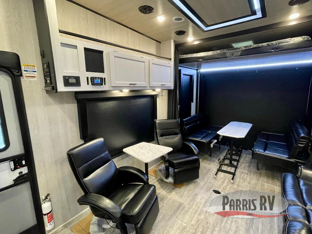This toy hauler is ready for fun when you are! After your toys are unloaded from the garage, relax on the power sofa bed or let your guests take a rest on the power queen bed above the sofa. There are also dual swivel/rocker chairs with a table you can enjoy your morning coffee at each morning. The chef of your group can make eggs and bacon on the three burner cooktop before you all head out, and the full bath will allow you to clean up when you return. The front private bedroom will feel just like home with its RV queen bed, nightstand, wardrobe, and overhead cabinets. This model also has two optional slide outs if you'd like to add more interior space!