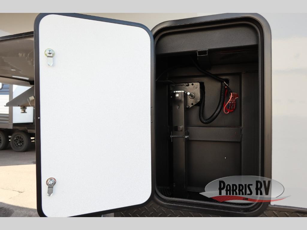 This toy hauler is ready for fun when you are! After your toys are unloaded from the garage, relax on the power sofa bed or let your guests take a rest on the power queen bed above the sofa. There are also dual swivel/rocker chairs with a table you can enjoy your morning coffee at each morning. The chef of your group can make eggs and bacon on the three burner cooktop before you all head out, and the full bath will allow you to clean up when you return. The front private bedroom will feel just like home with its RV queen bed, nightstand, wardrobe, and overhead cabinets. This model also has two optional slide outs if you'd like to add more interior space!