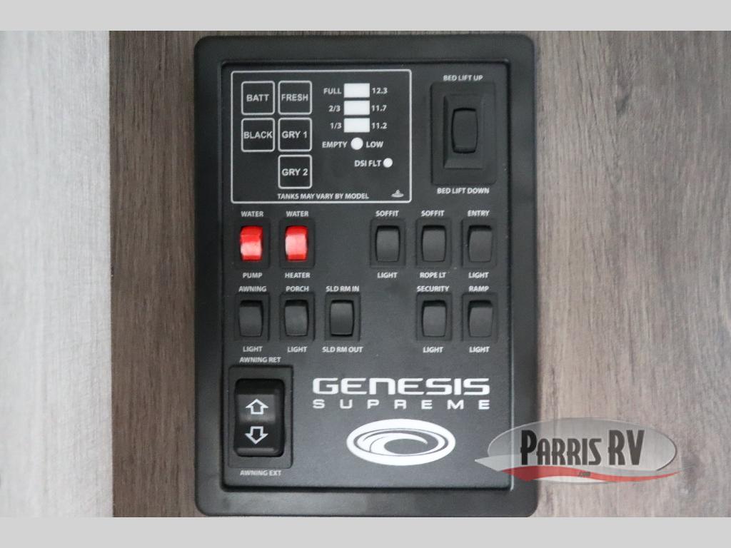 Your camping life is going to be a blast with the Genesis Supreme Vortex toy hauler! These work horses get the job done but also make it fun. You will be able to use the 40-gallon fuel station to gas up your toys when you come back from the trails, and the power awning with LED lights will give you protection as you use the exterior features. The 16" deluxe aluminum alloy wheels will get you to and from your destination with confidence, and the 30,000 or 35,000 BTU furnace will ensure that you don't freeze while you sleep on cool nights. You can keep power flowing with the generator with transfer switch, and you'll also enjoy the function and the style of the solid-surface countertops in the kitchen.