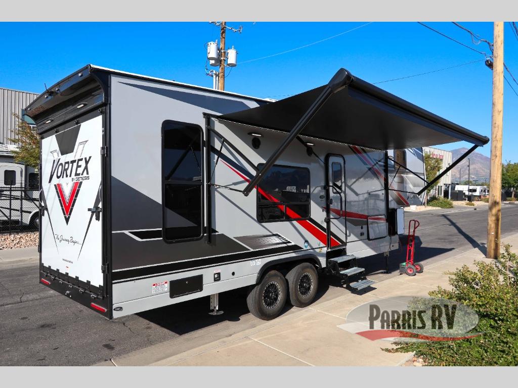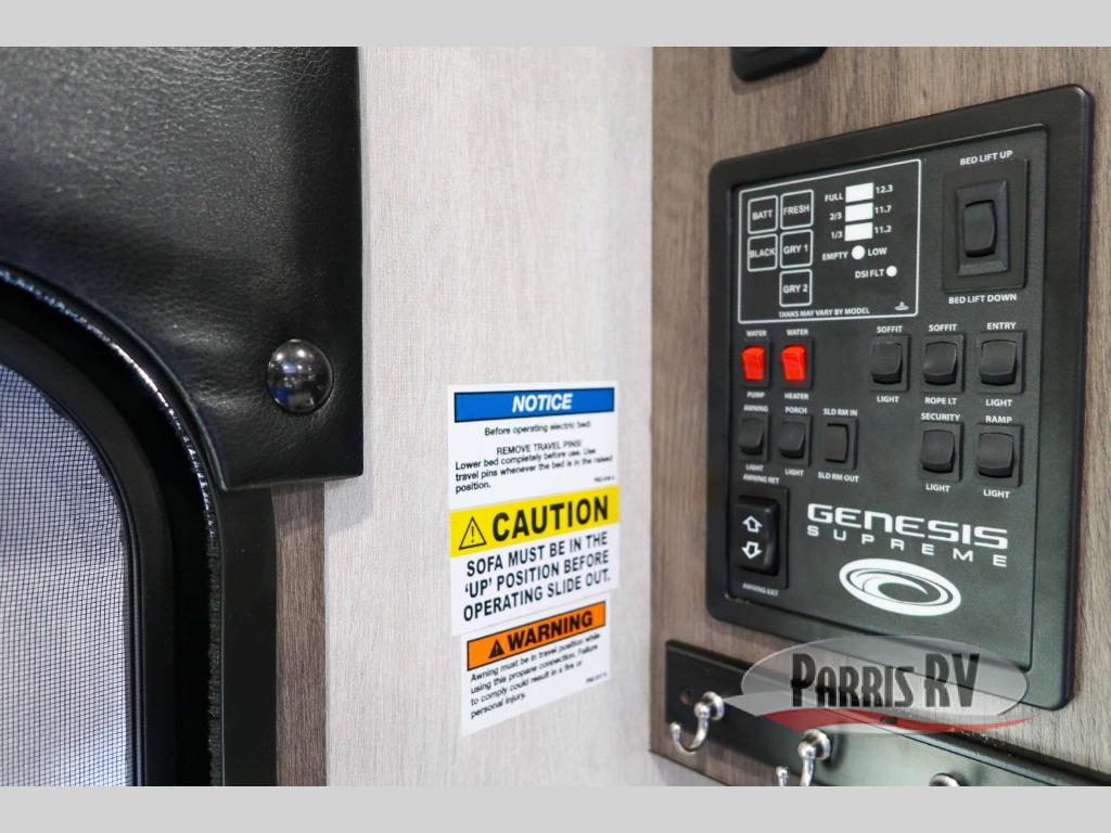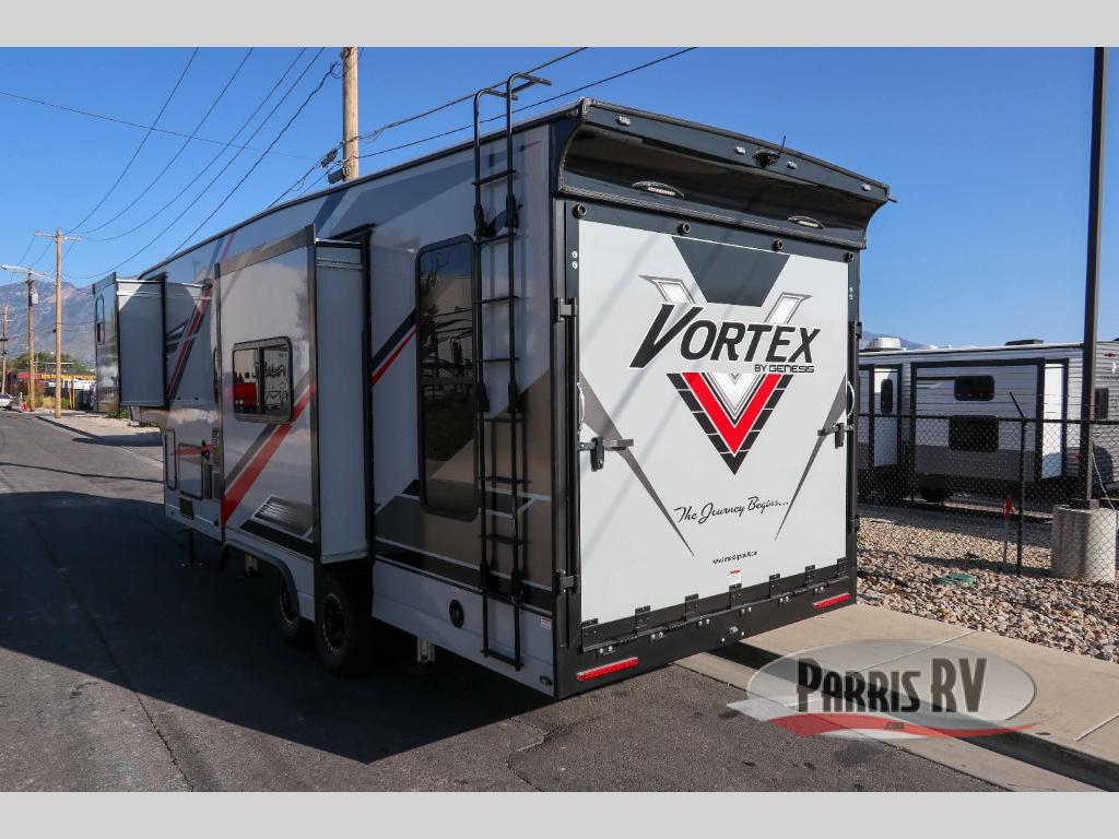 Your camping life is going to be a blast with the Genesis Supreme Vortex toy hauler! These work horses get the job done but also make it fun. You will be able to use the 40-gallon fuel station to gas up your toys when you come back from the trails, and the power awning with LED lights will give you protection as you use the exterior features. The 16" deluxe aluminum alloy wheels will get you to and from your destination with confidence, and the 30,000 or 35,000 BTU furnace will ensure that you don't freeze while you sleep on cool nights. You can keep power flowing with the 4.0kW generator with transfer switch, and you'll also enjoy the function and the style of the solid-surface countertops in the kitchen.