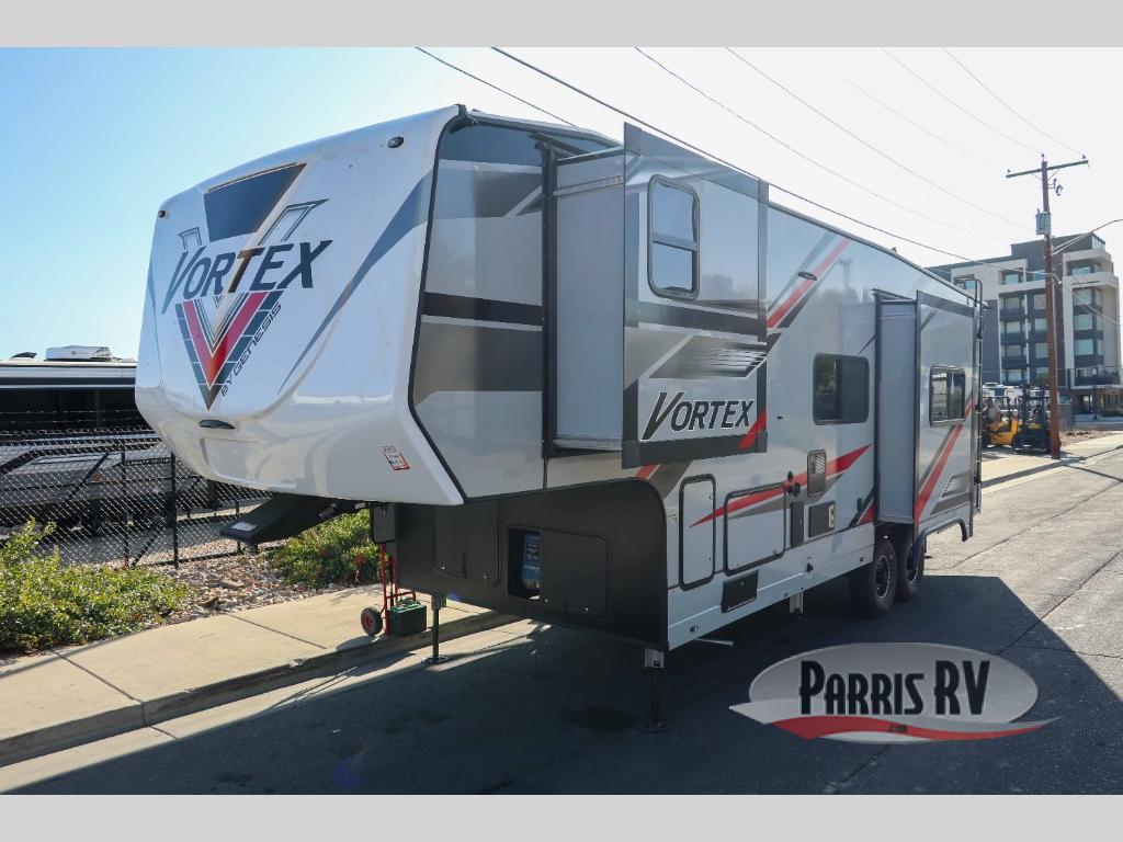 You can store your ATVs in the 15' 11" garage on this Vortex toy hauler and use the 7' laminated ramp door with beaver tail to get them out. For other gear, there are slam-door storage compartments, and you'll also be able to put fresh products in the 6-cubic foot double-door refrigerator. When you get hungry, use the three-burner range to make a fresh batch of French toast, and when you get tired, use the RV queen bed, power queen bunk, and sofa bed to get some rest. You can add space to the interior by adding the two optional slides, and you can also add some entertainment by adding the optional TVs.