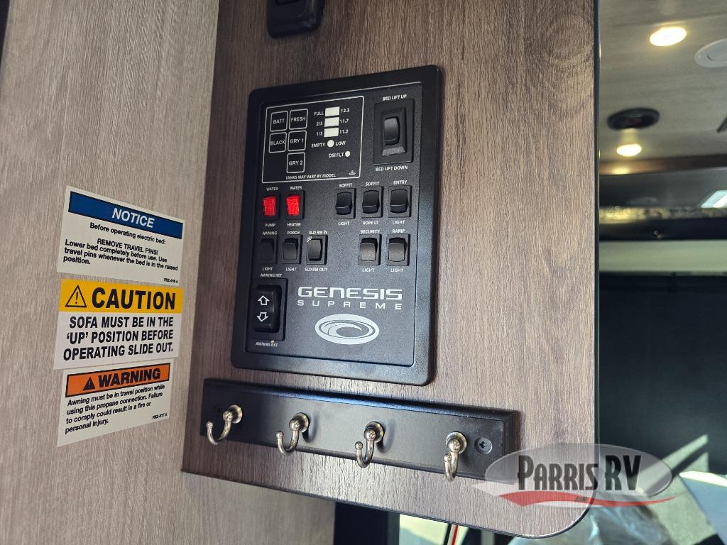 Your camping life is going to be a blast with the Genesis Supreme Vortex toy hauler! These work horses get the job done but also make it fun. You will be able to use the 40-gallon fuel station to gas up your toys when you come back from the trails, and the power awning with LED lights will give you protection as you use the exterior features. The 16" deluxe aluminum alloy wheels will get you to and from your destination with confidence, and the 30,000 or 35,000 BTU furnace will ensure that you don't freeze while you sleep on cool nights. You can keep power flowing with the 4.0kW generator with transfer switch, and you'll also enjoy the function and the style of the solid-surface countertops in the kitchen.