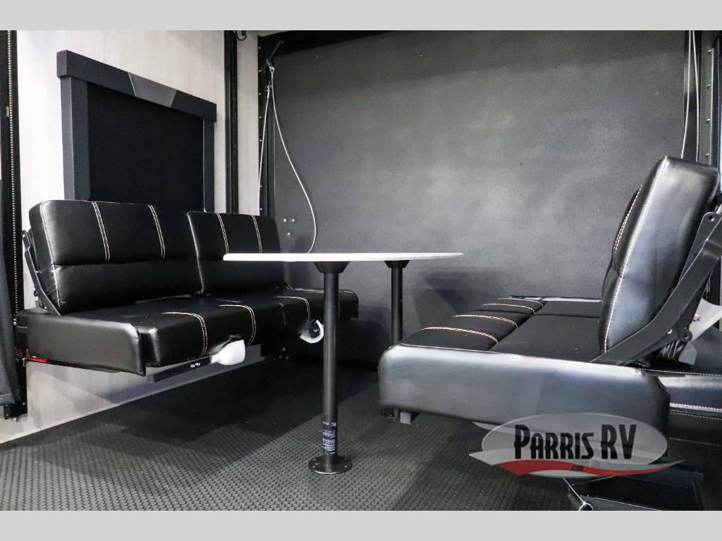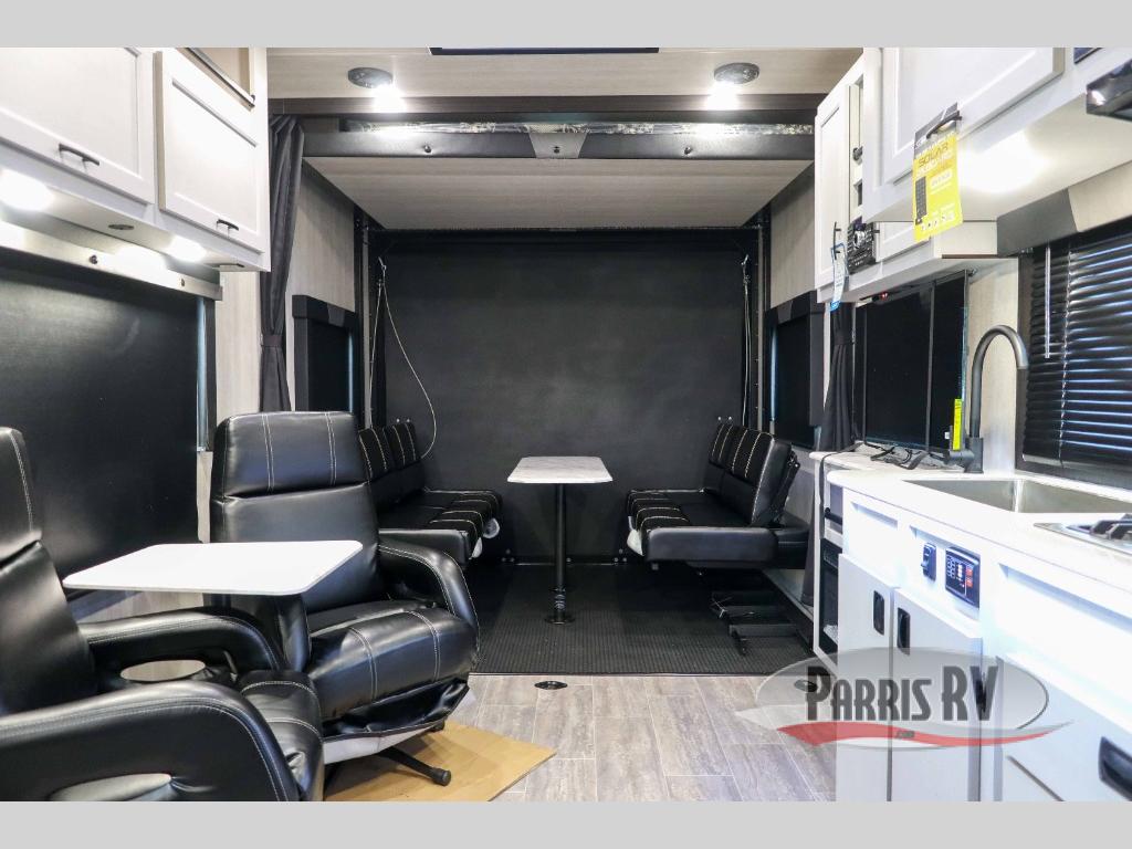 If you and your spouse enjoy hitting the trails while camping then this toy hauler is for you! The cargo area also has two chairs and a sofa with a table to relax on each night. Whip up your best meals on the three burner cooktop, and store leftovers in the refrigerator. The full-size bed with overhead storage will provide a great night's rest, and the full bath in the front corner will let you clean up each day!