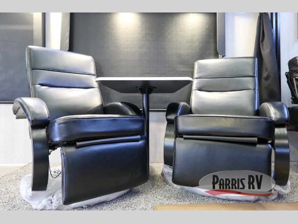 Ride the trails all day and return to comfort in this Vortex toy hauler at night! You'll have a great gathering space with a set of lounge chairs, a living room slide, and sofas with table in between the chairs to set your drinks on. You can also watch a movie together with the 50" TV in the living room, and the private bedroom also has its own 40" TV for late-night watching. The ceiling fan allows you to keep fresh air circulating on those hot summer days without having to overwork the air conditioner, and every day's meals will be easy to prepare with the great tools found in the kitchen, like the XL residential microwave.