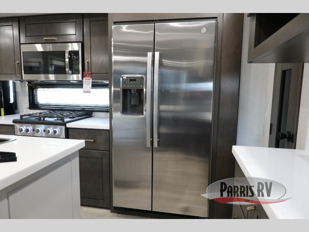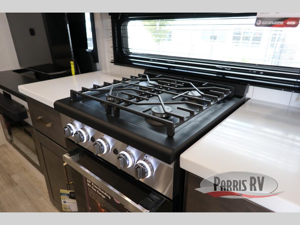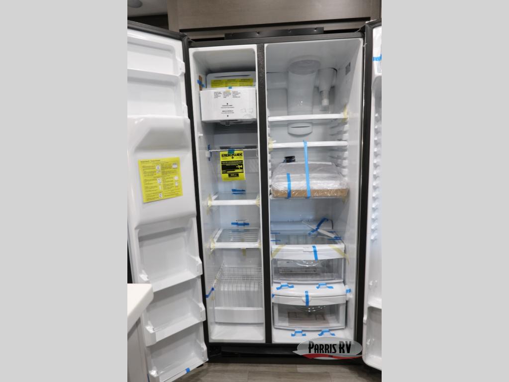 At the front of the unit, the spacious main bedroom offers a 72" x 80" king bed, providing ample room to relax and unwind. A wardrobe with drawers and a built-in hamper ensures plenty of organized storage for clothing and essentials, while a flip-up dresser across from the bed adds even more convenience. Moving down the hall, you’ll find a full bathroom featuring a large 36" x 48" shower with a built-in seat for added comfort. Toward the rear, the main living area has dual opposing slides that open up the space for maximum comfort and functionality. One slide hosts the fully equipped kitchen, complete with overhead cabinets, a convection microwave with built-in air fryer, a 24" range, and a 21-cu. ft. residential refrigerator, everything you need to cook in comfort. The central kitchen island features a residential “Do-It-All” sink with a pull-out faucet, glass rinse, vegetable rinse, and a pull-out cutting board for easy meal prep, while the corner pantry provides generous storage. Opposite the kitchen, you can relax in the theater seating or enjoy meals at the roll-out table. At the rear, a 78" hide-a-bed sofa offers additional lounging space or converts into extra-sleeping accommodations when needed.
