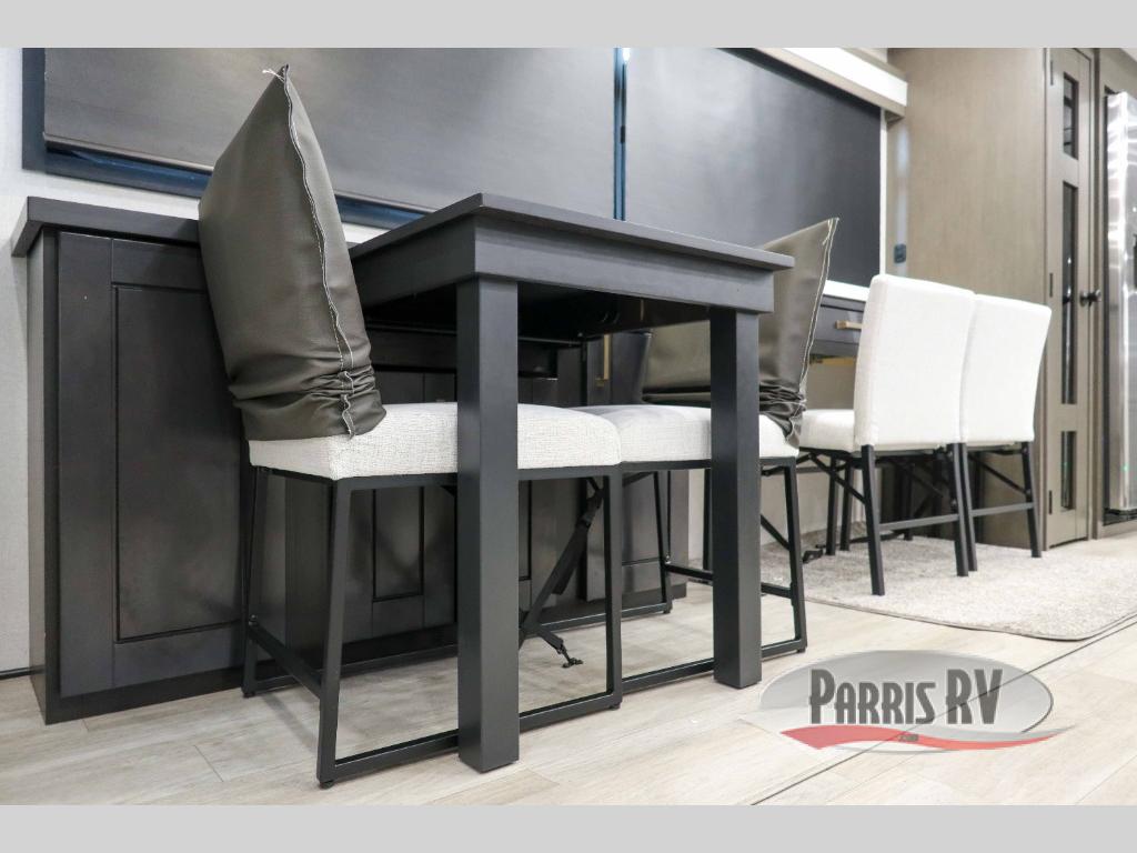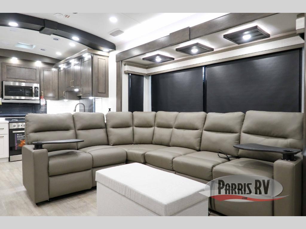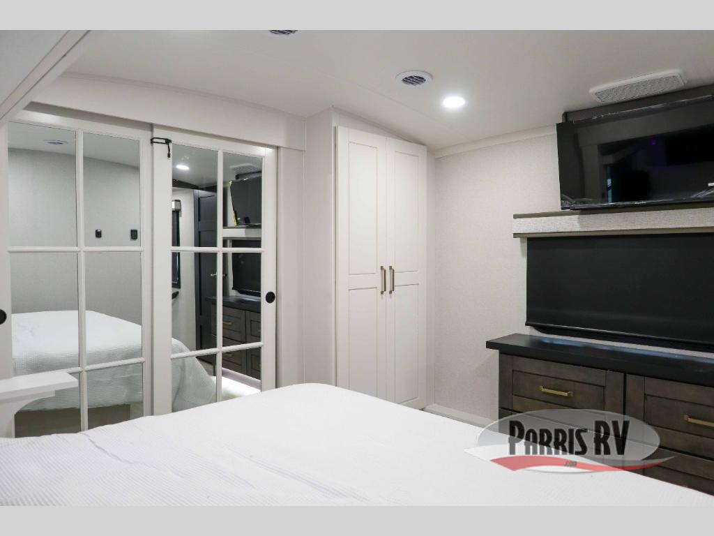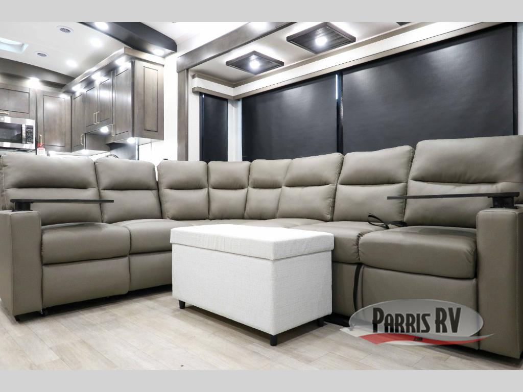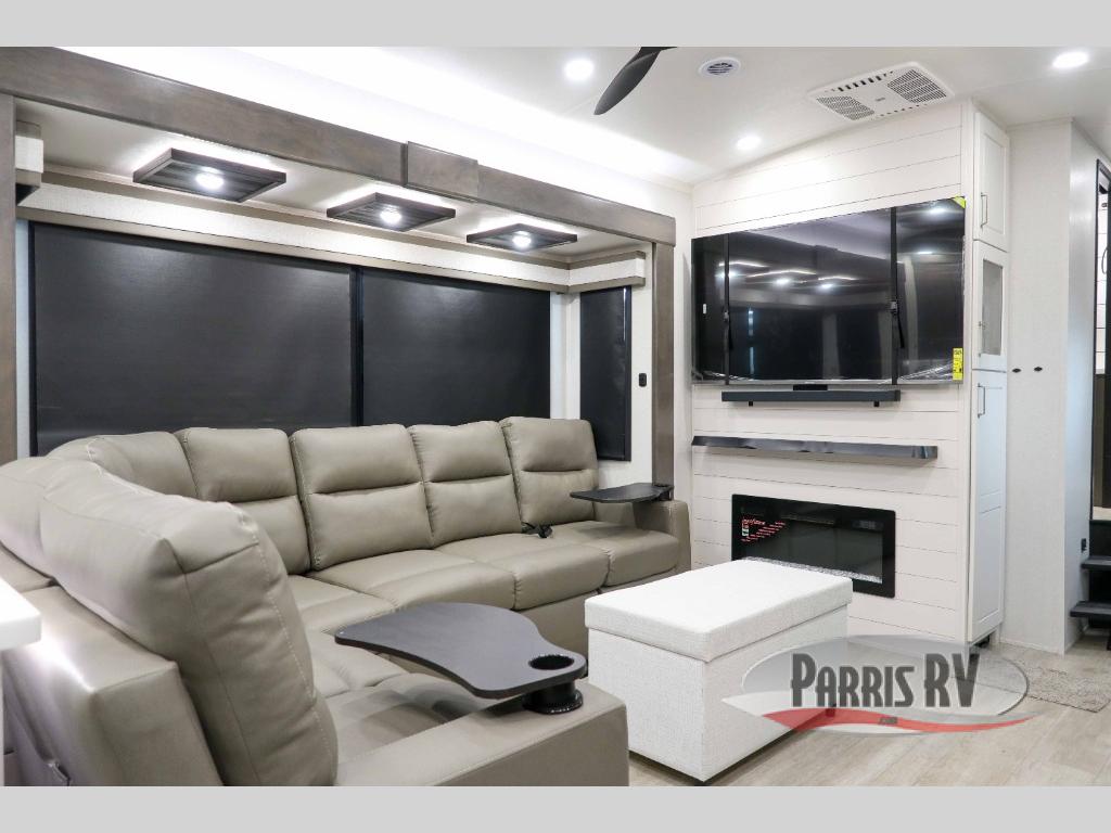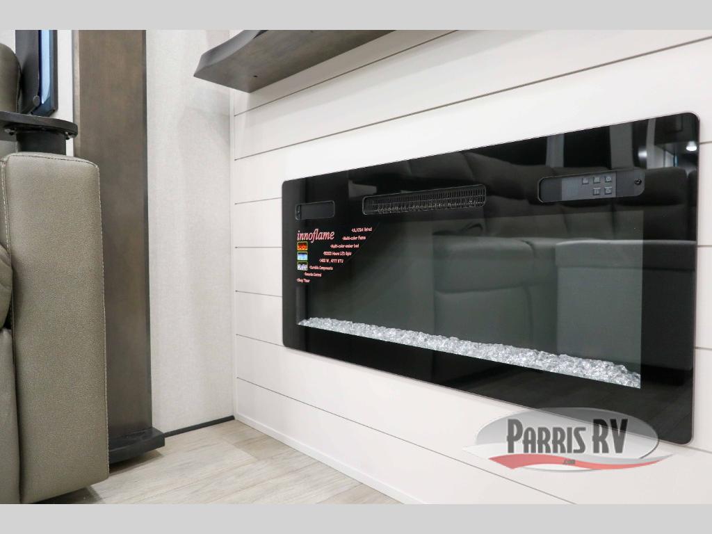 At the front of the 36RK model we have the spacious bedroom featuring a luxurious 72" x 80" king bed, providing ample room to relax and unwind after a long day. A wardrobe and dresser, complete with a TV mounted above, offer generous storage for clothing and personal essentials. Moving down the hall, the full bathroom includes a large 36" x 48" shower with a built-in seat for added comfort, as well as a linen closet for convenient storage. Toward the center and rear of the unit, the open living area expands with dual opposing slides, creating an inviting and comfortable space. One slide houses a 100" L-shaped sofa and theater seating across from the entertainment center with a cozy fireplace, perfect for relaxing evenings. The opposite slide features a pull-out table ideal for dining or game nights, alongside a versatile desk and coffee bar. This same slide also includes a 21-cu. ft. residential refrigerator and a shelved pantry for effortless organization. At the very rear, the U-shaped kitchen is designed for function and style, boasting solid-surface countertops, abundant overhead cabinets, a pull-out pantry, and a pull-out cutting board making meal prep, cooking, and snacking both easy and enjoyable.