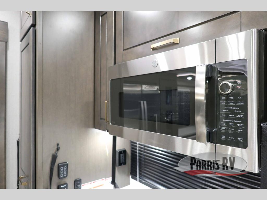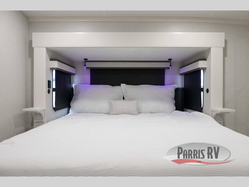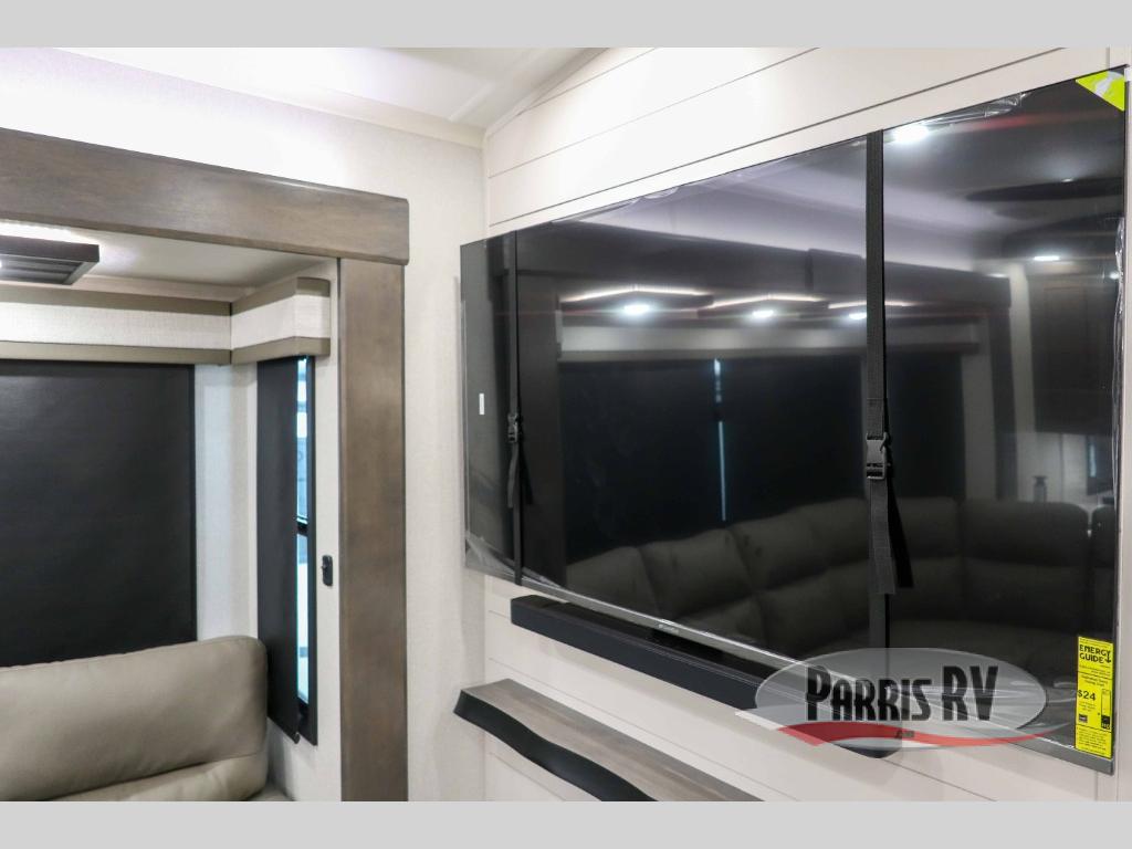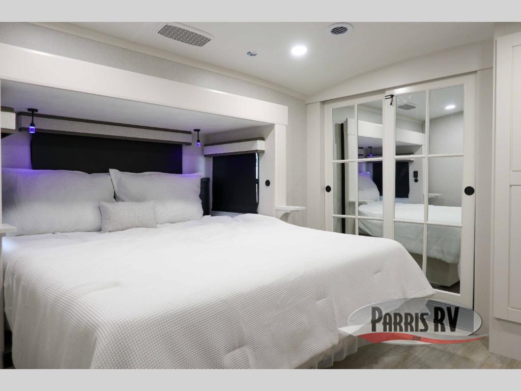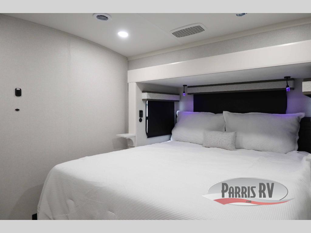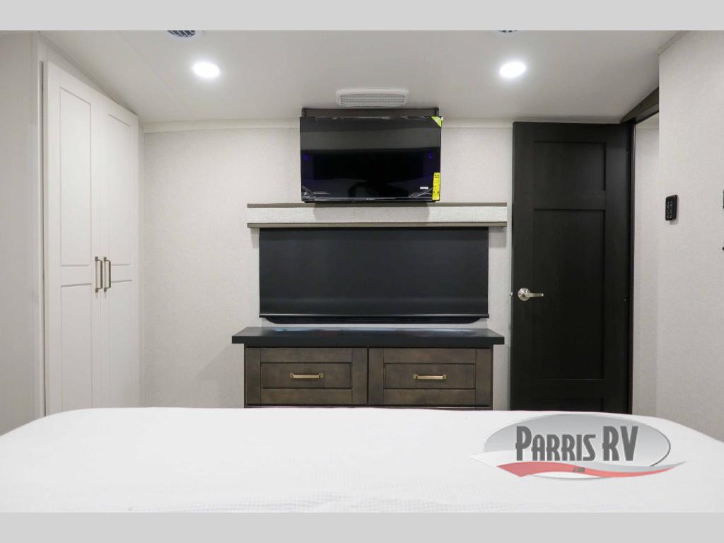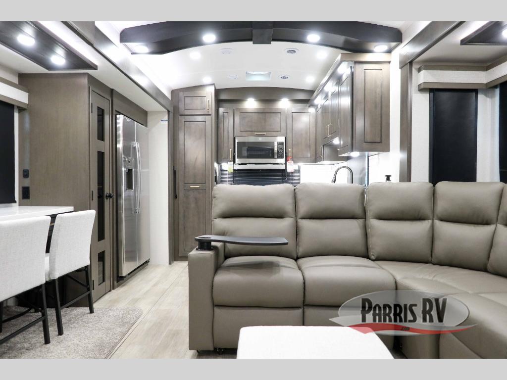At the front of the 36RK model we have the spacious bedroom featuring a luxurious 72" x 80" king bed, providing ample room to relax and unwind after a long day. A wardrobe and dresser, complete with a TV mounted above, offer generous storage for clothing and personal essentials. Moving down the hall, the full bathroom includes a large 36" x 48" shower with a built-in seat for added comfort, as well as a linen closet for convenient storage. Toward the center and rear of the unit, the open living area expands with dual opposing slides, creating an inviting and comfortable space. One slide houses a 100" L-shaped sofa and theater seating across from the entertainment center with a cozy fireplace, perfect for relaxing evenings. The opposite slide features a pull-out table ideal for dining or game nights, alongside a versatile desk and coffee bar. This same slide also includes a 21-cu. ft. residential refrigerator and a shelved pantry for effortless organization. At the very rear, the U-shaped kitchen is designed for function and style, boasting solid-surface countertops, abundant overhead cabinets, a pull-out pantry, and a pull-out cutting board making meal prep, cooking, and snacking both easy and enjoyable.