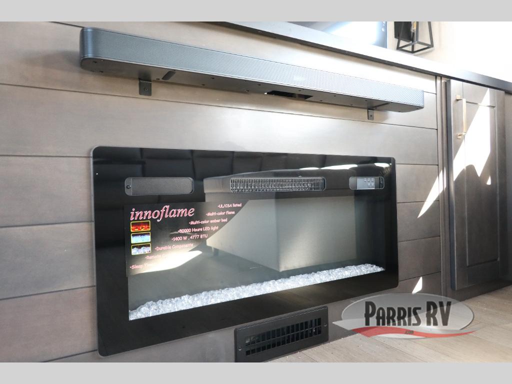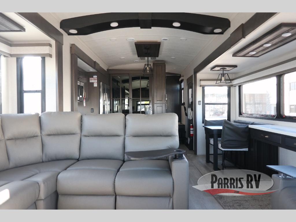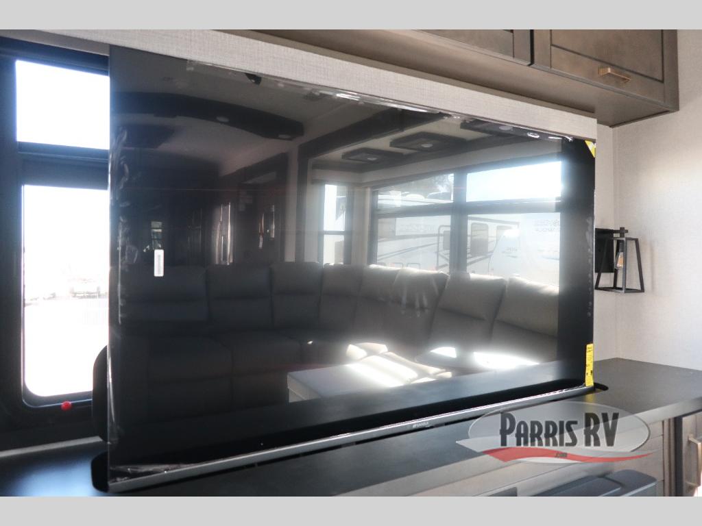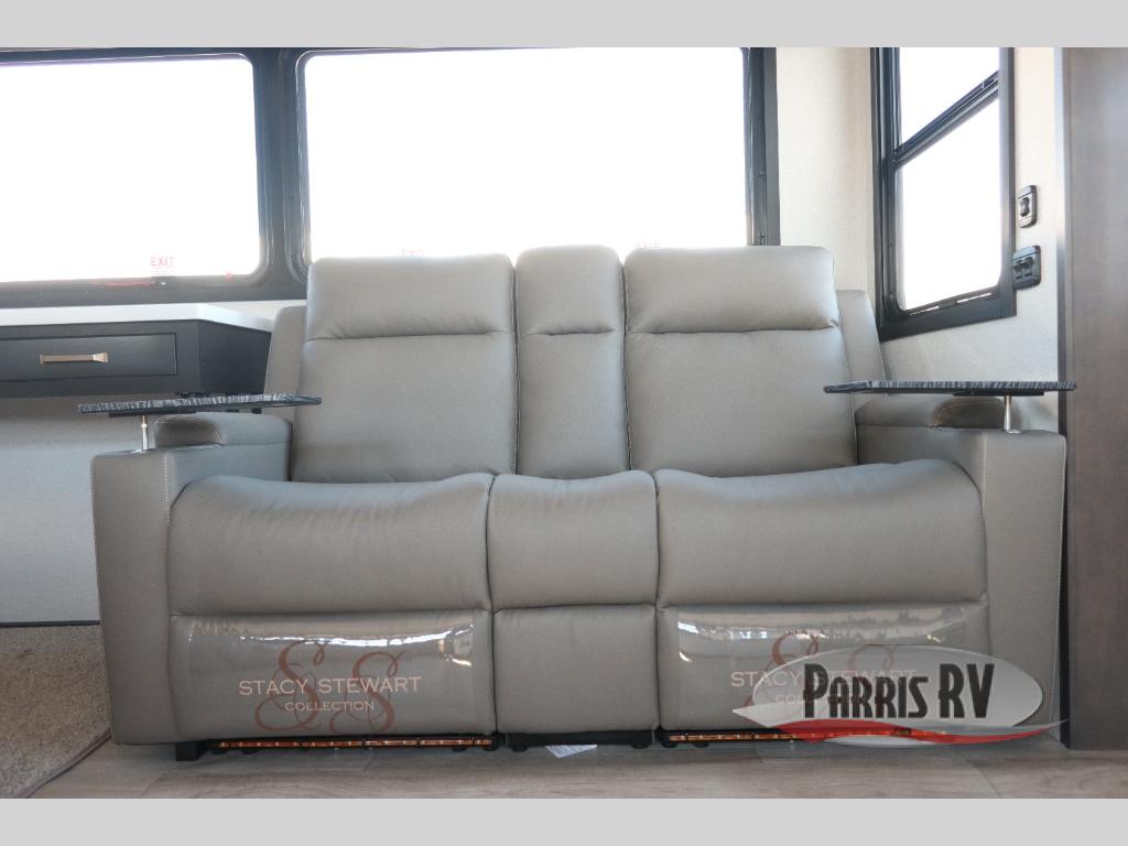 At the front of this 38RE layout, you’ll find a private bedroom featuring a spacious 72" x 80" king bed slide-out, creating a comfortable retreat to rest and recharge. The room also includes a wardrobe and dresser with a TV above, providing ample storage for clothing and essentials. Moving down the hall, the full bathroom offers both comfort and convenience with its 36" x 48" shower complete with a built-in seat for accessibility, plus linen shelves for added storage. At the heart of the unit, the kitchen is thoughtfully designed with everything needed to cook in comfort, including a pantry, a pull-out cutting board in the island, and a 21-cu. ft. refrigerator. Meal preparation is a breeze with the 24" range or the convection microwave featuring a built-in air fryer. Across from the kitchen, the large slide-out hosts a roll-out table perfect for dining or game nights, as well as a desk/coffee bar and cozy theater seating. At the rear, the entertainment center stands out with a TV lift and fireplace, while the L-shaped lounge and additional theater seat create the ultimate space to relax and enjoy movie nights in style.