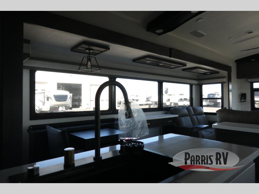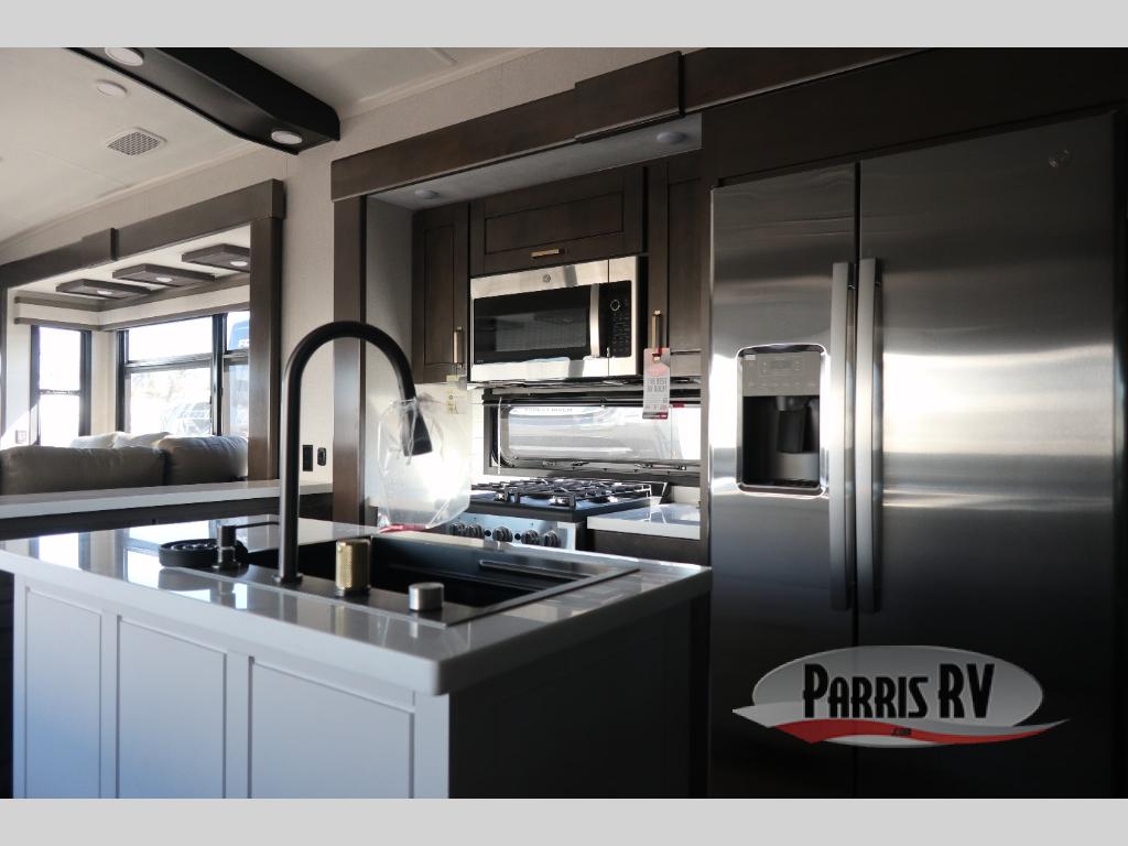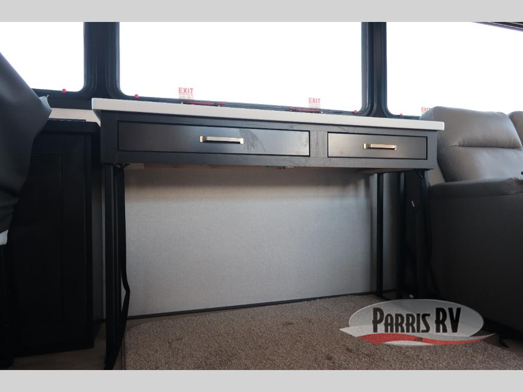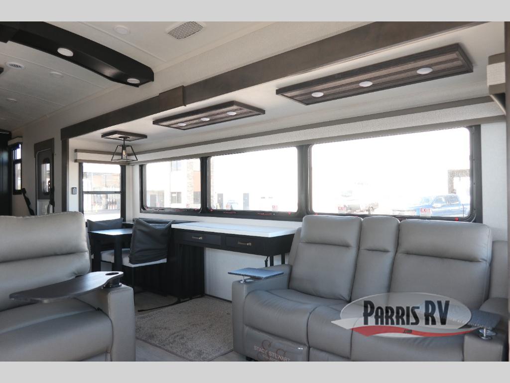 At the front of this 38RE layout, you’ll find a private bedroom featuring a spacious 72" x 80" king bed slide-out, creating a comfortable retreat to rest and recharge. The room also includes a wardrobe and dresser with a TV above, providing ample storage for clothing and essentials. Moving down the hall, the full bathroom offers both comfort and convenience with its 36" x 48" shower complete with a built-in seat for accessibility, plus linen shelves for added storage. At the heart of the unit, the kitchen is thoughtfully designed with everything needed to cook in comfort, including a pantry, a pull-out cutting board in the island, and a 21-cu. ft. refrigerator. Meal preparation is a breeze with the 24" range or the convection microwave featuring a built-in air fryer. Across from the kitchen, the large slide-out hosts a roll-out table perfect for dining or game nights, as well as a desk/coffee bar and cozy theater seating. At the rear, the entertainment center stands out with a TV lift and fireplace, while the L-shaped lounge and additional theater seat create the ultimate space to relax and enjoy movie nights in style.