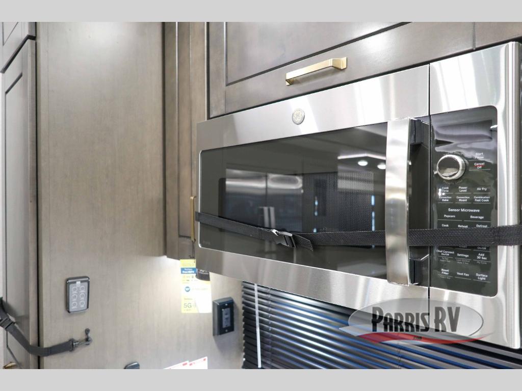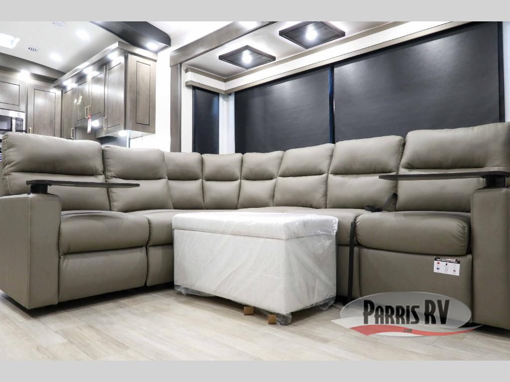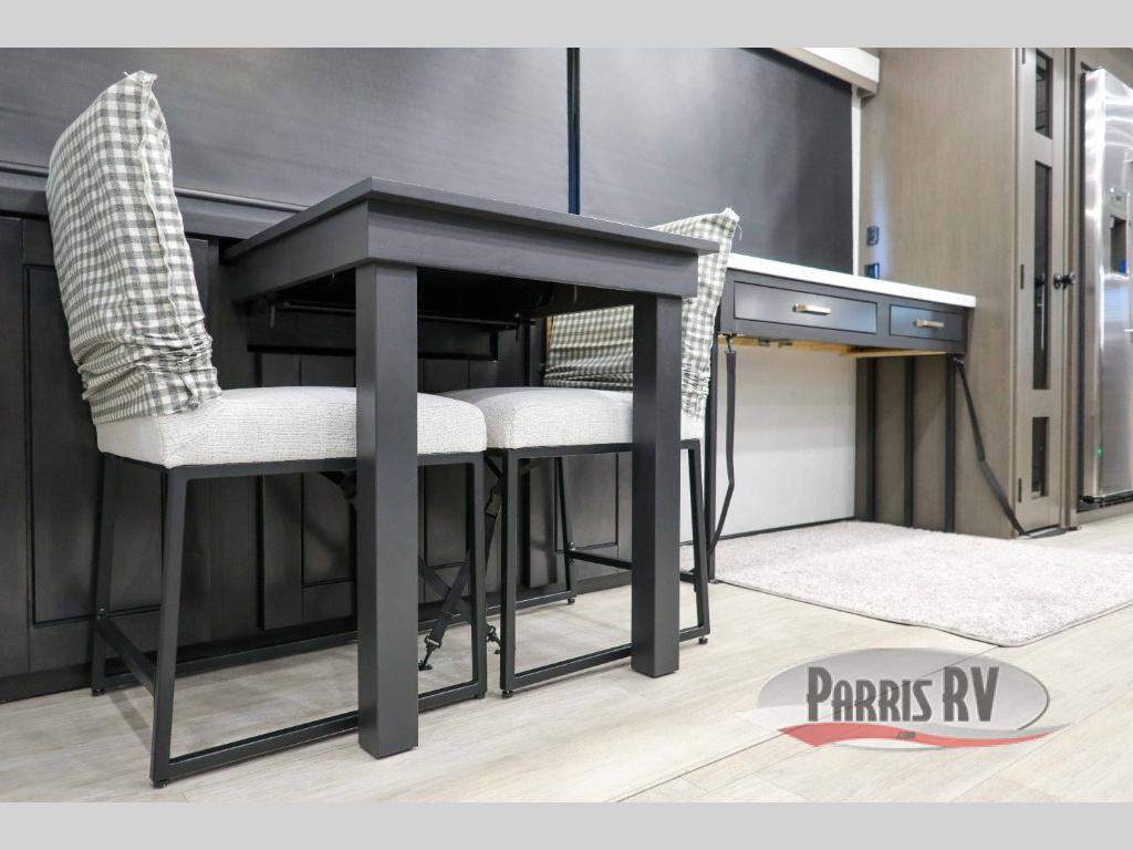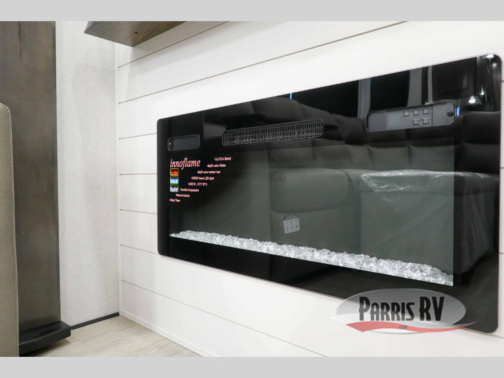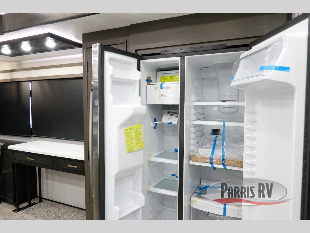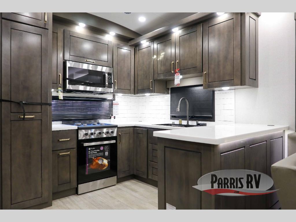 Starting from the back, this impressive 39RK features a rear kitchen designed in a convenient U-shape for easy accessibility and efficient meal prep. The kitchen is fully equipped with plenty of overhead cabinets, a convection microwave with an air fryer, a 24" range, and a pull-out pantry, perfect for the chef on the trip to cook in comfort. Across the kitchen, the large slide-out houses a 21-cu. ft. refrigerator and a second pantry with shelves, providing even more space to store groceries, snacks, and coffee essentials. The nearby desk/coffee bar and roll-out table create an inviting area to enjoy meals or unwind with a cup of coffee. The living area offers a spacious 100" L-shaped sofa and a theater seat facing the TV and fireplace, making it an ideal spot for relaxing or hosting movie nights. Moving forward, you’ll find a convenient half bathroom with linen shelves for added storage and accessibility. At the front, the private bedroom features a 72" x 80" king bed in a slide-out with a dresser across for ample storage. Finally, the full bathroom at the very front includes a 30" x 61" shower with a seat for comfort, a large sink, and a walk-in closet that provides generous space for all your clothing and gear.