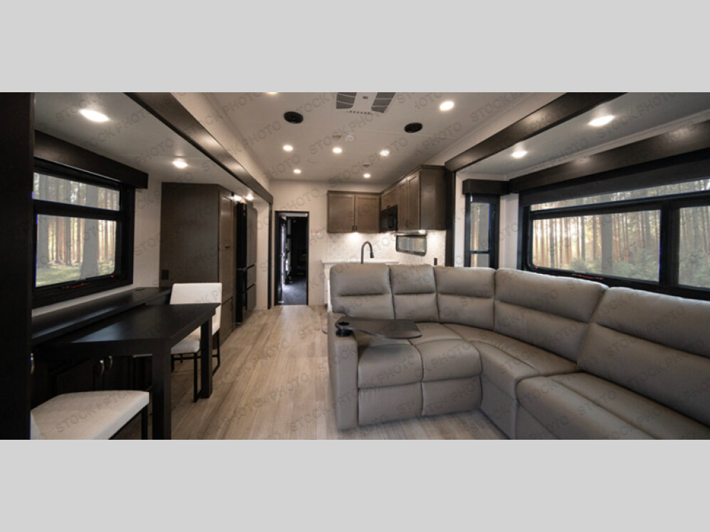 The 13' 6" garage is the perfect space for your toys, with enough room for your ATV, motorcycle, or other gear. Plus, the electric queen bed provides a comfortable spot to rest after a long day. The overhead loft with storage provides additional space for your gear, keeping it out of the way but still accessible. The kitchen is fully equipped with a microwave, sink, overhead cabinets, pantry, and coffee bar. The L-shaped sofa provides ample seating for relaxation, and the TV is perfectly positioned for viewing. The full bathroom is a welcome convenience, providing a private space to freshen up. Also, the front bedroom is a luxurious retreat, featuring a king bed, a walk-in closet, and drawers, and on the exterior, the two entry/exit doors provide easy access to the outside, making it perfect for loading and unloading your gear.