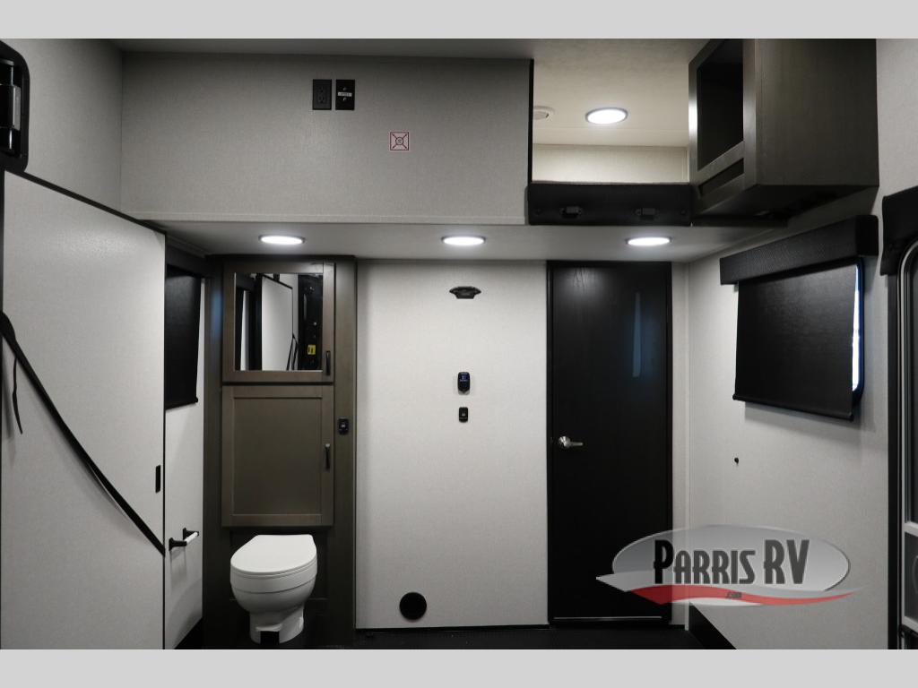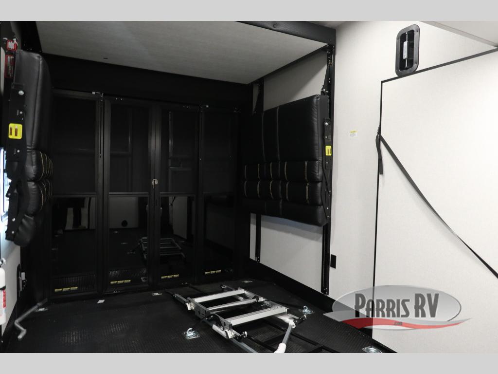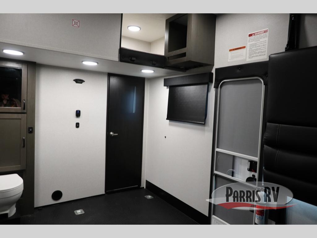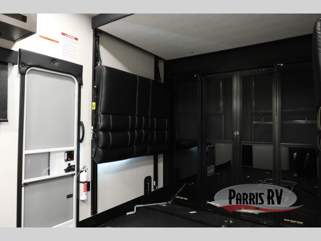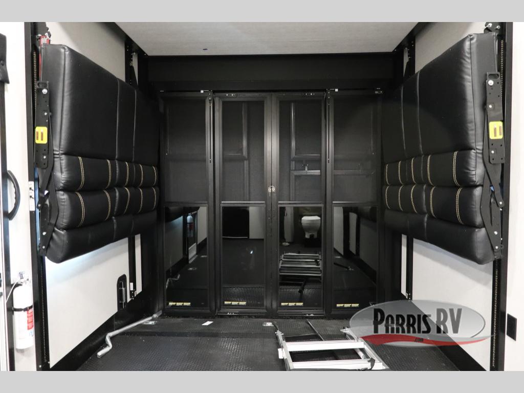 The 13' 6" garage is the perfect space for your toys, with enough room for your ATV, motorcycle, or other gear. Plus, the electric queen bed provides a comfortable spot to rest after a long day. The overhead loft with storage provides additional space for your gear, keeping it out of the way but still accessible. The kitchen is fully equipped with a microwave, sink, overhead cabinets, pantry, and coffee bar. The L-shaped sofa provides ample seating for relaxation, and the TV is perfectly positioned for viewing. The full bathroom is a welcome convenience, providing a private space to freshen up. Also, the front bedroom is a luxurious retreat, featuring a king bed, a walk-in closet, and drawers, and on the exterior, the two entry/exit doors provide easy access to the outside, making it perfect for loading and unloading your gear.