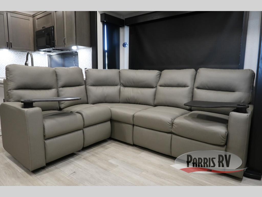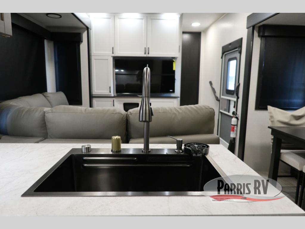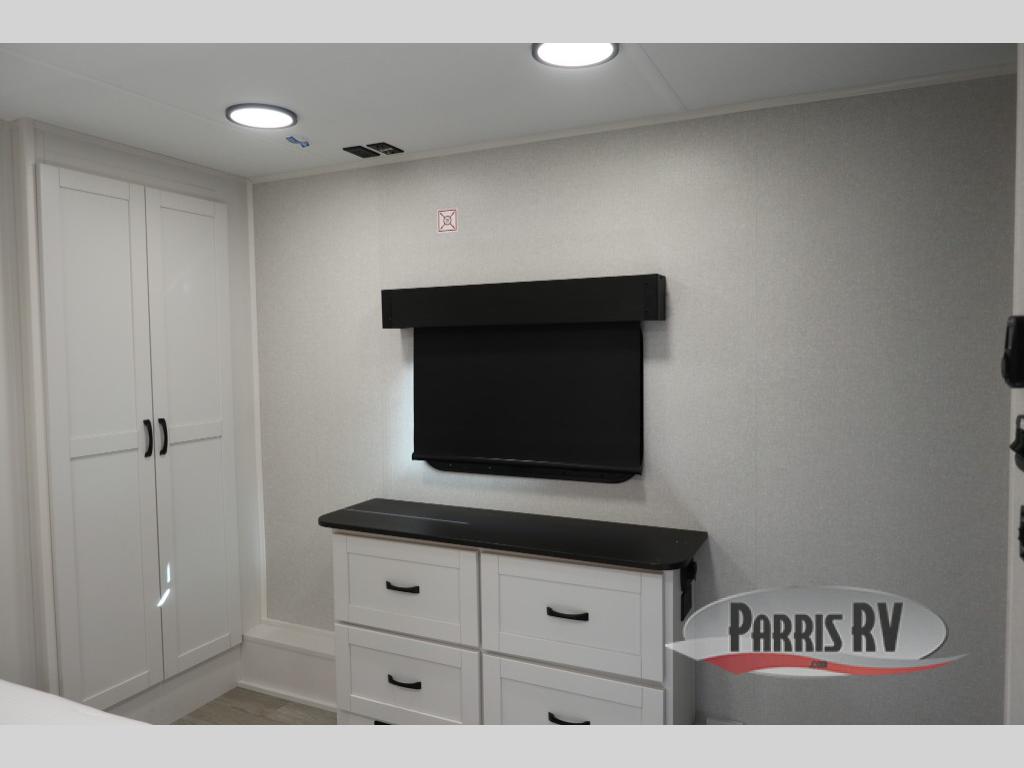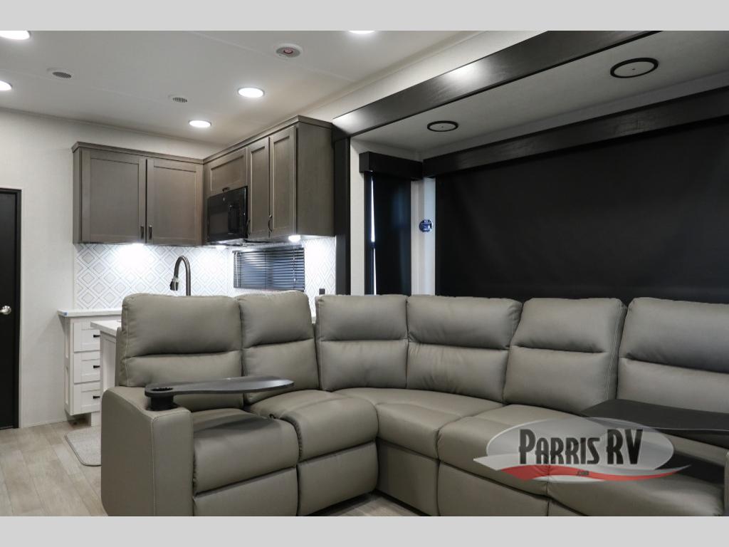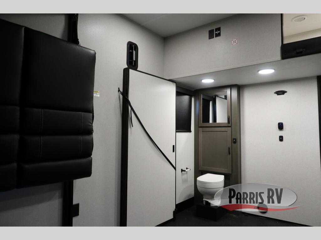 The 13' 6" garage is the perfect space for your toys, with enough room for your ATV, motorcycle, or other gear. Plus, the electric queen bed provides a comfortable spot to rest after a long day. The overhead loft with storage provides additional space for your gear, keeping it out of the way but still accessible. The kitchen is fully equipped with a microwave, sink, overhead cabinets, pantry, and coffee bar. The L-shaped sofa provides ample seating for relaxation, and the TV is perfectly positioned for viewing. The full bathroom is a welcome convenience, providing a private space to freshen up. Also, the front bedroom is a luxurious retreat, featuring a king bed, a walk-in closet, and drawers, and on the exterior, the two entry/exit doors provide easy access to the outside, making it perfect for loading and unloading your gear.