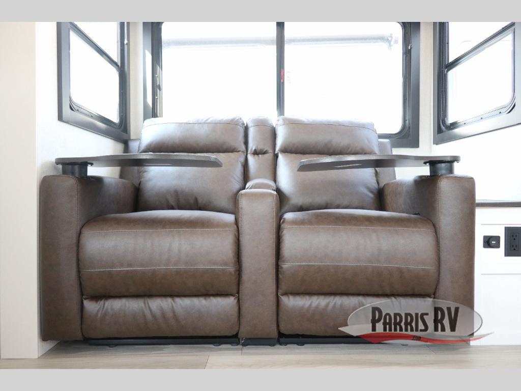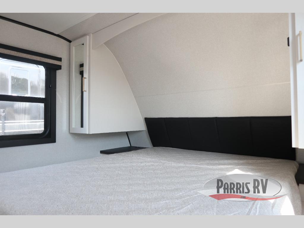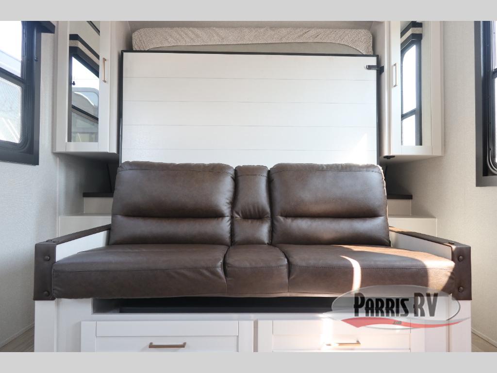 Once you step inside, you'll be welcomed by a thoughtfully designed front bedroom area featuring a 60" x 75" queen murphy bed, which conveniently converts into a 60" jack knife sofa, perfect for relaxing or hosting guests. On each side of the bed, you'll find a wardrobe and nightstand to store all your essentials within arm's reach. Moving into the slide-out, there's a cozy 60" theater seat equipped with table trays for comfortable dining or lounging, along with a storage compartment ideal for stashing board games or travel extras. Directly across, the kitchen stretches nearly the full length of the trailer wall, boasting a stainless-steel single basin sink with a high-rise pullout faucet and a butcher block cutting board, plus an 11-cu. ft. refrigerator to keep all your groceries fresh. Tucked into the rear corner is a full bathroom complete with a 30" x 36" shower, a medicine cabinet, and a porcelain foot flush toilet, offering the convenience and comfort of home without relying on campsite facilities.