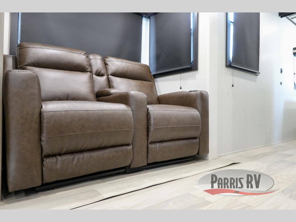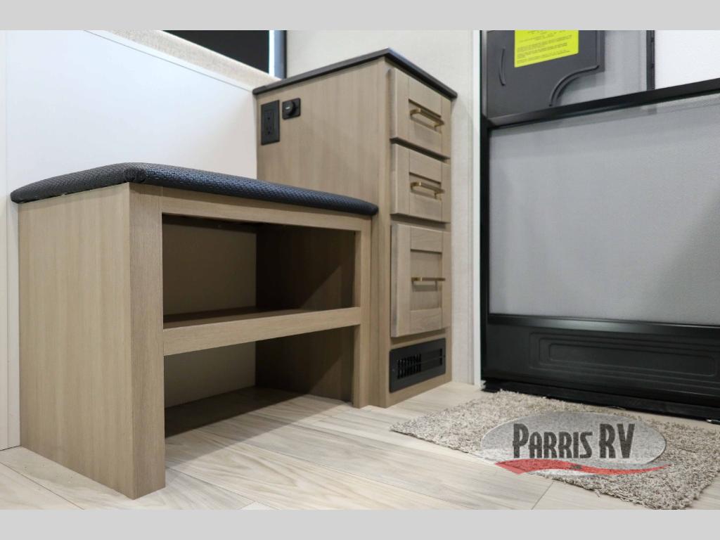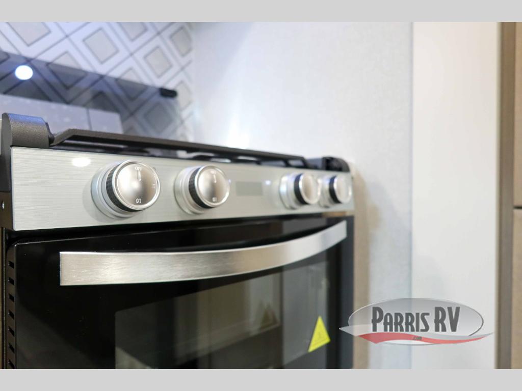 At the front of this travel trailer, you'll find a private bedroom featuring a spacious 60" x 80" queen bed, complete with pull-out nightstands and wardrobes on each side for convenient storage of clothes and essentials. One of the two entry doors is located here, providing added privacy and easy access. Moving down the hall, the full bathroom offers a 30" x 36" shower, a porcelain foot-flush toilet, and a linen cabinet to keep towels and hygiene items neatly organized. In the main living area, you can enjoy meals or game nights at the 38" x 68" booth dinette, while the 60" theater seat in the slide-out provides a cozy spot to relax. At the rear, the kitchen spans the full width of the trailer and includes a stainless-steel single-basin sink with a high-rise pullout faucet and butcher block cutting board, a three-burner range, and generous seamless countertops. Also, in the slide-out are a pantry and an 11-cu. ft. refrigerator, giving you plenty of room to store food, snacks, and leftovers for the whole trip. The second entry door is located in between the kitchen and dinette for your convenience.