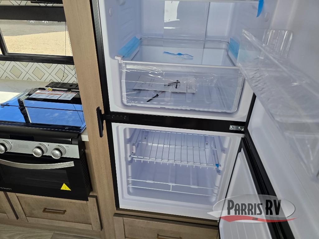 At the front of this travel trailer, you'll find a private bedroom featuring a 60" x 80" queen bed for a restful night’s sleep, in between nightstands on each side for added convenience. Moving into the center of the trailer, the main living area offers a spacious slide-out with a 60" tri-fold sofa perfect for lounging, and a 40" x 70" dinette ideal for meals, game nights, or gathering with friends and family—both of which convert into extra-sleeping space if needed. Across from the slide, the L-shaped kitchen is thoughtfully designed for ease and efficiency, featuring a stainless steel sink on one end, seamless countertop space for prepping meals, a three-burner range, and an 11 cu. ft. refrigerator for all your cooking essentials. Just beside the refrigerator is the entertainment center, with a walk-in pantry tucked behind it to store all your dry goods and snacks. At the rear, the full bathroom provides generous counter space, making it easy and comfortable to get ready each day.