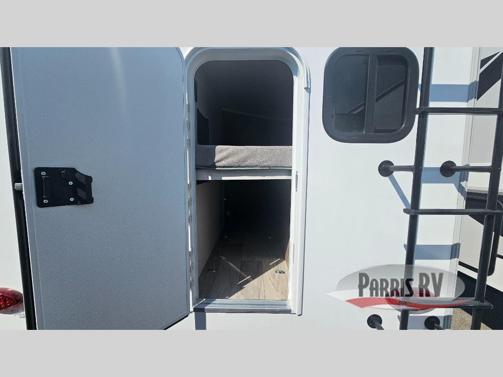 At the front of this trailer, you'll find a private bedroom featuring a 60" x 80" queen bed, complete with pull-out nightstands on each side for storing your essentials. This bedroom also includes one of the two convenient entry doors. In the center of the trailer, a spacious slide-out houses a 60" tri-fold sofa for relaxing, along with a roomy 40" x 82" U-dinette perfect for dining, game nights, or gathering with friends and family. Both the sofa and dinette convert into additional sleeping space when needed. Across from the slide is a fully equipped kitchen with a stainless-steel sink, 11 cu. ft. refrigerator, microwave, and overhead cabinets, plus a walk-in pantry offering plenty of room for snacks and dry goods. In the rear, one corner features two bunks with flip-up storage and a handy kayak door for easy gear access. The opposite corner holds a full bathroom with a 30" x 36" shower, foot-flush toilet, and corner sink. Just next the bunks is the second entry door, adding extra convenience for busy camping days.