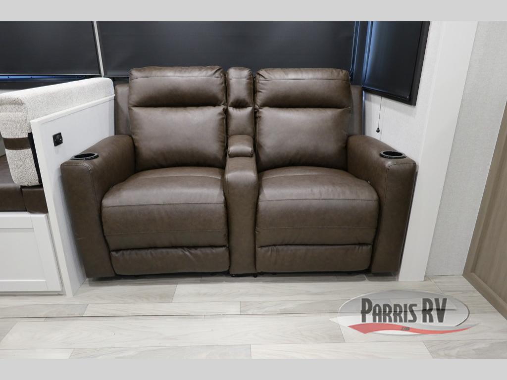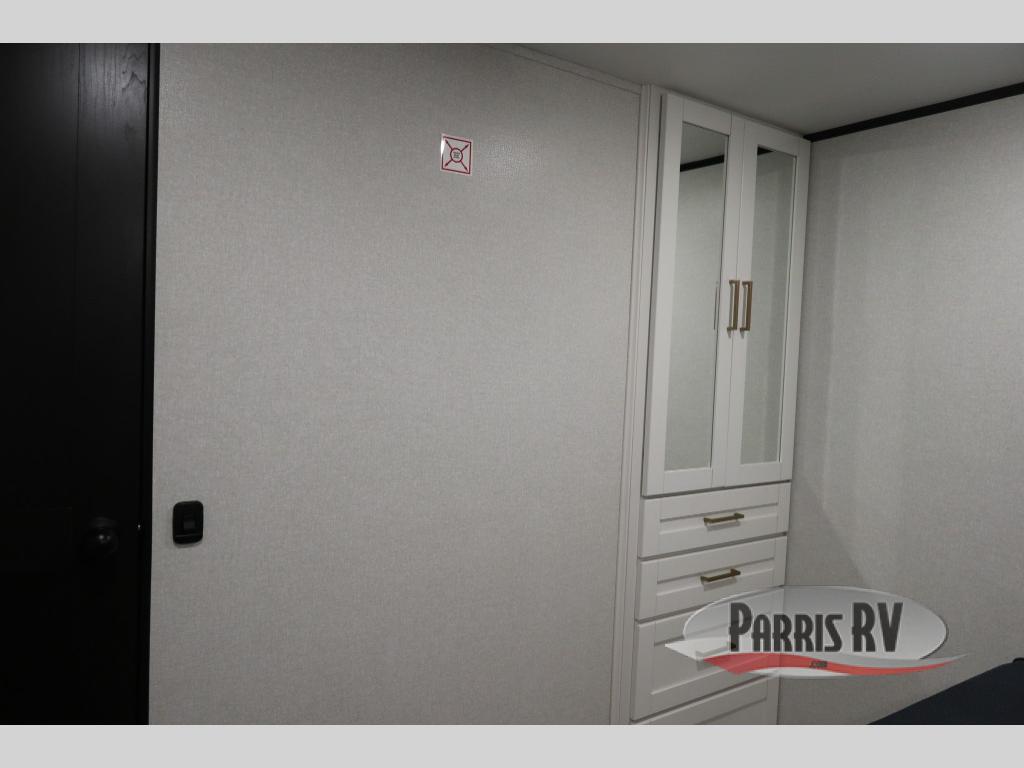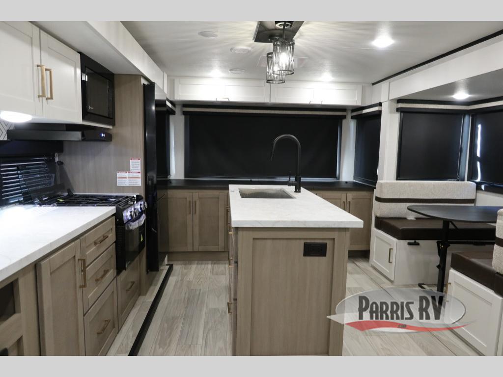 At the front, you'll find a private bedroom featuring a spacious 60" x 80" queen bed, in between nightstands on each side and overhead cabinets for convenient storage of your essentials. Moving down the hall, the full bathroom offers a 30" x 36" shower, a linen closet, and a medicine cabinet, perfect for keeping towels and skincare neatly organized. In the center of the space lies the kitchen and living area, enhanced by dual opposing slides that significantly open up the room for added comfort and functionality. One slide houses a 40" x 70" dinette ideal for meals or game nights, while a 60" tri-fold sofa provides a cozy lounging area, with both converting into additional sleeping space when needed. Centrally located, the kitchen island includes a sleek stainless-steel sink, while the opposing slide features a fully equipped kitchen with a three-burner cooktop, microwave, seamless countertops, and overhead cabinets for ample storage. For entertainment, a pop-up TV in the entertainment center ensures you can enjoy movie nights from the comfort of the sofa. At the rear, a dedicated desk with an ottoman creates a perfect nook for studying or working from home.