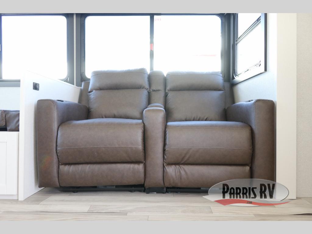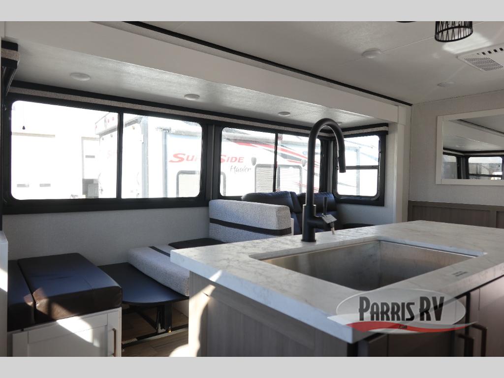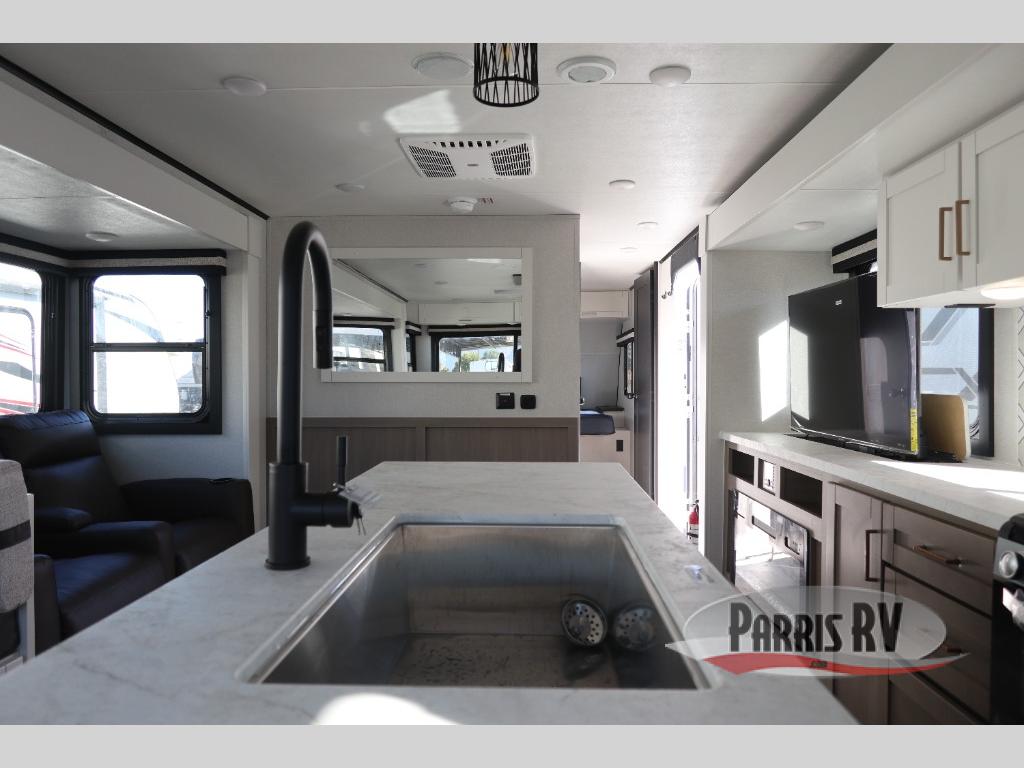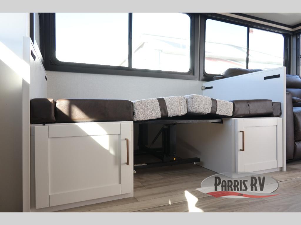 At the front, you'll find a private bedroom featuring a spacious 60" x 80" queen bed, in between nightstands on each side and overhead cabinets for convenient storage of your essentials. Moving down the hall, the full bathroom offers a 30" x 36" shower, a linen closet, and a medicine cabinet, perfect for keeping towels and skincare neatly organized. In the center of the space lies the kitchen and living area, enhanced by dual opposing slides that significantly open up the room for added comfort and functionality. One slide houses a 40" x 70" dinette ideal for meals or game nights, while a 60" tri-fold sofa provides a cozy lounging area, with both converting into additional sleeping space when needed. Centrally located, the kitchen island includes a sleek stainless-steel sink, while the opposing slide features a fully equipped kitchen with a three-burner cooktop, microwave, seamless countertops, and overhead cabinets for ample storage. For entertainment, a pop-up TV in the entertainment center ensures you can enjoy movie nights from the comfort of the sofa. At the rear, a dedicated desk with an ottoman creates a perfect nook for studying or working from home.