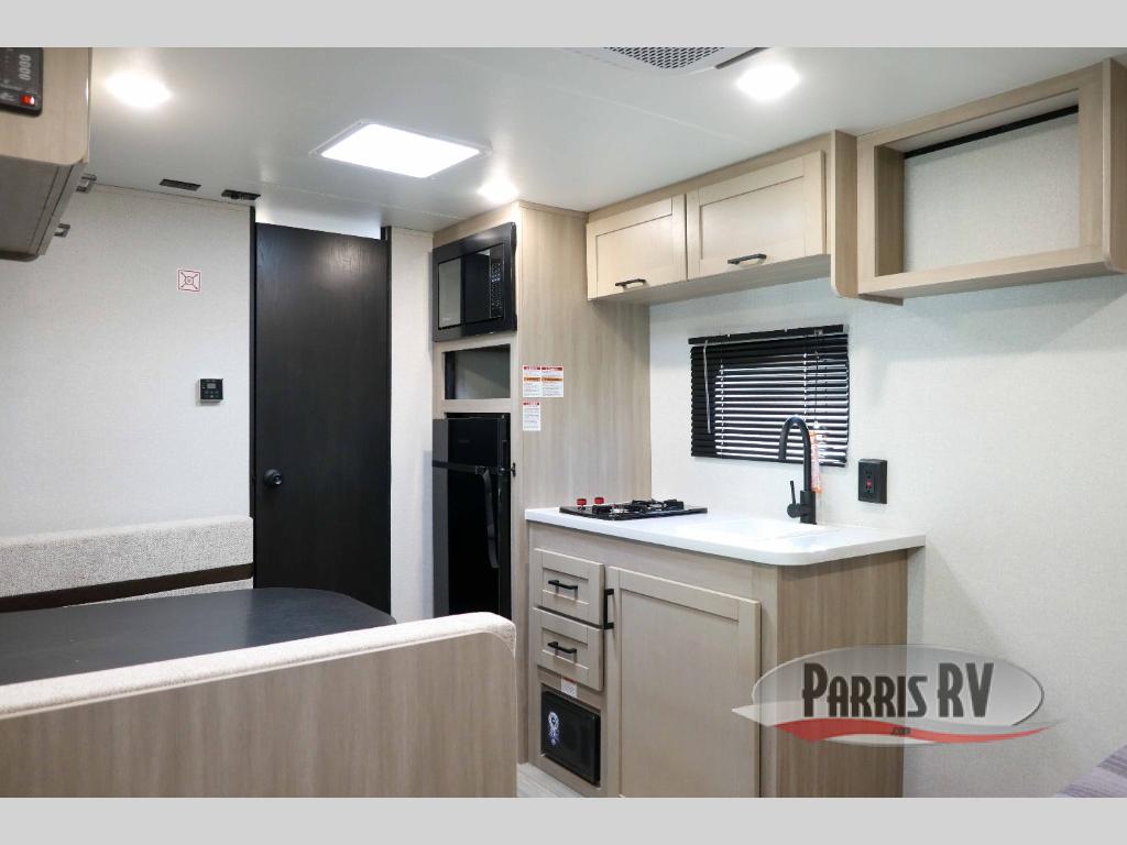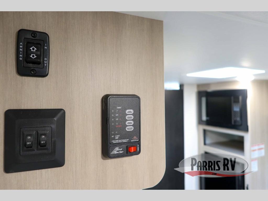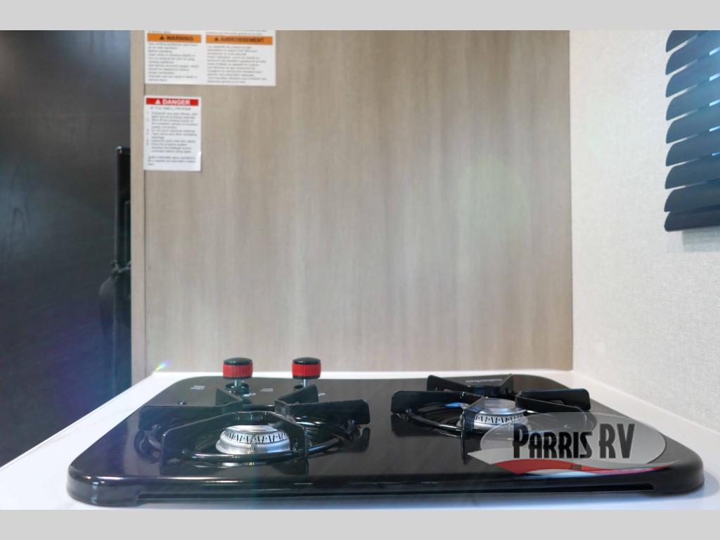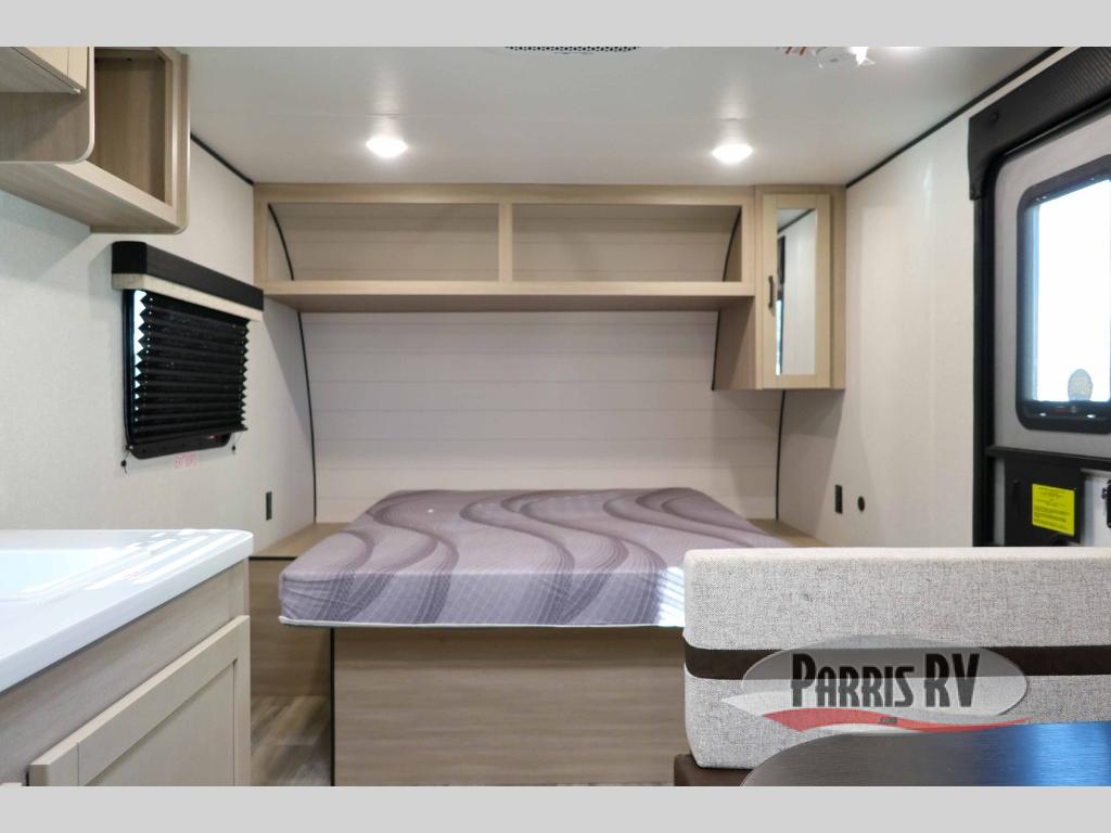 This travel trailer provides you with a little more privacy thanks to the rear bath, which also includes a bath linen closet and shelves for extra storage. The front bedroom includes a walk-around RV queen bed to make it easier to make the bed, and you'll find an overhead shelf for books or games. Once you've made lunch on the two-burner cooktop or in the microwave oven, you can dine at the booth dinette or take your plate outdoors to sit under the 10' power awning.