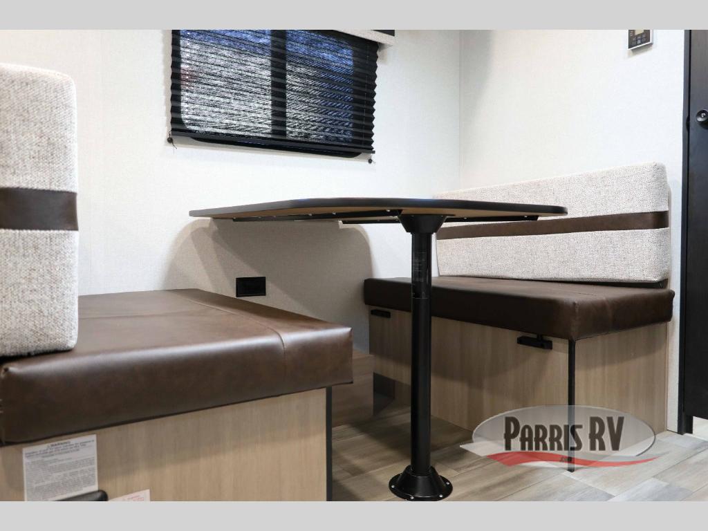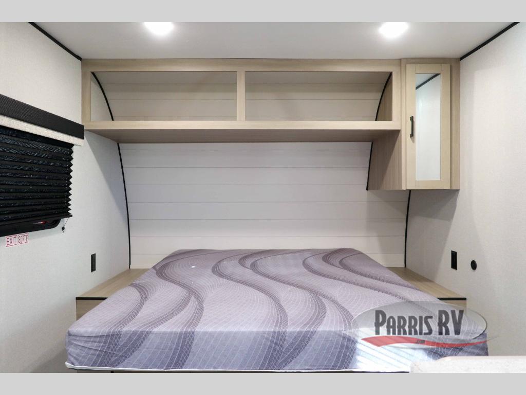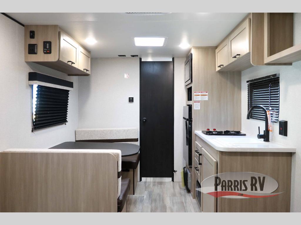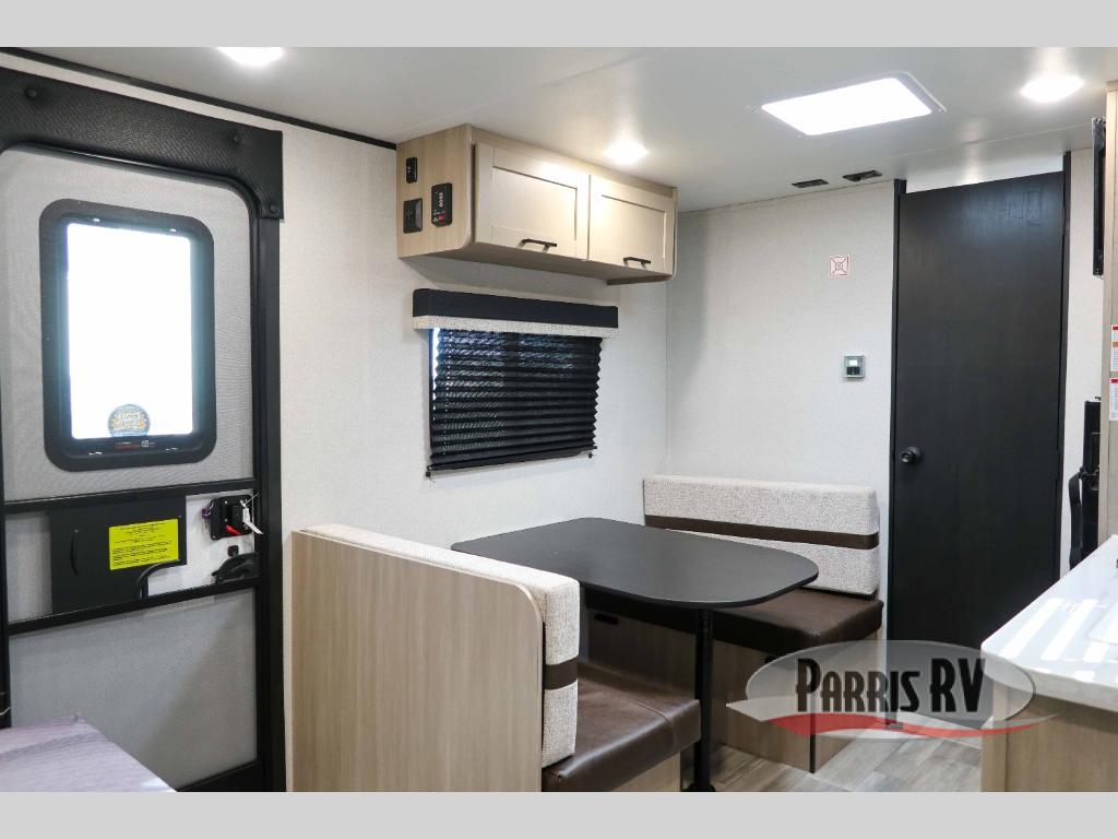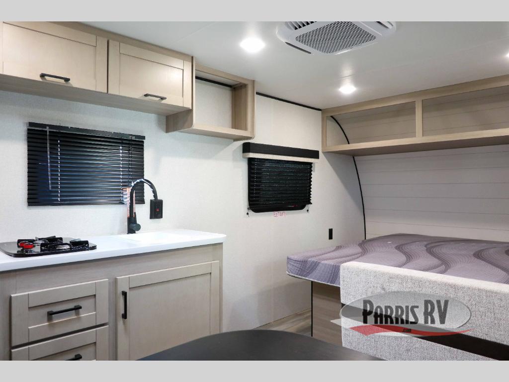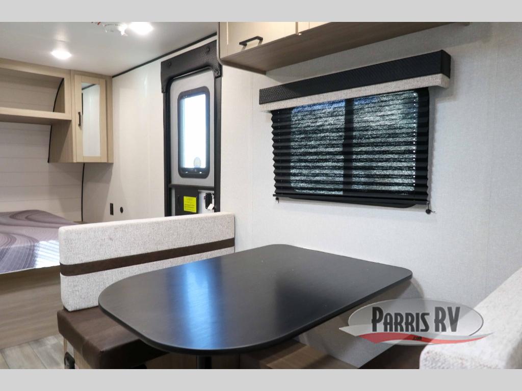 This travel trailer provides you with a little more privacy thanks to the rear bath, which also includes a bath linen closet and shelves for extra storage. The front bedroom includes a walk-around RV queen bed to make it easier to make the bed, and you'll find an overhead shelf for books or games. Once you've made lunch on the two-burner cooktop or in the microwave oven, you can dine at the booth dinette or take your plate outdoors to sit under the 10' power awning.