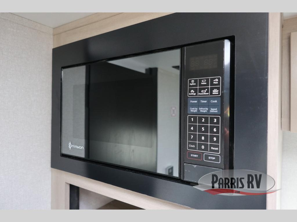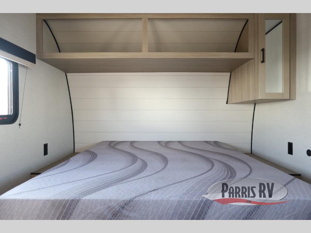 This travel trailer provides you with a little more privacy thanks to the rear bath, which also includes a bath linen closet and shelves for extra storage. The front bedroom includes a walk-around RV queen bed to make it easier to make the bed, and you'll find an overhead shelf for books or games. Once you've made lunch on the two-burner cooktop or in the microwave oven, you can dine at the booth dinette or take your plate outdoors to sit under the 10' power awning.