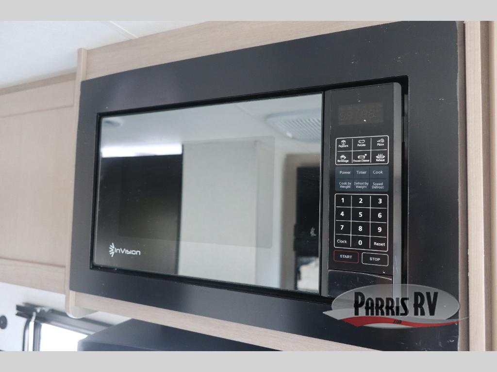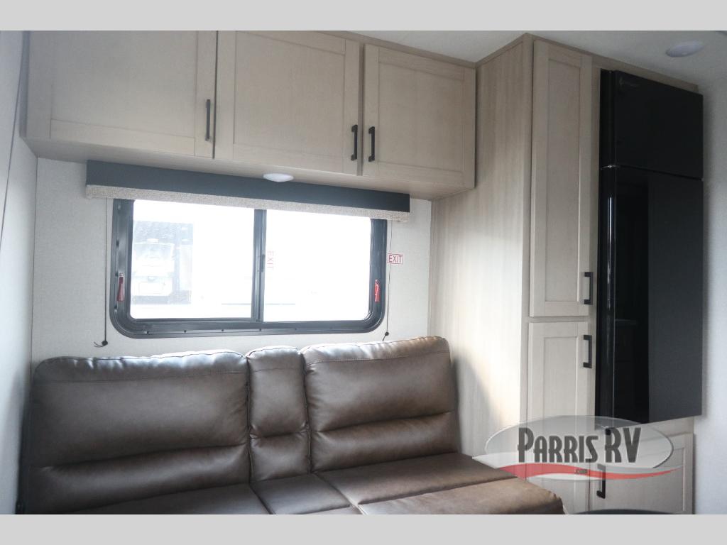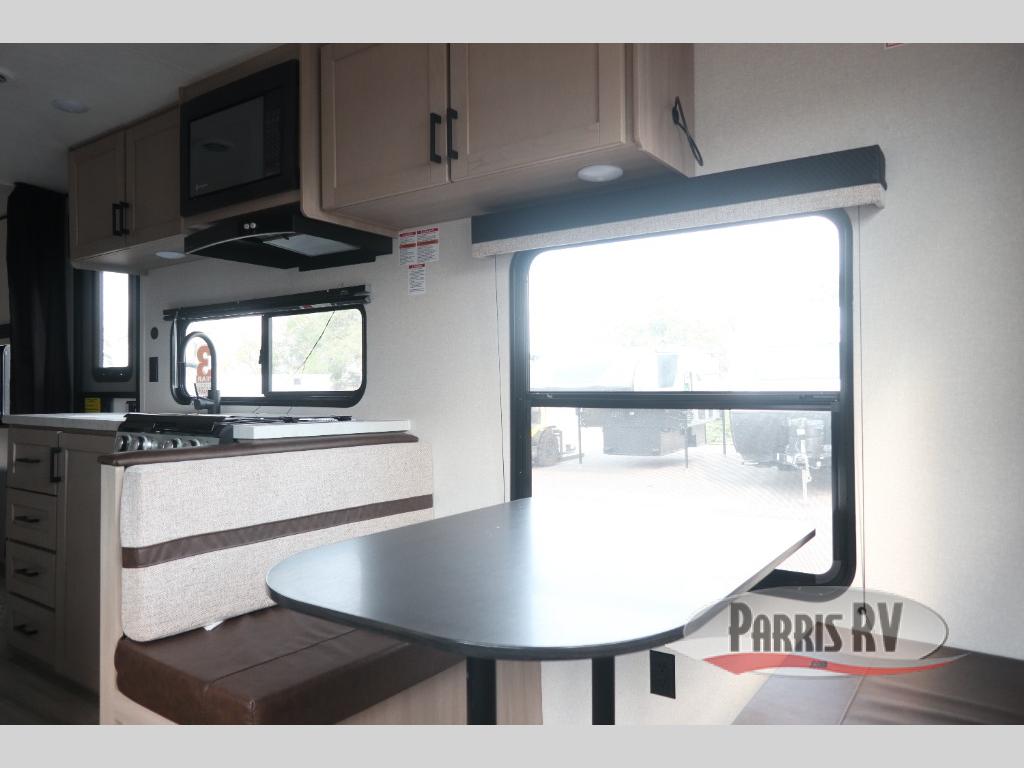 Weekend trips to the campground will be made unforgettable in this travel trailer for five to six. You will enjoy your own space in the front bedroom with a privacy curtain, RV queen bed and dual bedside wardrobes to keep your things tidy. If you have any guests staying over, then can convert the jack knife sofa and booth dinette back into seating spaces for breakfast in the morning. Speaking of breakfast, you'll have a three-burner cooktop and microwave oven to cook eggs and bacon, plus an 8-cu. ft. 12V refrigerator and pantry for food storage.