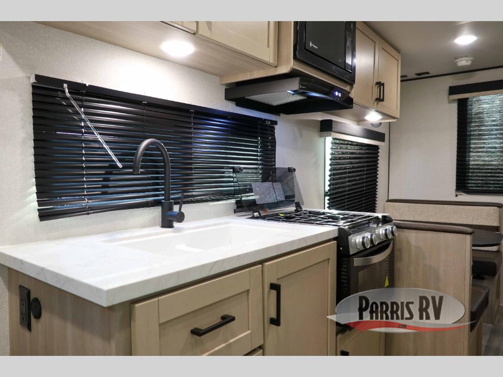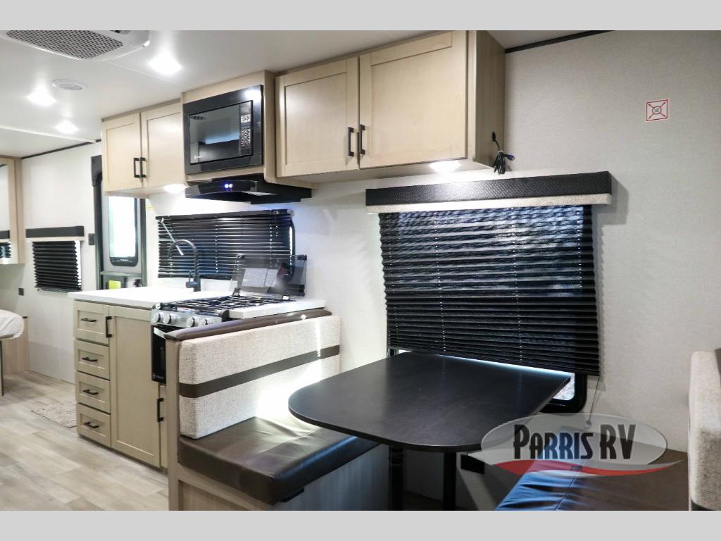 Weekend trips to the campground will be made unforgettable in this travel trailer for five to six. You will enjoy your own space in the front bedroom with a privacy curtain, RV queen bed and dual bedside wardrobes to keep your things tidy. If you have any guests staying over, then can convert the jack knife sofa and booth dinette back into seating spaces for breakfast in the morning. Speaking of breakfast, you'll have a three-burner cooktop and microwave oven to cook eggs and bacon, plus an 8-cu. ft. 12V refrigerator and pantry for food storage.