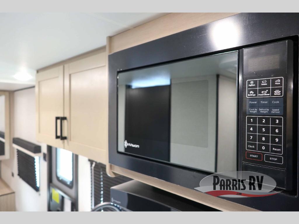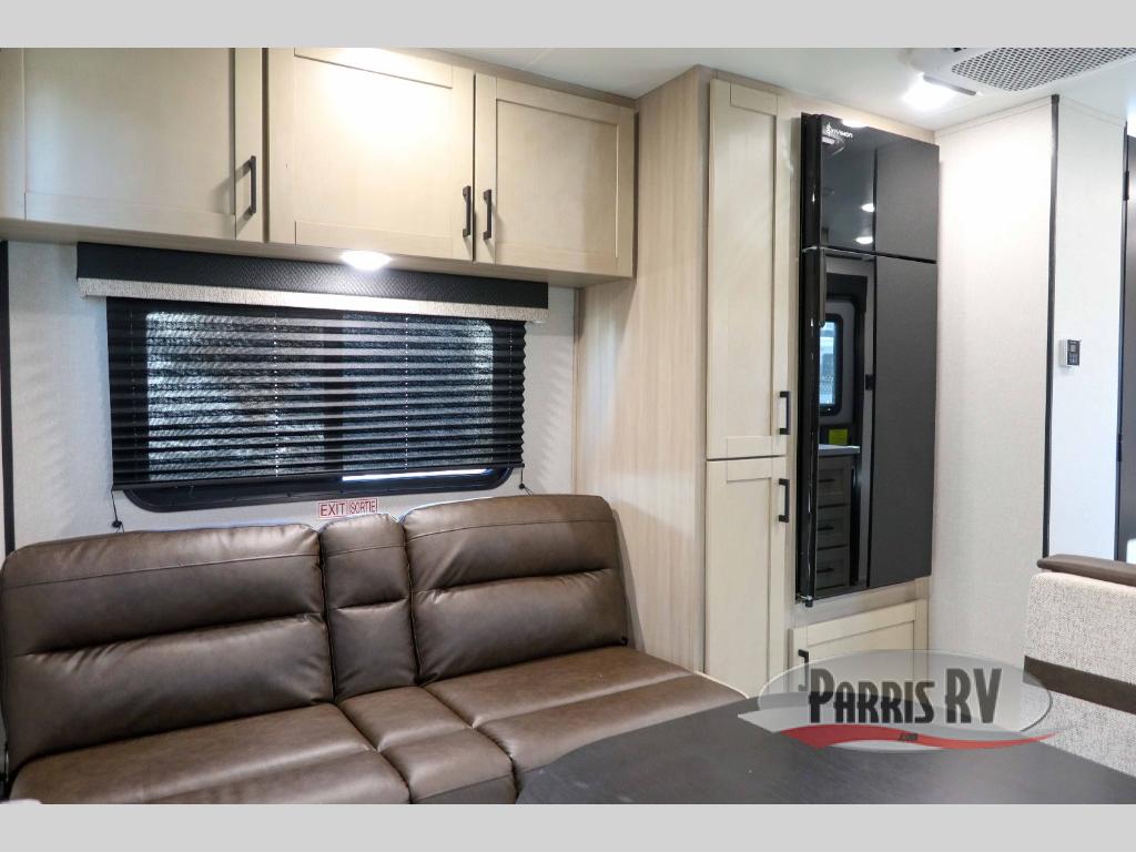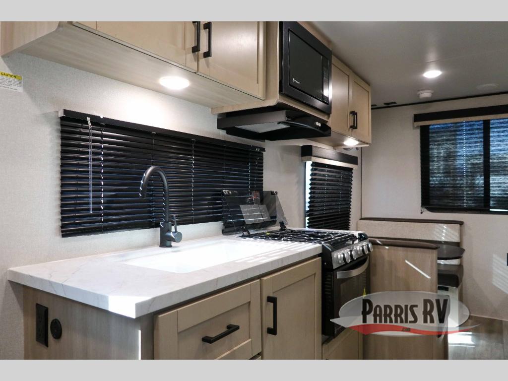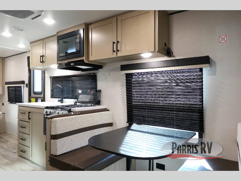 Weekend trips to the campground will be made unforgettable in this travel trailer for five to six. You will enjoy your own space in the front bedroom with a privacy curtain, RV queen bed and dual bedside wardrobes to keep your things tidy. If you have any guests staying over, then can convert the jack knife sofa and booth dinette back into seating spaces for breakfast in the morning. Speaking of breakfast, you'll have a three-burner cooktop and microwave oven to cook eggs and bacon, plus an 8-cu. ft. 12V refrigerator and pantry for food storage.