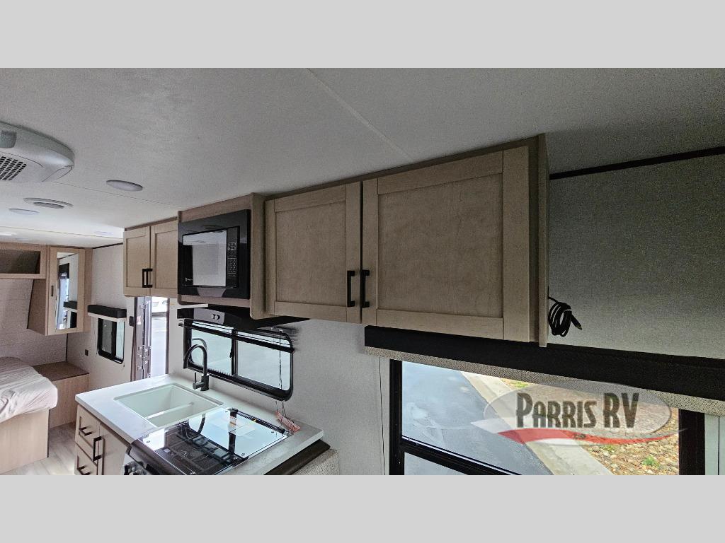 Weekend trips to the campground will be made unforgettable in this travel trailer for five to six. You will enjoy your own space in the front bedroom with a privacy curtain, RV queen bed and dual bedside wardrobes to keep your things tidy. If you have any guests staying over, then can convert the jack knife sofa and booth dinette back into seating spaces for breakfast in the morning. Speaking of breakfast, you'll have a three-burner cooktop and microwave oven to cook eggs and bacon, plus an 8-cu. ft. 12V refrigerator and pantry for food storage.